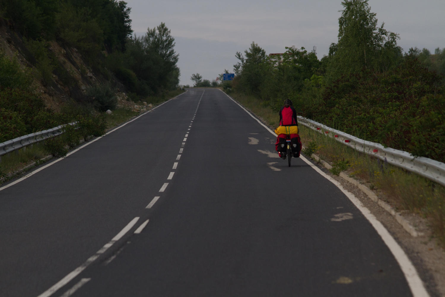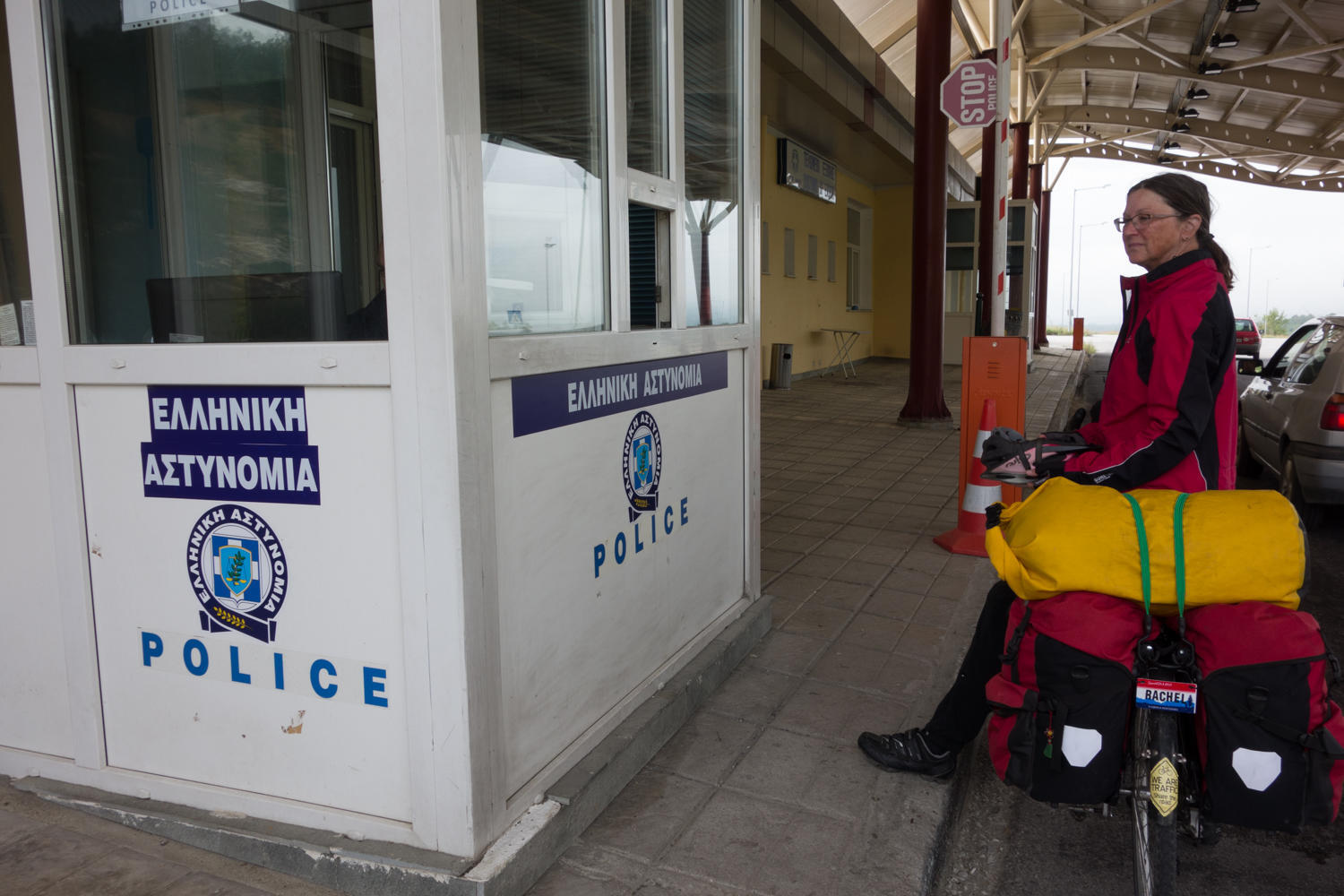 We had a short climb from the valley and then a final 300 meter climb to the Bulgarian-Greece border. We get our exit stamp from Bulgaria and enter no man's land with fences on either side and into a tunnel before coming out to the checkpoint of Greece, get an entry stamp for Greece. We are in our 10th country on this trip. There is no "Welcome to Greece" sign, so we continue on with a long downhill on a beautiful road, no potholes and a wide shoulder.