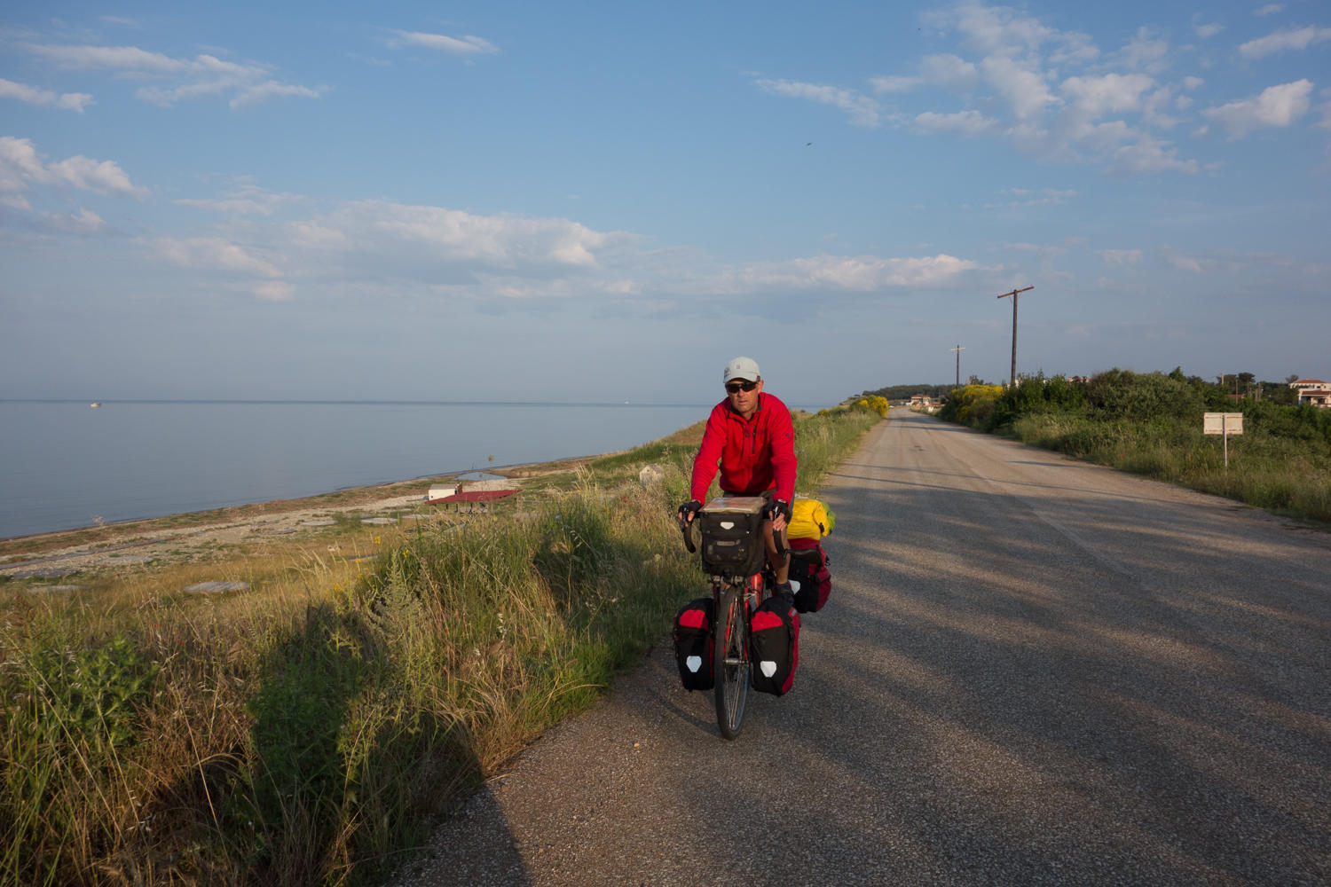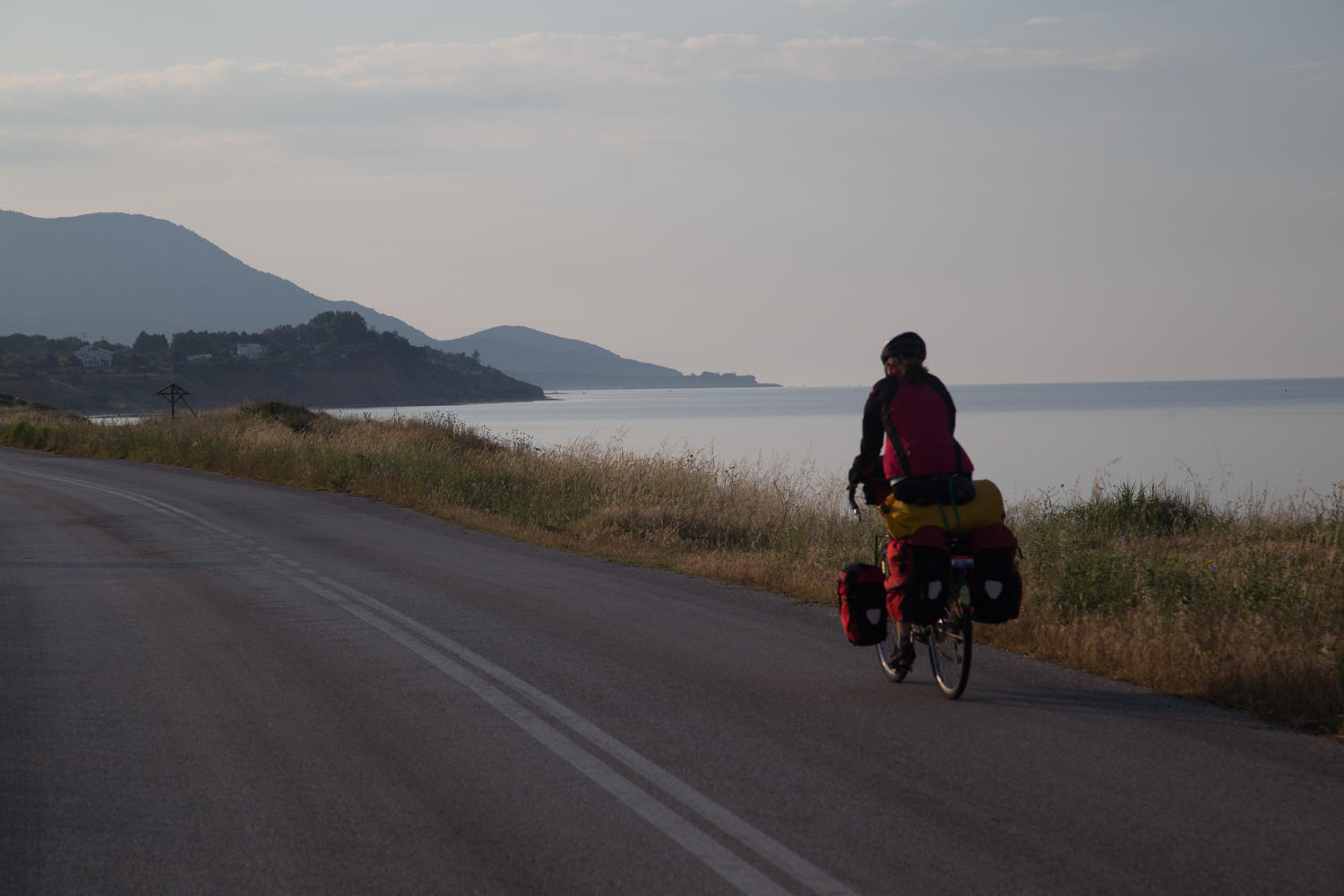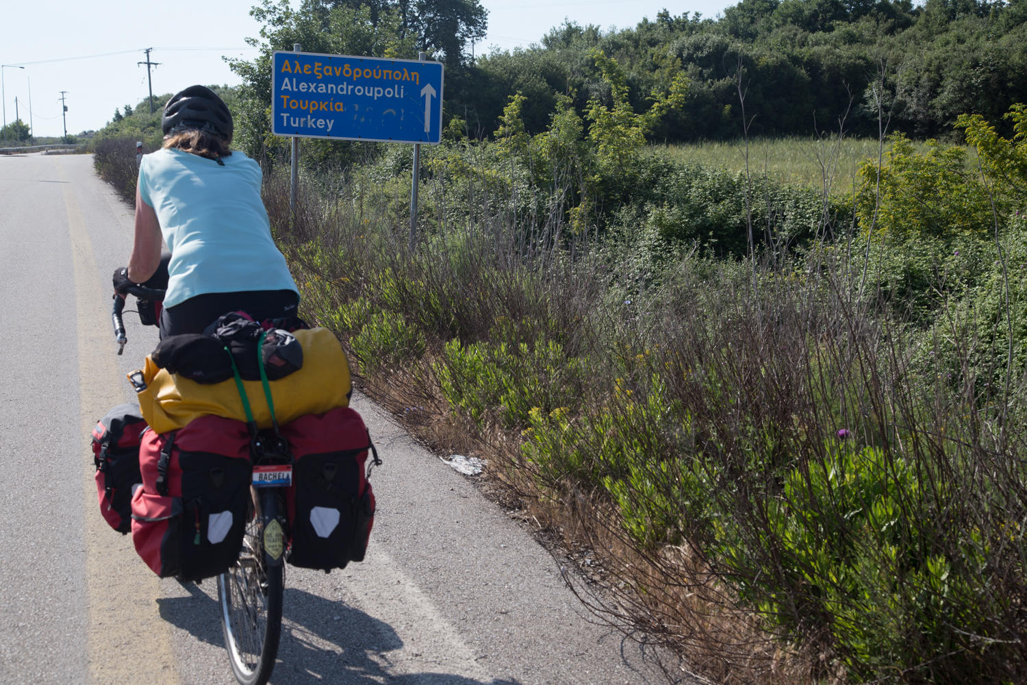On the long descent (with some short uphill, it's never all downhill), we once again see the Mediterranean and we see cyclists with loaded bikes coming up the hill. We have not seen any other cyclists touring since the French couple cycling the Danube River route. We stop and chat exchanging information on each other's route. They are a retired couple from England and have been cycling in Turkey for a month with 2-3 months more before returning home. We find out the that municipal campground in Alexandroupoli is very nice and about a guesthouse in Kesan that was basic and clean. They had also been in contact with the same Warmshowers host in Kesan as us. The host can't put people up but is very helpful with names of guesthouses. The Brits had told her of the Campus 22 where they had stayed. We tell them about our route coming from Kavala and how to get around a bridge that was out on one section. Exchanging information is a hallmark of stopping and talking with other travellers. Though technology is slowly changing that need.