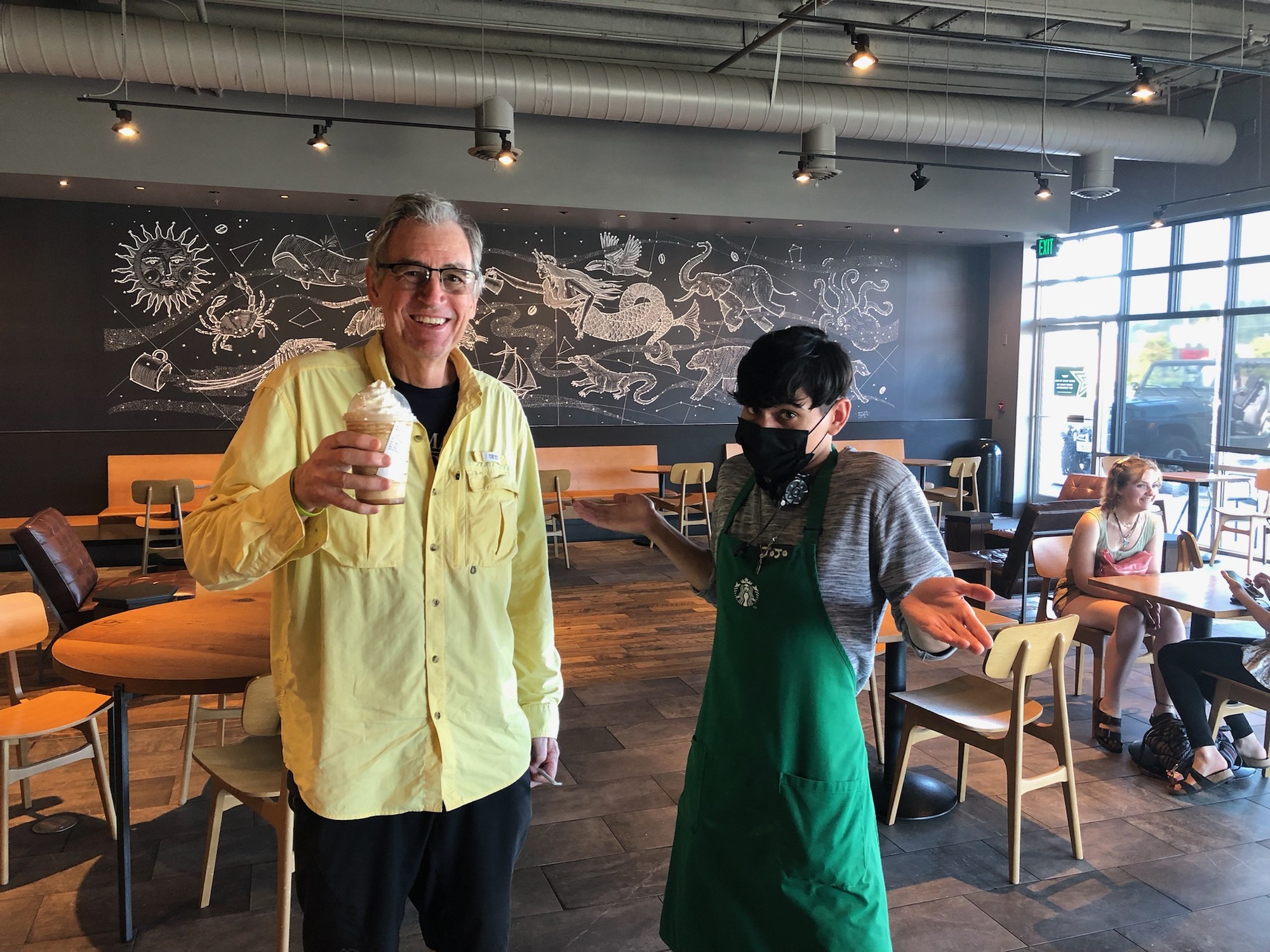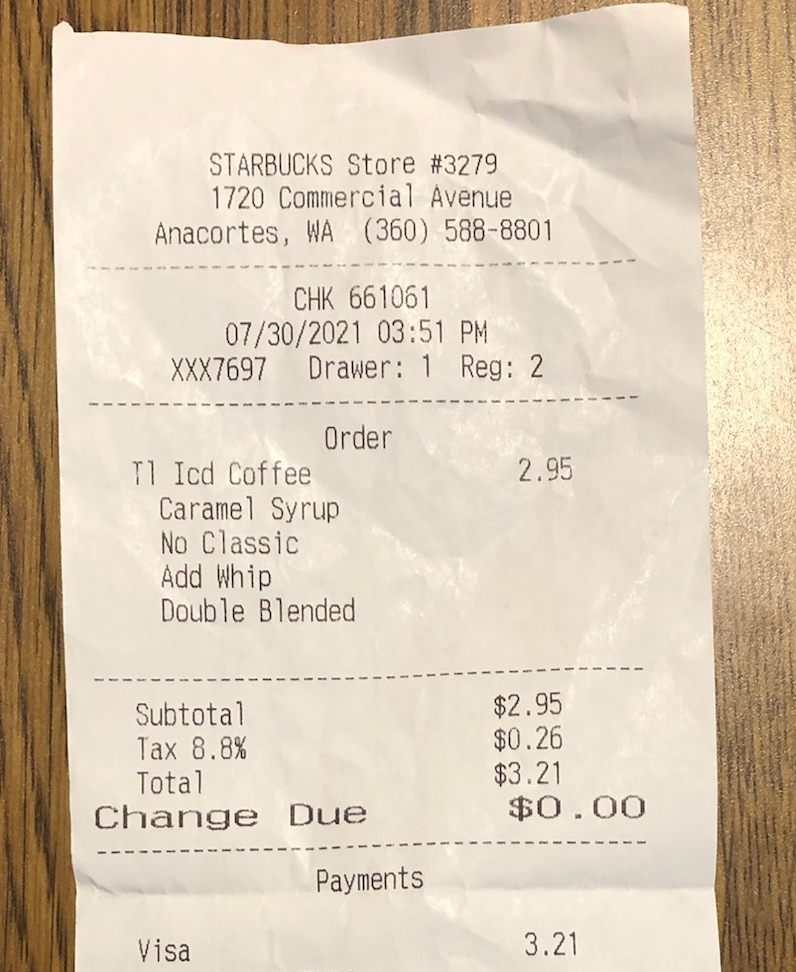 "Found Money" Coffee. I found $3.20 along the way as I rode coast to coast. Today I went to the local Starbucks in Anacortes and told them my story, and that I needed to spend exactly $3.20 on a coffee to celebrate the successful completion of the ride. After some finagling with the possible options, we agreed that an iced coffee for $3.21 was pretty close to my "found money" budget, and so that's what I got.