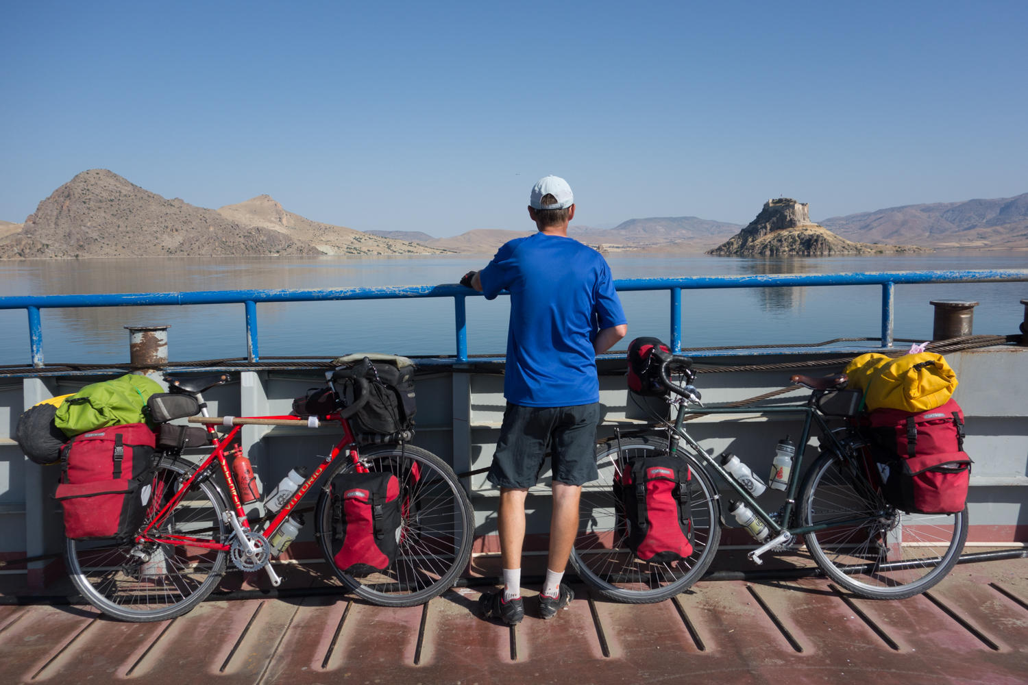 We start the descent to the lake, and for about 18 kms there was no need to pedal but once. The ferry is loaded and ready to sail, we cycle right on for the lake crossing. Then joy ride turns to nightmare.