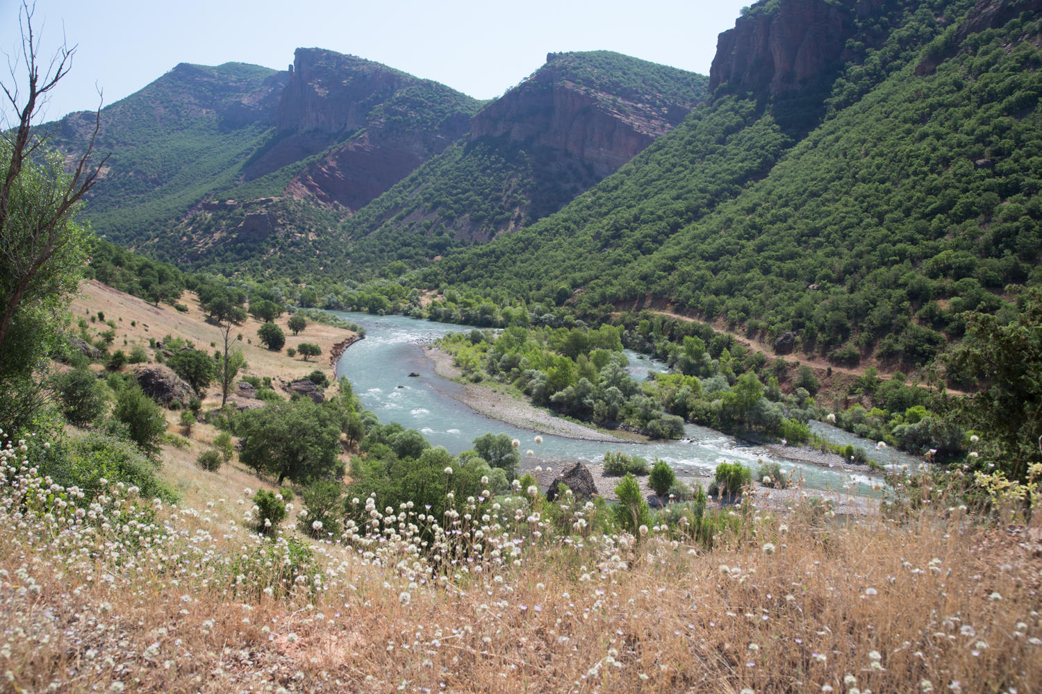 We start out early still recovering from the heat and climbs of yesterday, knowing today to be the same. For 22kms we follow the river upstream through a gorge, sometimes close to the river and then climbing away. The landscape reminds us again of home in Idaho. We stop for a rest at a roadside store and water.