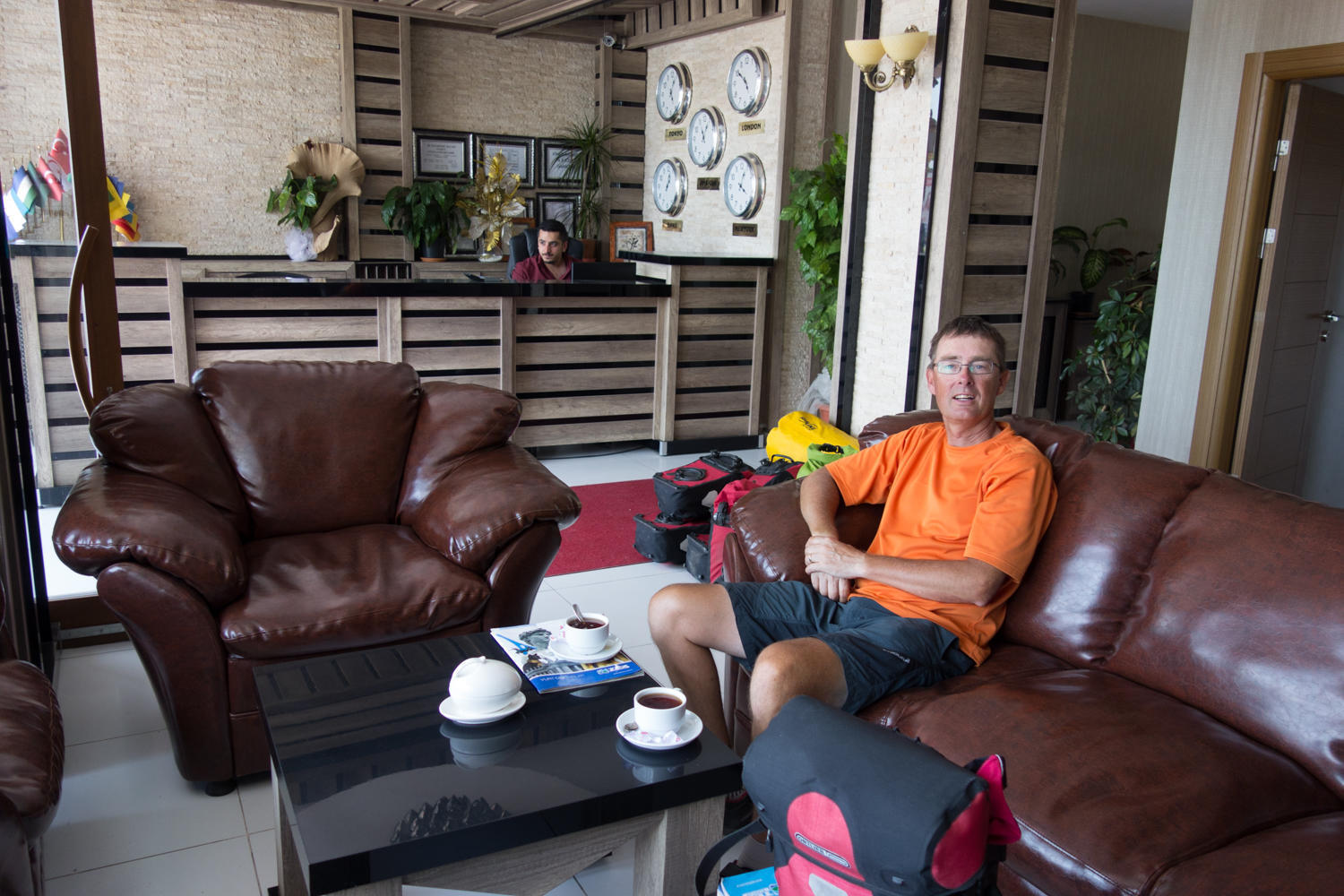 Finally, after weaving through the streets, we arrive at the Konak Hotel. Bikes are safely stored, bags off stacked in the lobby and then we wait. There is a power outage and our room is on the 5th floor so the elevator is out of service. We are asked to sit and tea is brought out for us. Then we are given the key to the room and we take the panniers with what we need first and climb the stairs. The staff eventually shuttles the rest of the gear up in the elevator when power is restored.