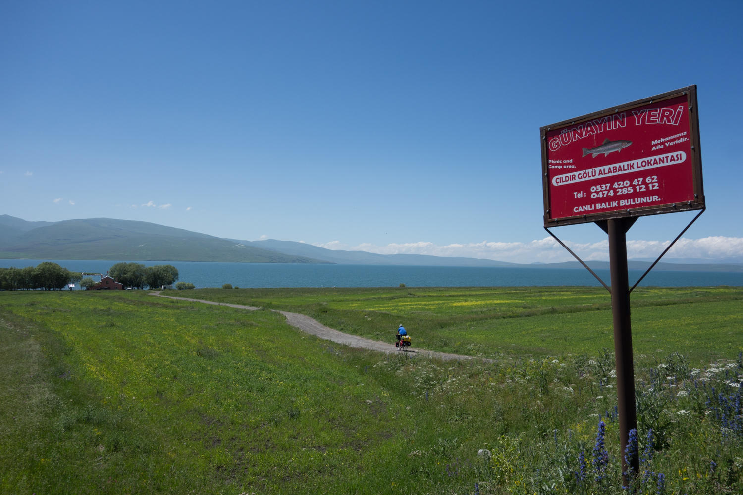 We have tea and baklava that Patrick has carried from Kars. This time the tea is served with a pot of water and a pot of strong tea rather than in the small glass with a saucer. Later we go to the restaurant for dinner of salty fish (a fried carp) and salad of cucumber and tomato along with a dish of pickled vegetables and pickled cabbage. The owner of the restaurant shows us his guest book from 2003 to present and asks us to sign the book.