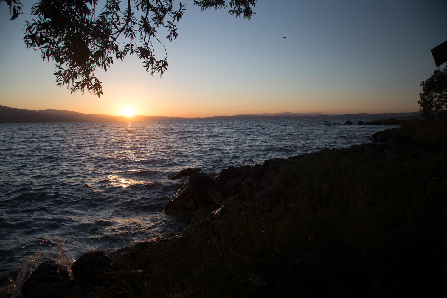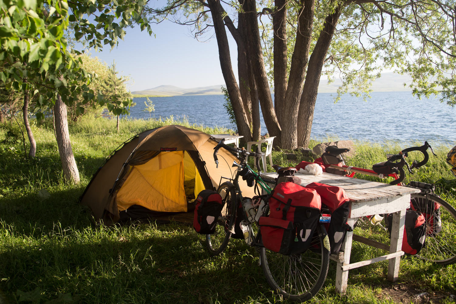 Our road quickly turns to big, loose gravel for a couple of kms, then a bit more hard packed and finally back to asphalt. There is a cross-wind making the 400 meters we gain tough going. "Where's the lake?" Patrick says, as we expect to see it around each bend in the road. Finally we get a view of the lake and the town 8 kms away. There is nothing of the town so our hopes are on the restaurant we were told past the town. We see the sign for the restaurant that offers picnic and camping...is it open? A car pulls in the driveway to the restaurant so we are hopeful. It's open!