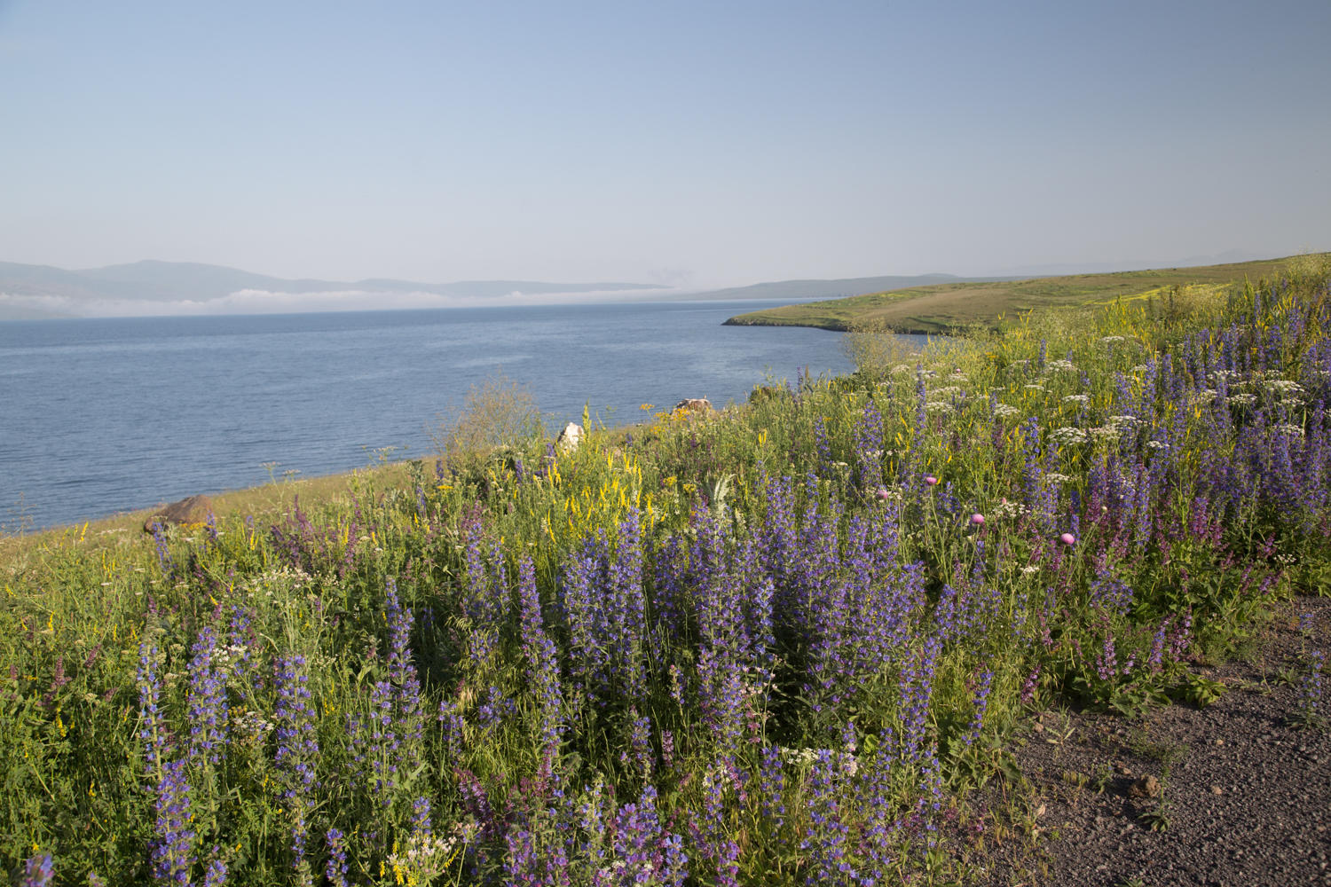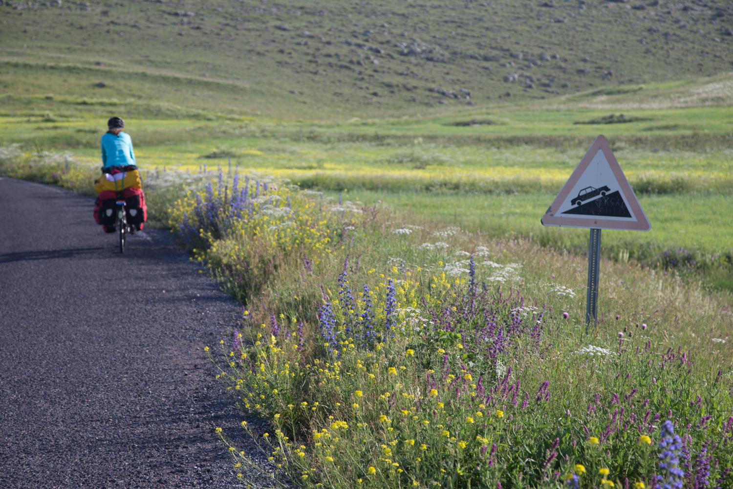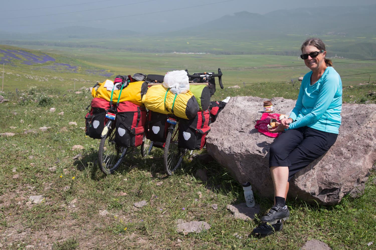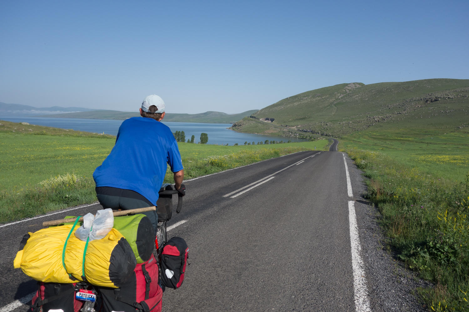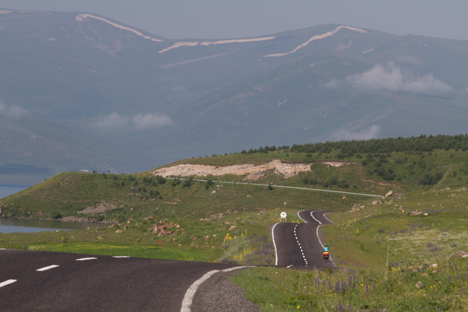 As we break camp, Patrick gives the 3 dogs and puppy that live at the restaurant some sausages that he is carrying in case we have a run in with sheep dogs. Then they followed us for a couple of Kms. When we first got out of the tent the dogs were sound asleep, no surprise as periodically through the night their barking surely saved us from whatever threat that might be out there. Our tour guide to Ani and the warmshowers member Cuneyd in Hanak both warned us to camp near people because of wolves. Our risk aversion index is higher than in the past trips so we didn't free camp even with lots of spots along the lake that would be good places.