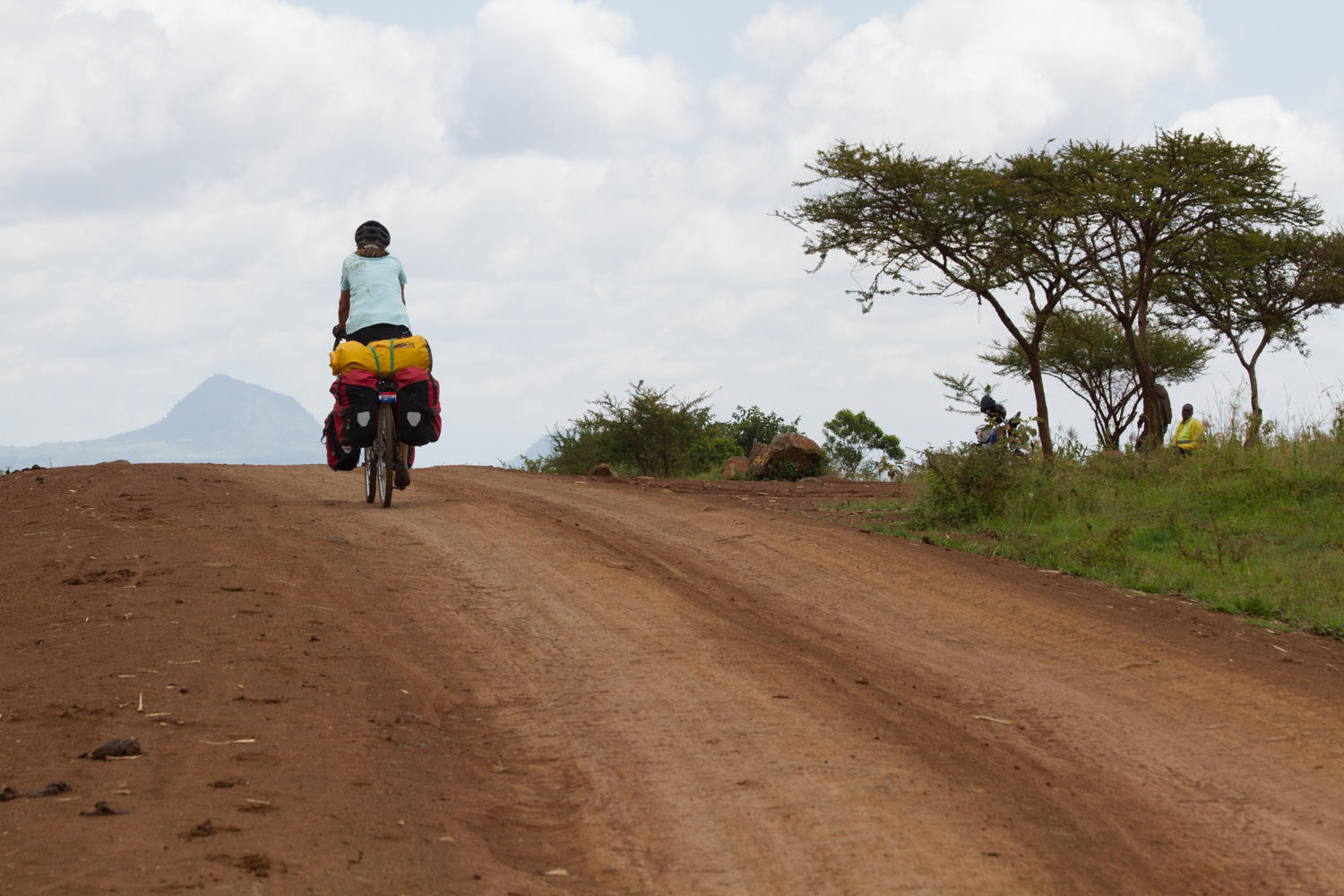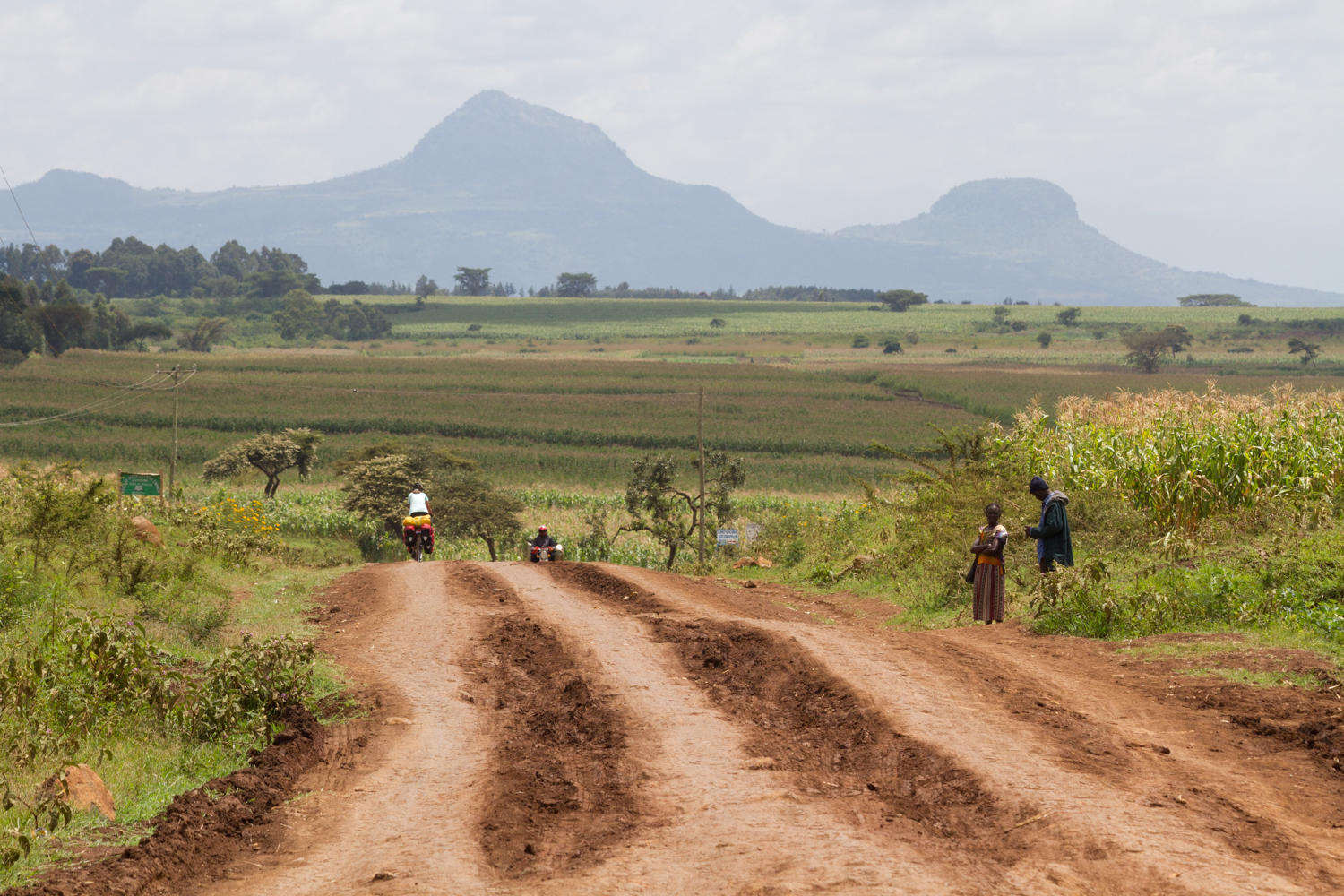We left Kitale hearing gospel music, passing by the Sunday market as it was opening, dodging motorcycles and donkeys. The first 20kms was a nice ride, then we reach Endebes where the pavement ends. Last night's thunderstorm has turned the red African soil to mud in some sections. On a shady downhill section, Rachel was forced into the mud, so much mud the tires could no longer roll. A man helped her get the bike out of the mud to the side of the road, Patrick makes his way back through the mud, a crowd begins to gather to watch Patrick take the fenders off the bikes. Patrick is again carrying a stick, a small one, not for the dogs but to get mud off the rims and brakes.