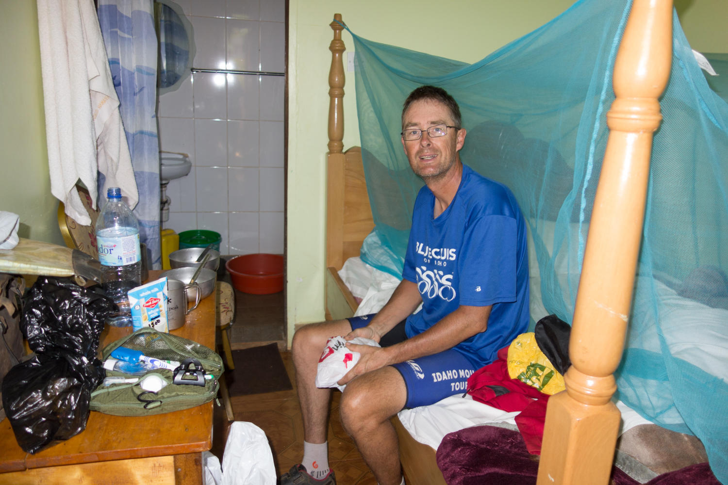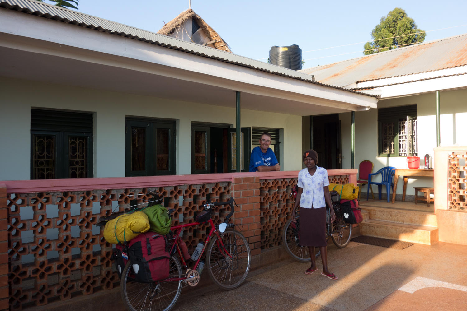 It takes 2 hours driving the 20 kms to Kapchorwa. Bouncing around inside the cab of the truck hurt almost as bad as cycling. We are dropped off at the edge of town, reload our bikes and cycle up the hill toward town. Just on the edge is a very nice place, Savannah Guesthouse. It's about 11:00, cold showers, a few things laundered and Patrick rests most of the afternoon. We walk into town for a supermarket for milk and bread.