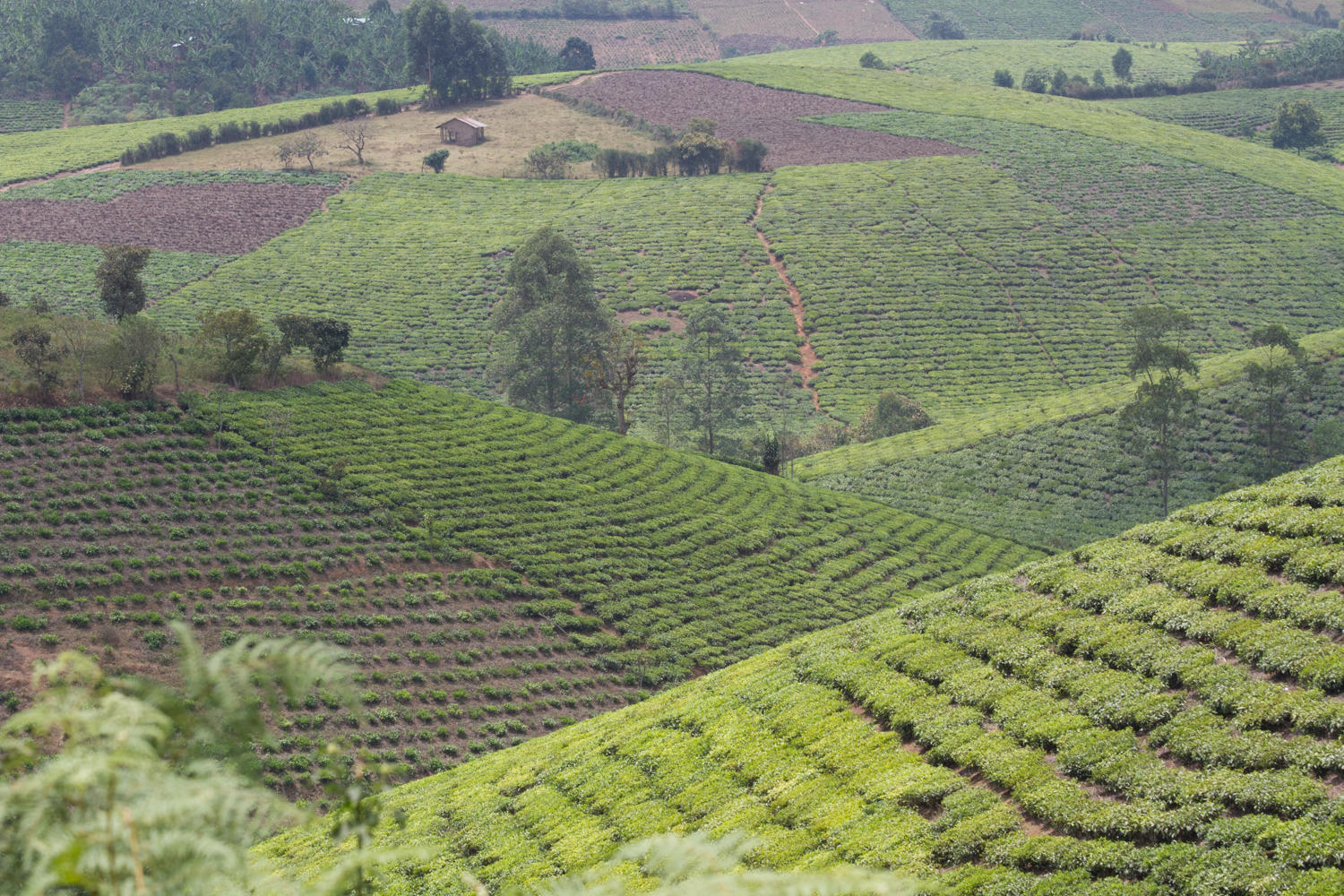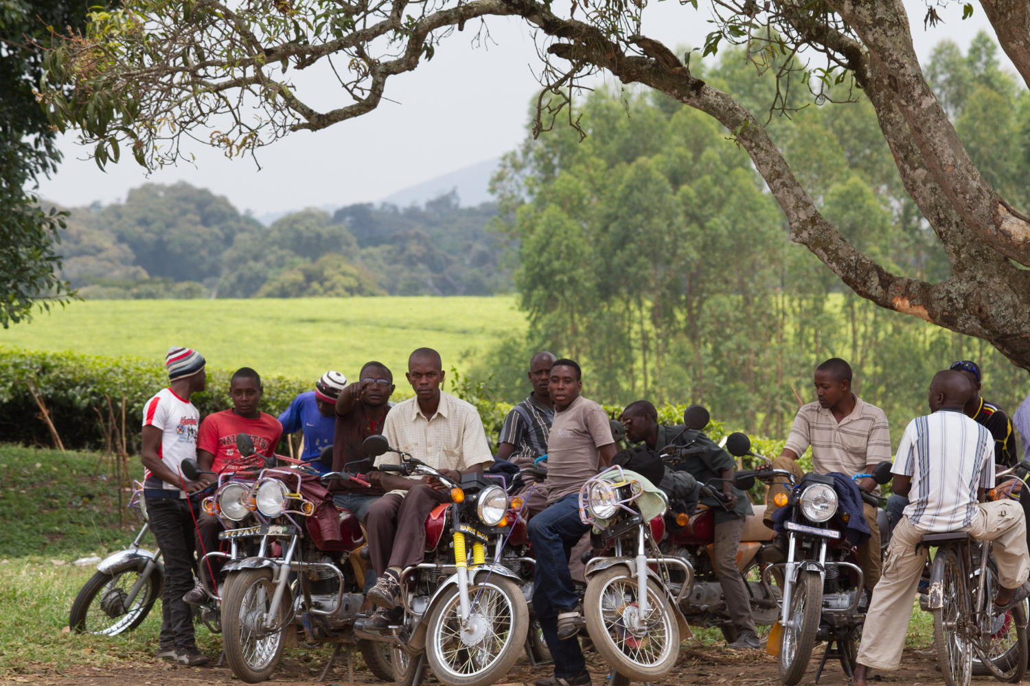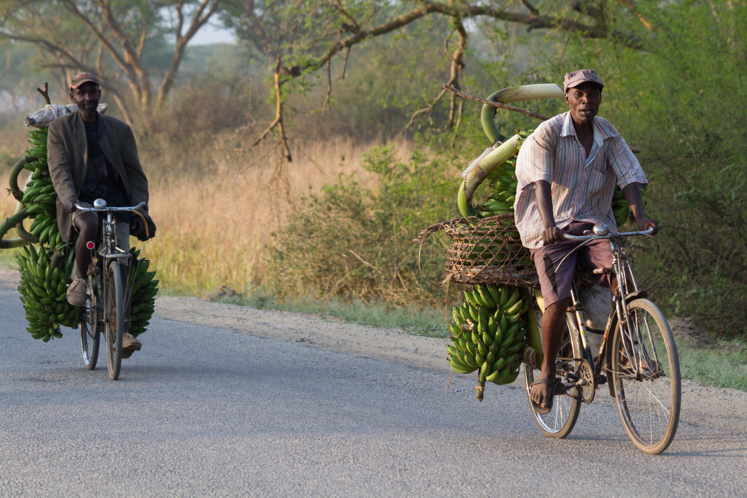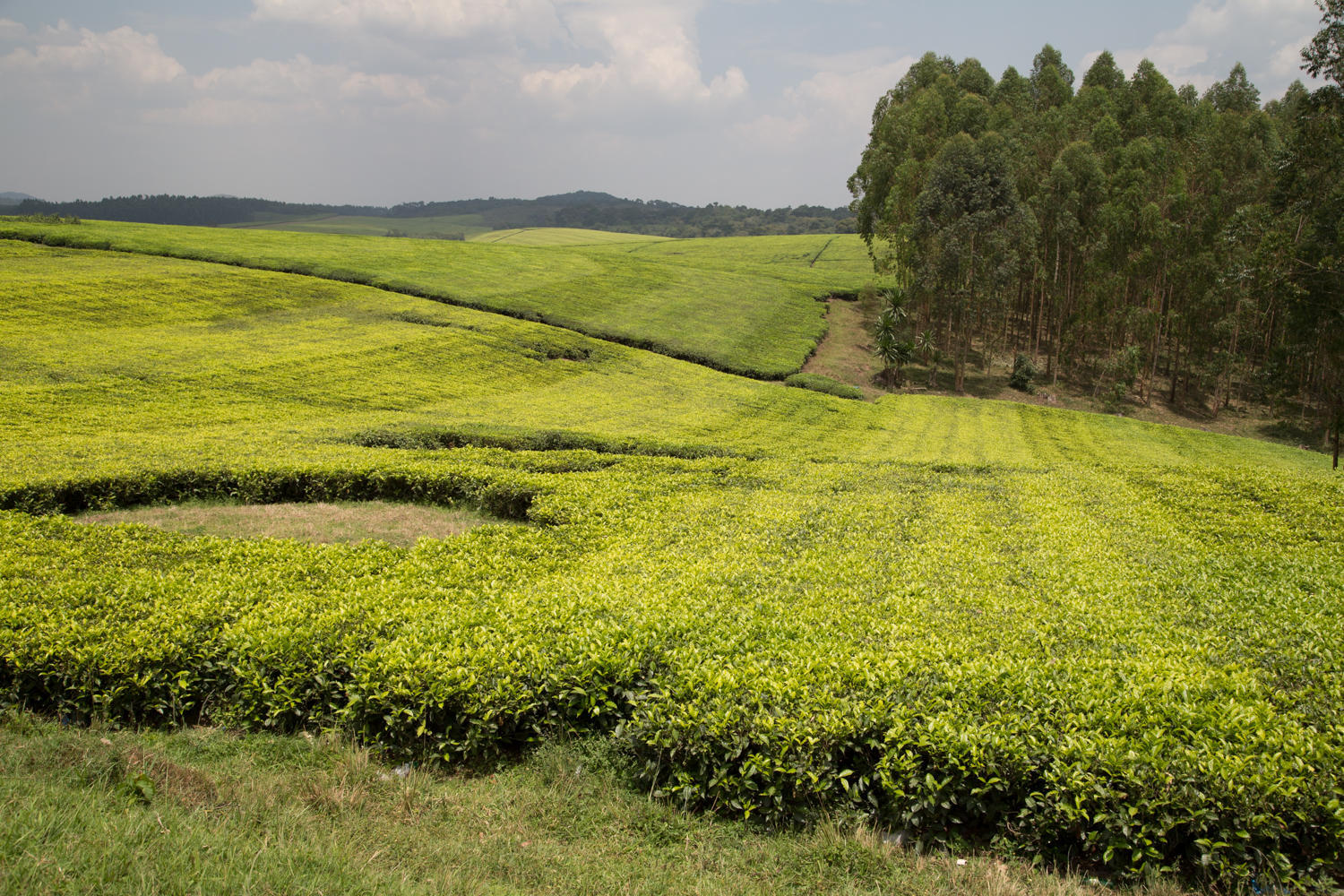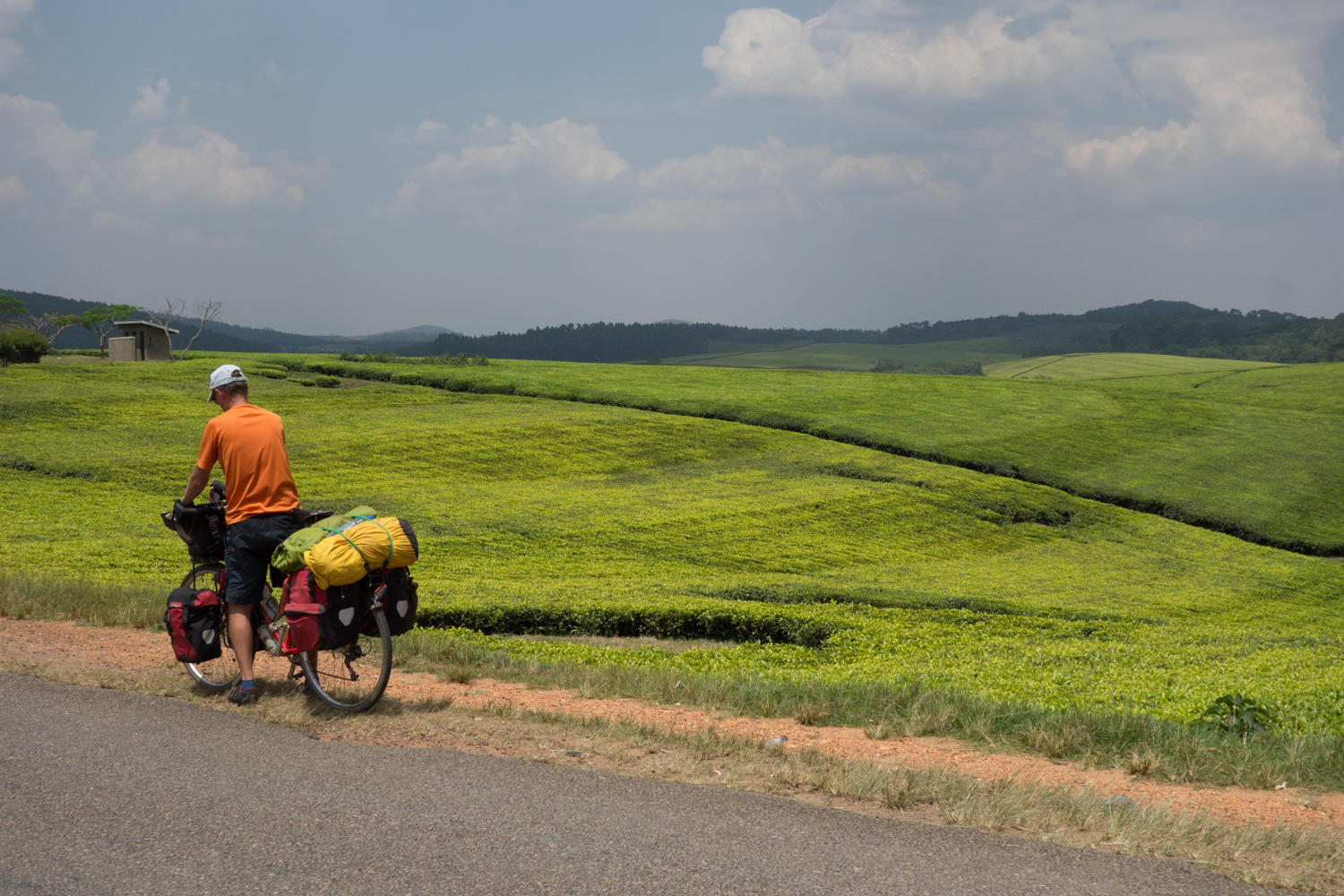 We cross the bridge over the Kazinga Channel at sunrise. The first bit of road is still part of the savannah of Queen Elizabeth National Park. After about 10 kms, we can see the road go up the escarpment. This part goes very well. Then we lose a bit of elevation to a crater lake, and the road gets steeper. Once over this ridge we cycle along with tea plantations. The leaves are not hand picked like in China. Instead, the leaves are cut with a combination type hedge cutter and vacuum collection in a bag.