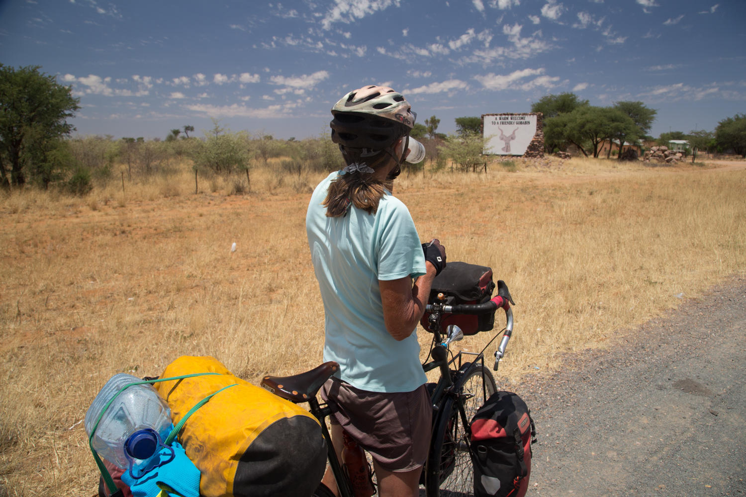 "The final flat tire from Botswana," we are packed and rolling our bikes out of the grass from the campsite and Rachel's back tire is flat. We are just 1km into Namibia, so this counts as a Botswana flat.