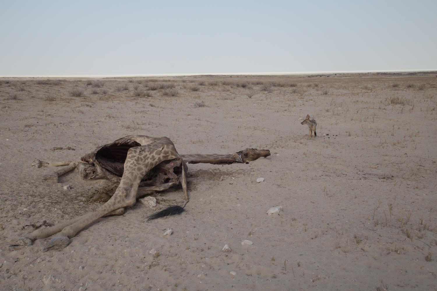 Some jackals are feasting on this giraffe. We think it must have died from old-age or disease. If lions would have brought it down not much would have been left for the jackal.