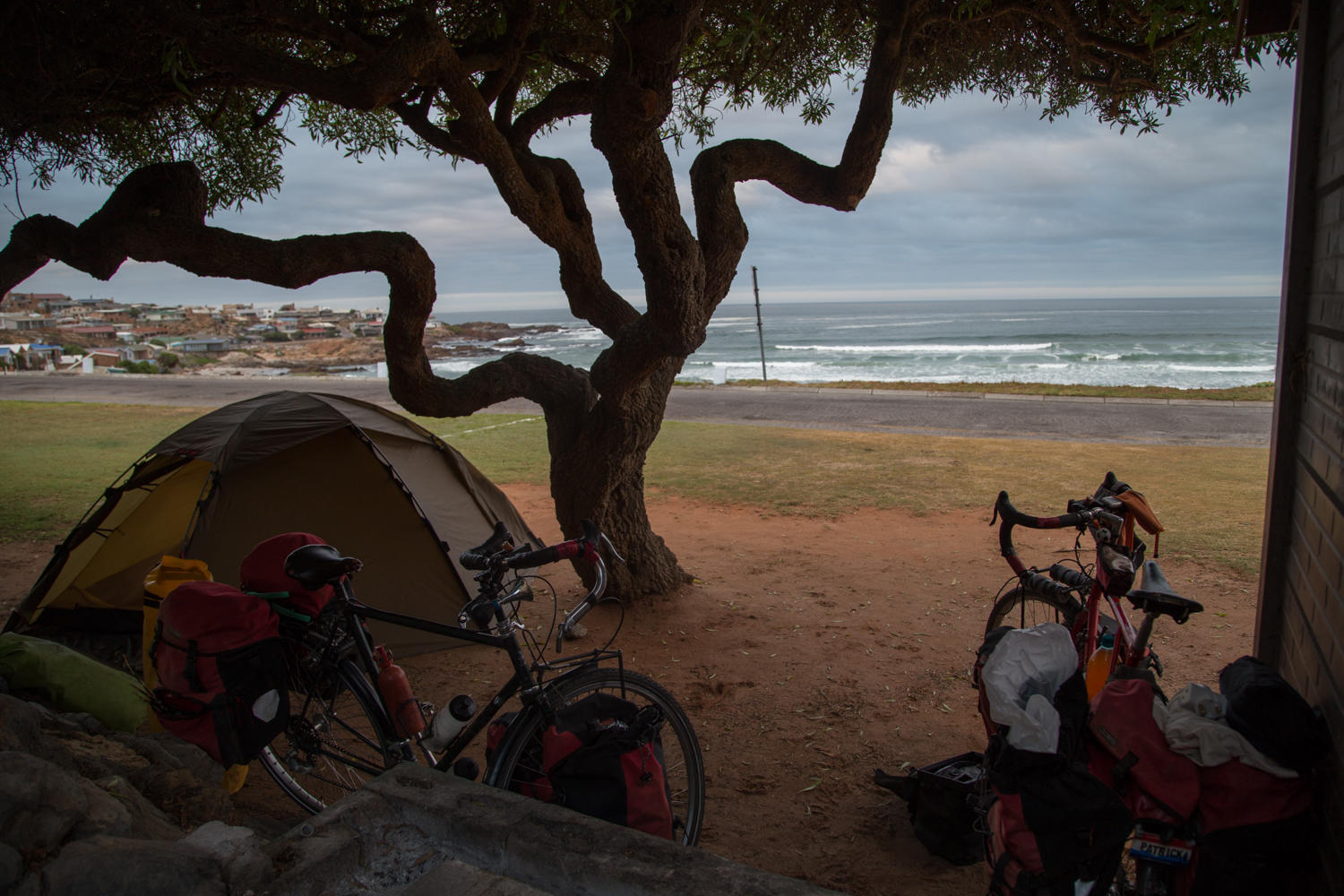 We reach Strandfontein and stop at the information office. Lucky, as this is where we make payment for camping, and camping is down a steep hill to the ocean. We find our assigned spot with a nice tree, and private building with toilet, shower and laundry sink. A braai area that we use to cook dinner.