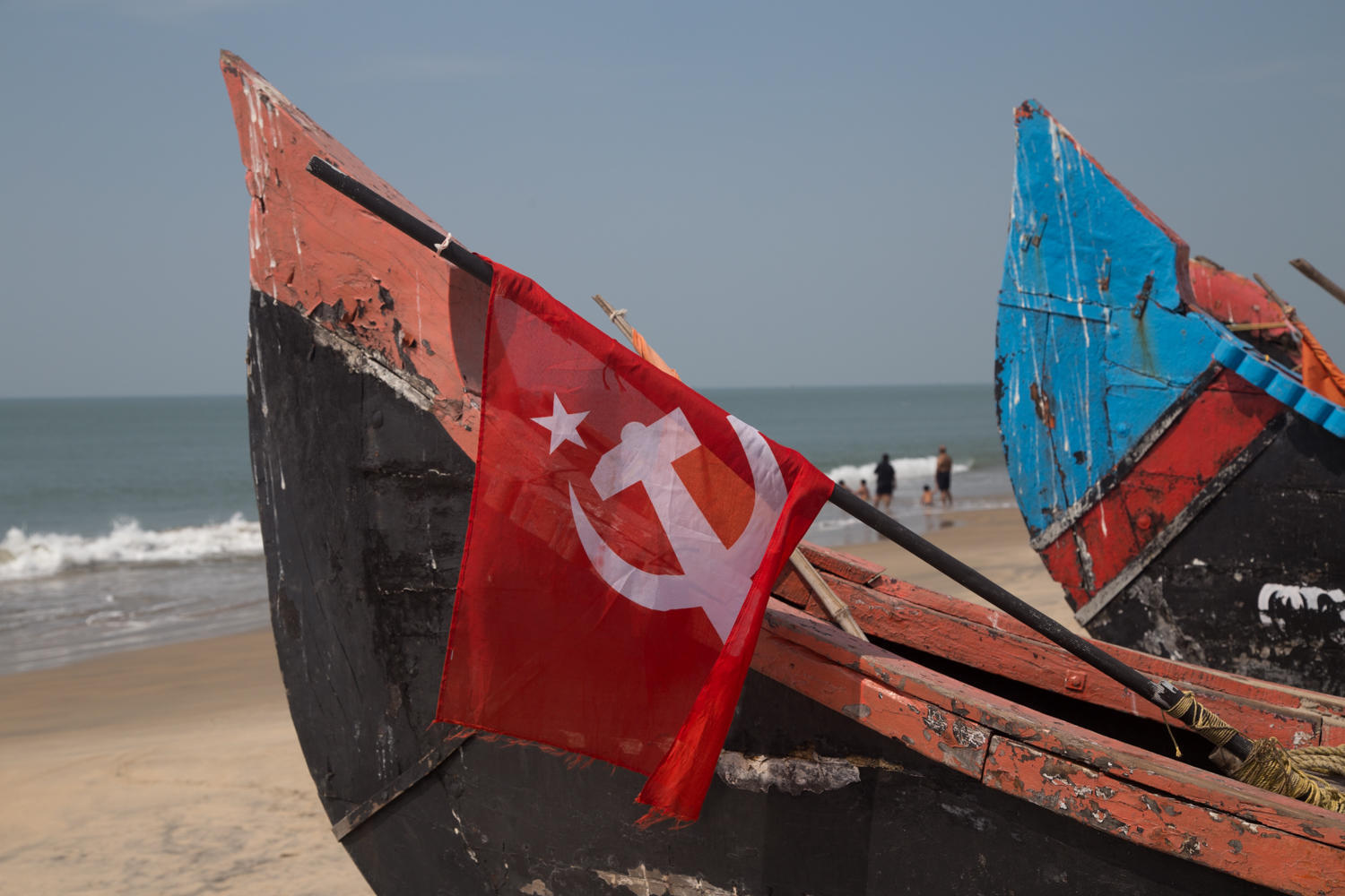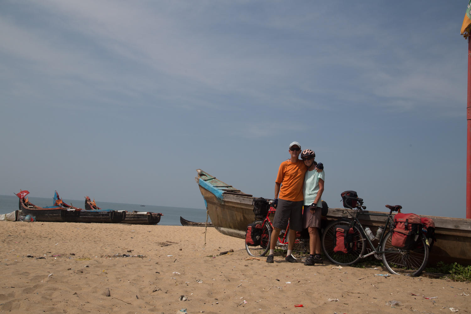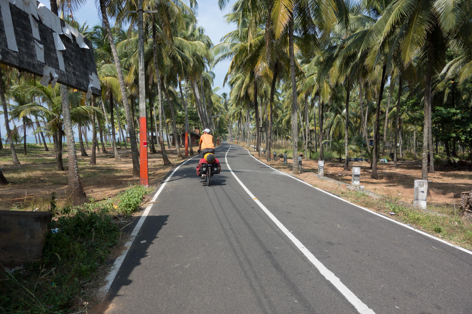 "There is no ferry" the shop owner says as we stop for a break. We've cycled about 20kms after taking the ferry from Fort Kochi to Vypin Island. A very nice way to get out of the city. We planned to take the ferry off the North end of the island to a smaller coastal road rather the bridge to the main road. These first 20 kilometers was non stop traffic as we rode past Hindu temples, Mosques and Catholic Churches along with the communist symbol of hammer and sickle.
