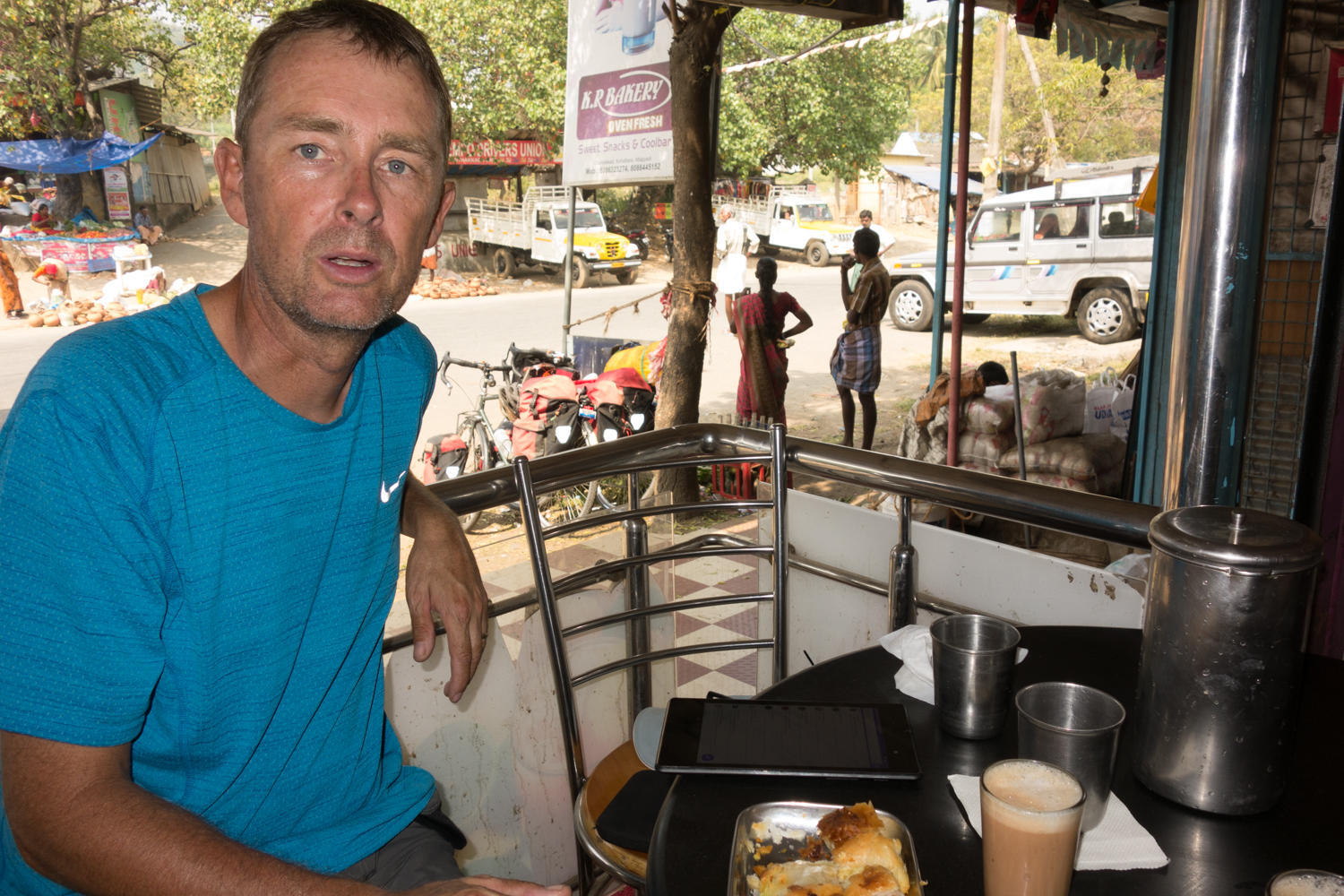 We stop again for an egg and vegetable "puff" pastry and tea for morning break. We watch women in very colorful saris walk by and into the shop. The style is the same, crop top with sleeves, a sarong around the waist and a cloth draped over one shoulder around the opposite hip and leggings. Yet the outfits look so different, the variety in fashion achieved by color combinations.