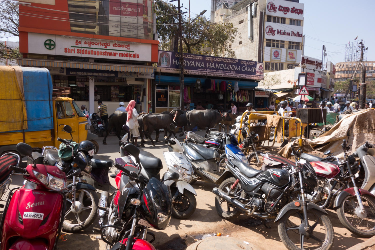 We are still cycling through agricultural area, with corn and sorghum fields, cotton fields and peppers plants. The coconut trees have disappeared, but we saw orchards we think are orange trees. Cycling into Hubli is again chaos of bus, truck, motorcycles, bikes, pedestrians and cows along with streets that merge into a round-abouts from all angles. We check into the Ayodhya Hotel and surprised by how modern the room is, and have one of the better showers since being in India. We have TV with CNN and movie channel. The hotel is a "CNN partner hotel". There is a strong anti smoking campaign with announcements before movies and during if a character is smoking, that smoking is hazardous to health. Lunch in the hotel restaurant that also has lots of bus travels, since the station is across the street. Then we walk the streets to find a vodaphone shop to buy more data for the sim card.