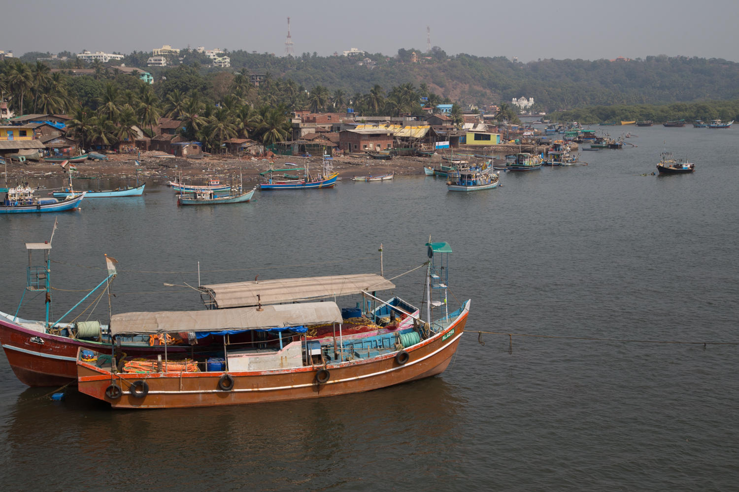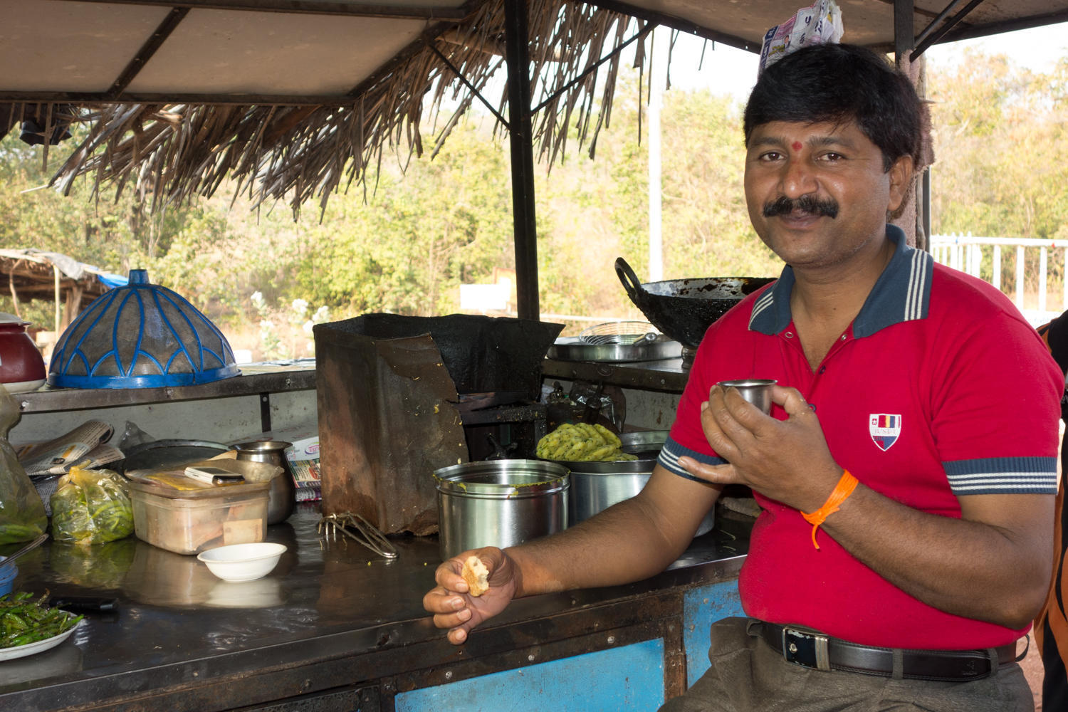 At the junction with MH 4, we stop for a break and discover another breakfast snack, a sweet bread roll and potato patty sandwich. This was a nice time to take a break for now the climbs begin. They are steep. The last two at 20kms before Ratnagiri were shorter yet we had to walk a few stretches. We are in awe of cyclists who do Devgad to Ratnagiri in one day. The last 8 kms are relatively flat, though we had a bit of a headwind. At one point, coming around a corner, Rachel says, "I thought that was a plain and the tops of palm trees, but it didn't make sense, until then I saw the surf", Patrick agrees that he thought the same thing. We ride along the coast, the road lined with cypress trees.
