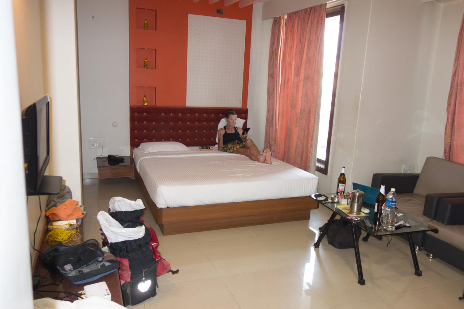 At the bridge into Ratnagiri, we again see coconuts for sale. We stop for a coconut water drink, a great replenishment of electrolytes "better than a sports drink." We cross the bridge and there is one more hill into town. The first hotel we check wasn't so great for the price, further down the road we check a second one and it's the same. So we go back and check a third place, Sun Star Hotel. The price is 1800rupees, 300 more than the other rooms, but a much better value. The bed isn't just a 3 inch mattress on a plyboard, but soft clean sheets, hot water shower, TV with movie channels and BBC news.