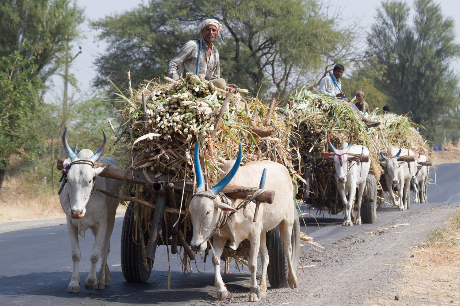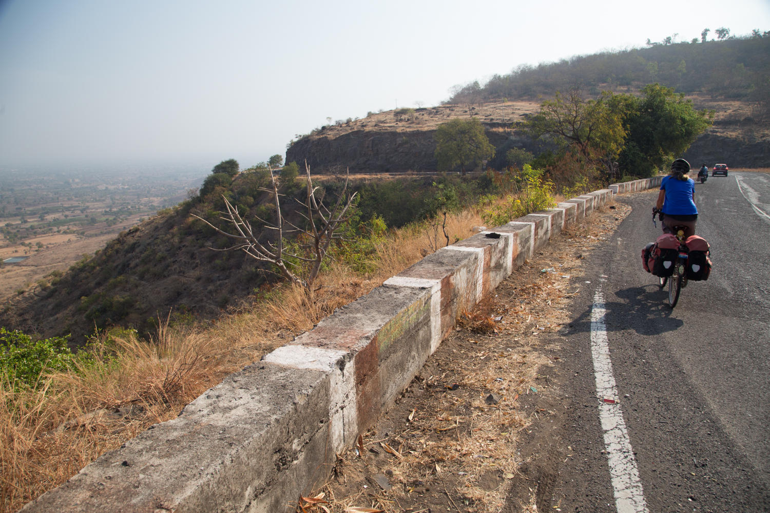 The traffic is less on the secondary main roads except for when we came to junctions with other roads. We have left the Western Ghats and are on the Deccan Plateau. The landscape is drier, we climb a bit before a fantastic 6km descent to a fertile agricultural plain and 70kms of relatively flat road. Very little cloud cover today and by afternoon the sun is hot.