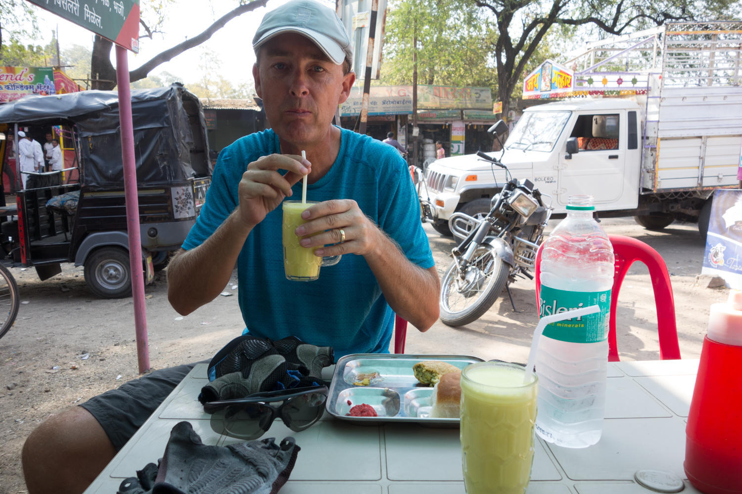 People at the next table ask to take a selfie with us. They asked if we were cycling, and then said they had seen us on the road. The owner of the restaurant gives us a brochure about a lodge he has opened, Abhinandan Lodge, and he wants us to stay there. We try to explain we already have a room. Then another man who speaks better English joins the conversation and says "You are my brother, you are my sister, this is the best place for you". Again, we try to explain that we already have a room. Patrick tries to explain about google maps and he needs to have the lodge listed. In the end, he shows us a link where the lodge is located Justdial.com. Now we know of two possiblities in finding rooms in India,the other option is Ayo Rooms.