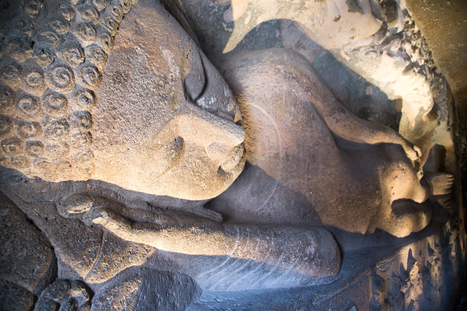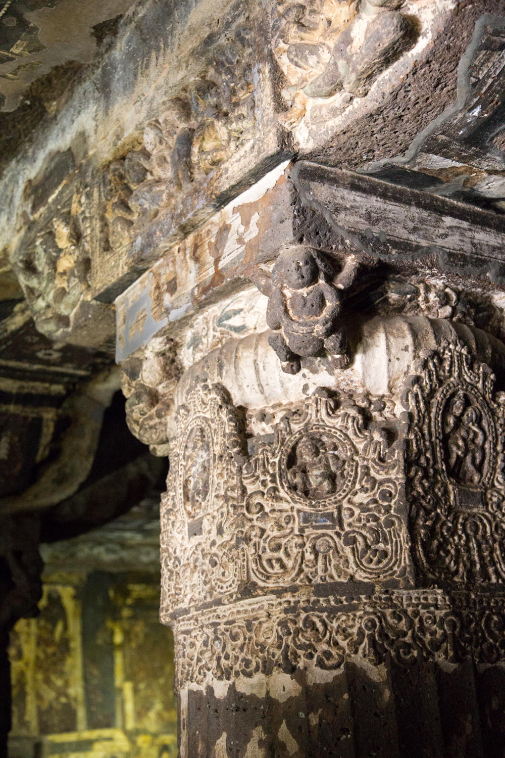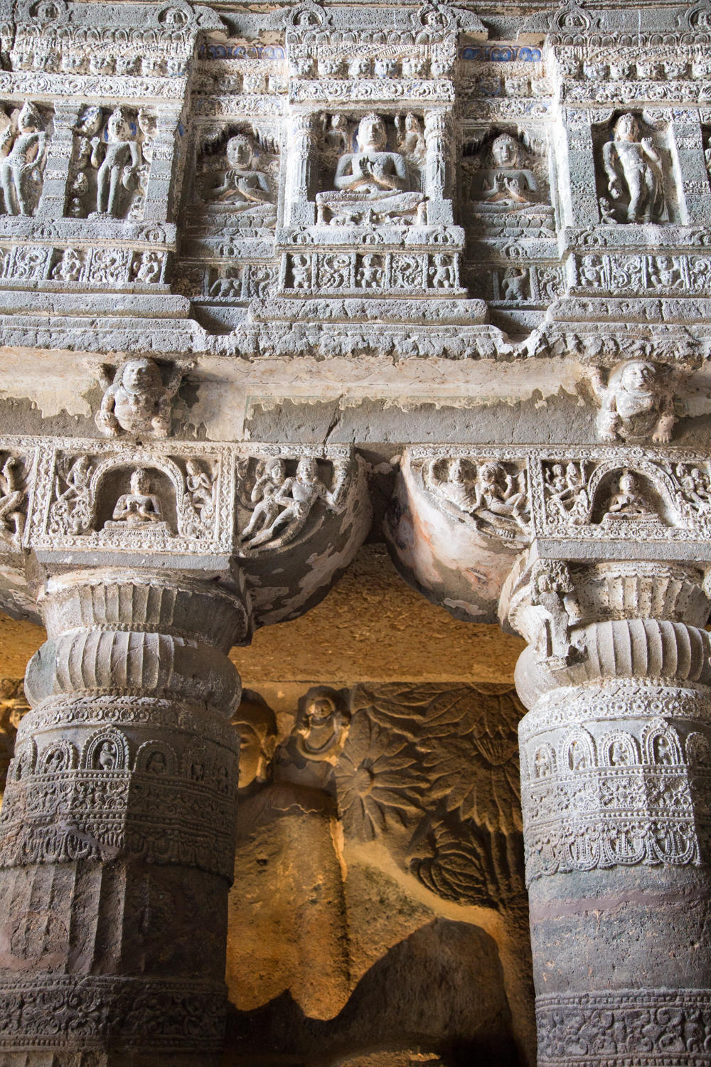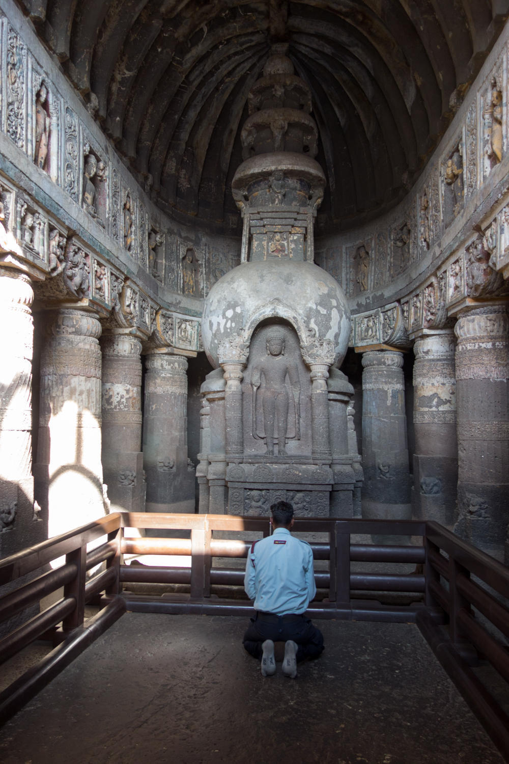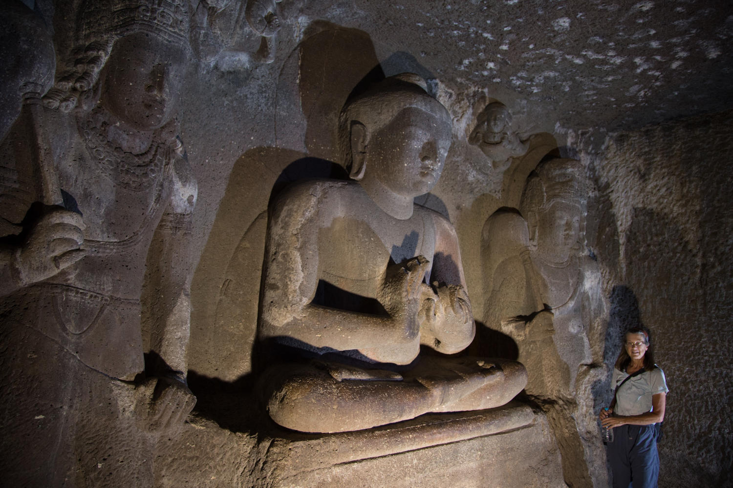 The caves are amazing. Carved between 200AD and 600BC and abandoned once construction started at Ellora, the caves lay forgotten until "discovered" by an Englishman in 1819. They are excavated in a narrow horseshoe shaped river canyon. As recommended we escape the morning crowd be heading to the last group of caves and working our way back. The carvings and color paintings are amazing, but we'll let the photos do the talking: