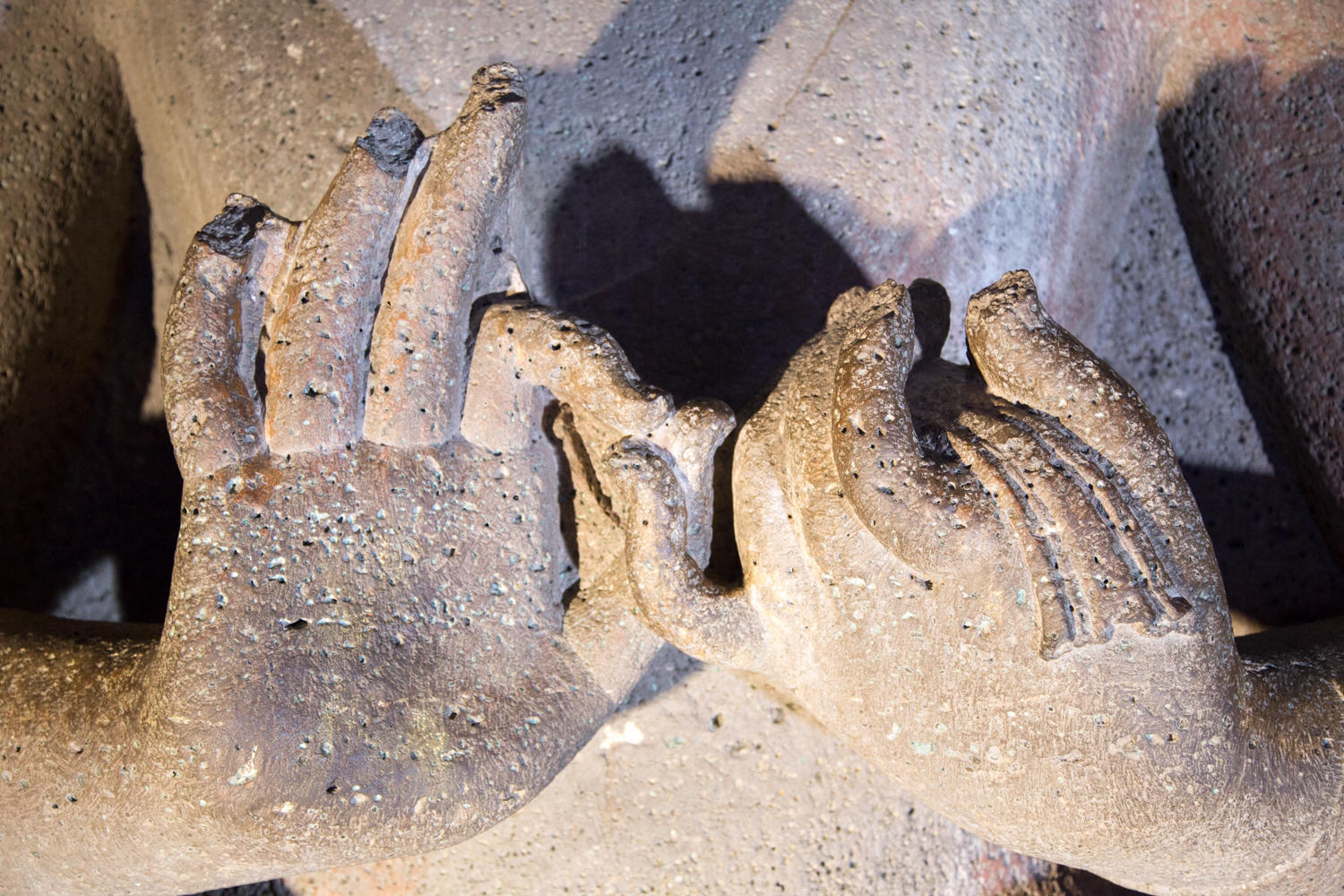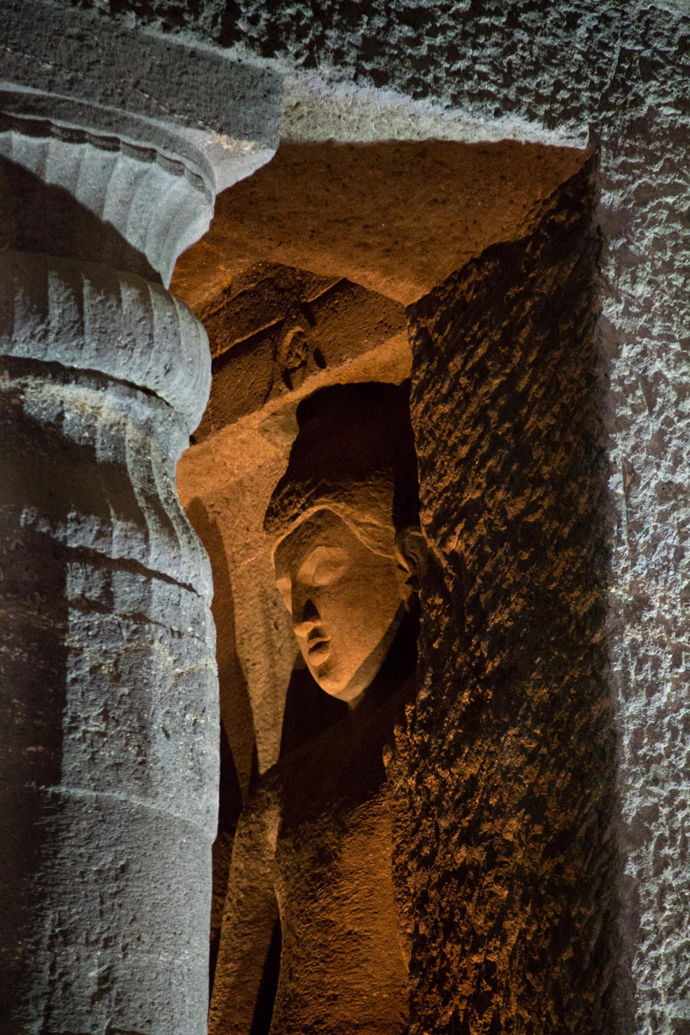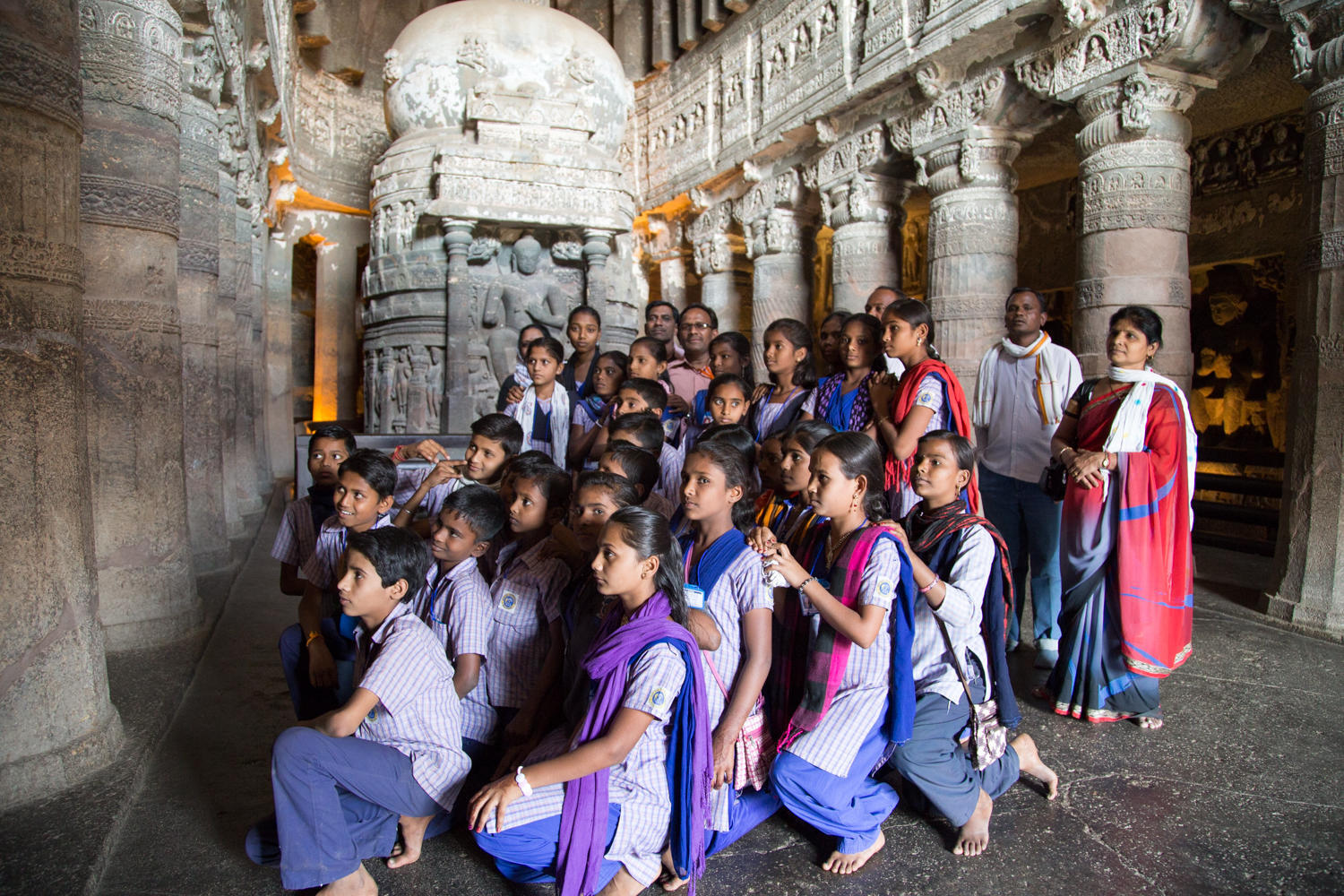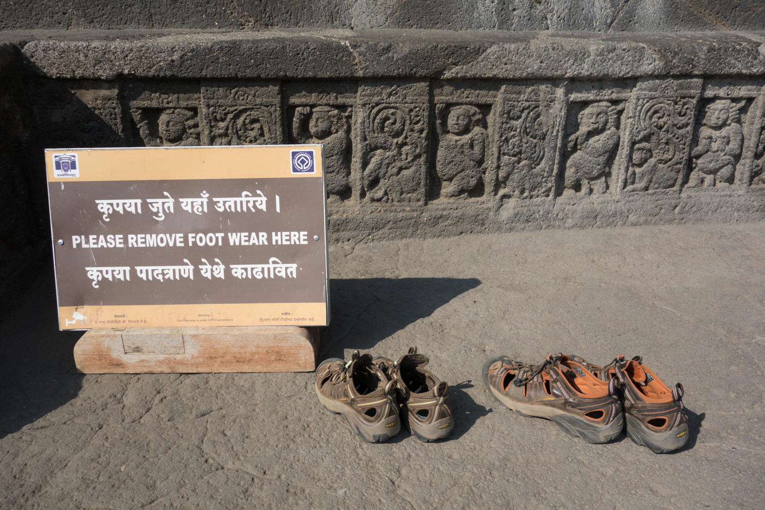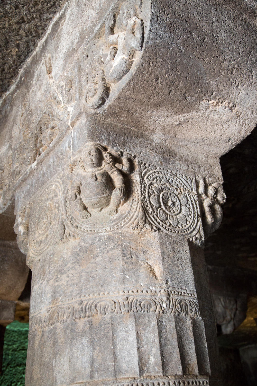 The caves are amazing. Carved between 200AD and 600BC and abandoned once construction started at Ellora, the caves lay forgotten until "discovered" by an Englishman in 1819. They are excavated in a narrow horseshoe shaped river canyon. As recommended we escape the morning crowd be heading to the last group of caves and working our way back. The carvings and color paintings are amazing, but we'll let the photos do the talking: