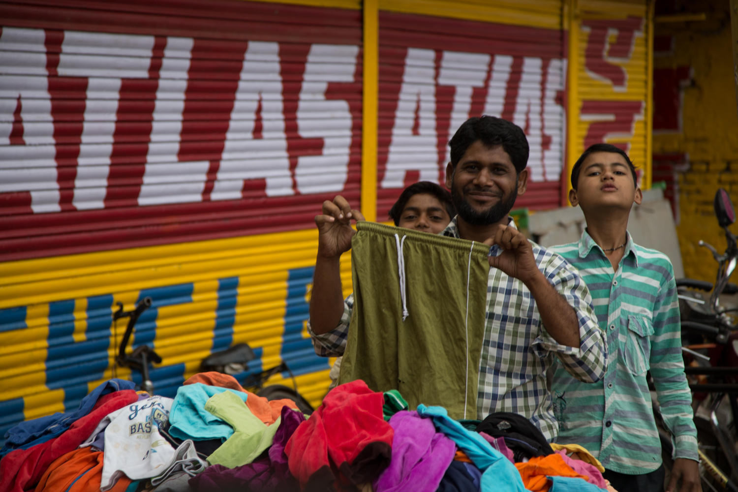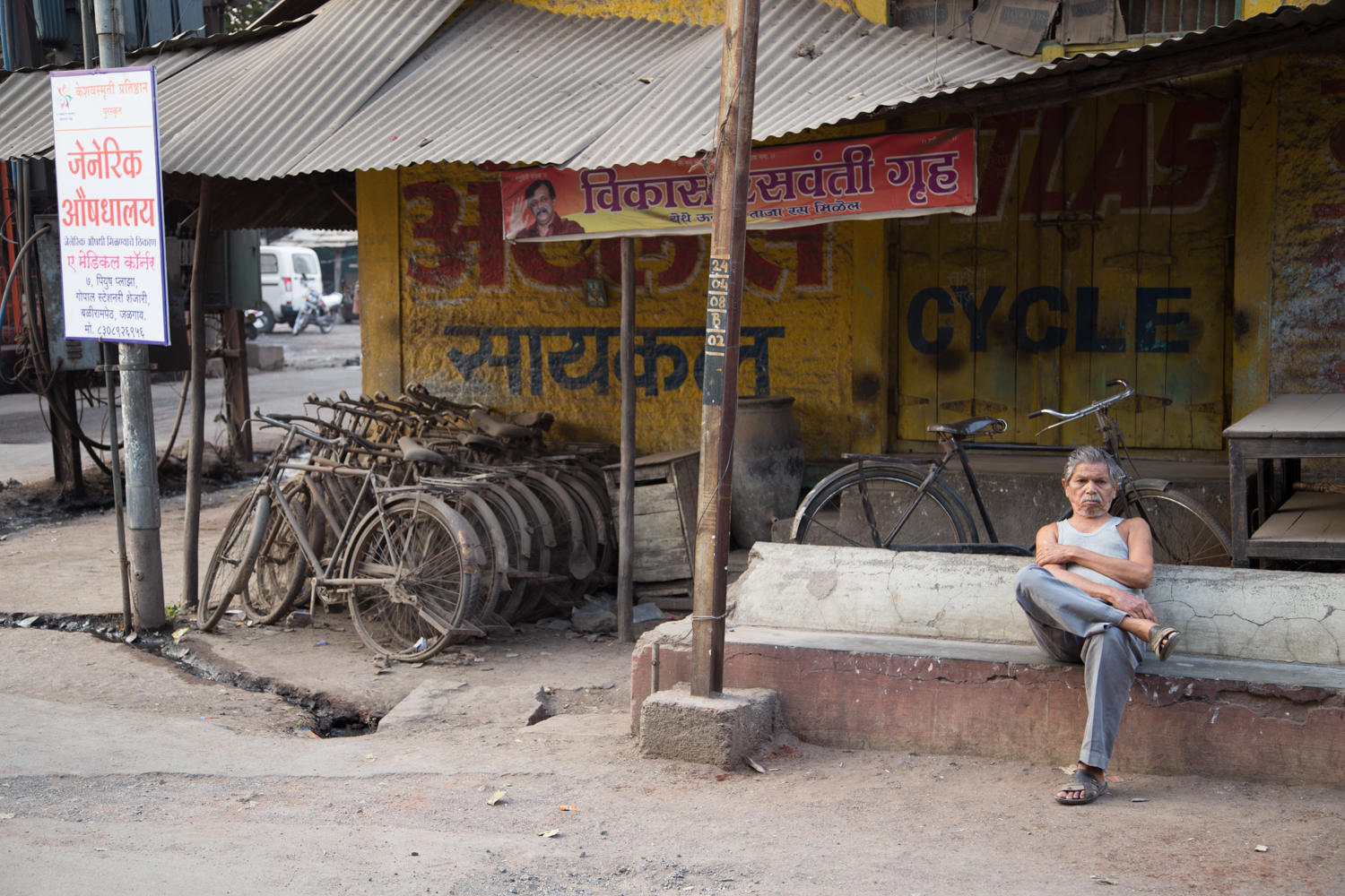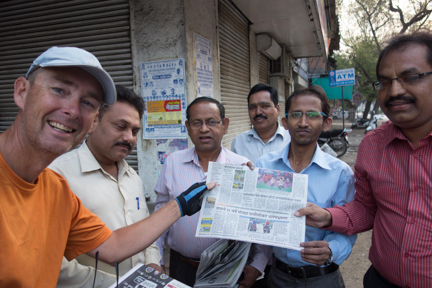 "Money is paid" the man says when we try to pay. We had stopped for a break at another stall when the man speaking fair english says "Chai, bring bikes here". So we move our bikes, have chai and the potato vada has returned, Patrick asks if he can translate the newspaper article. A crowd gathers and no luck with the translation.