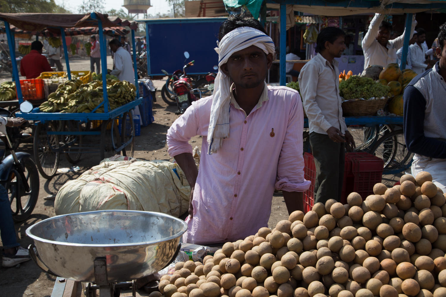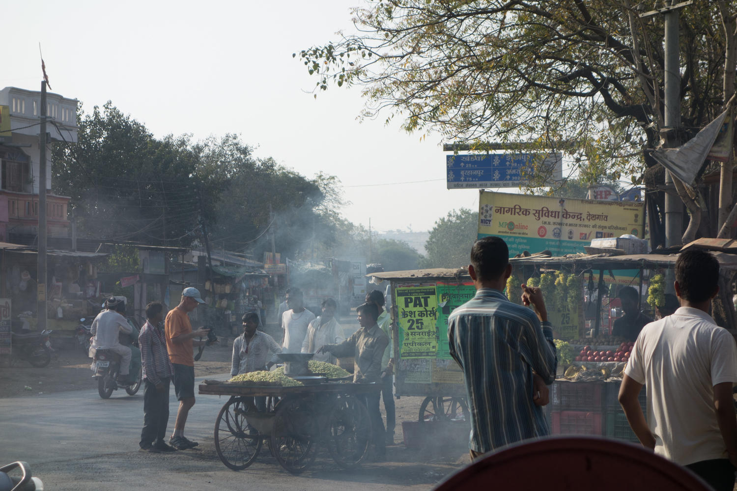 We see a huge bill board for Hotel Shakti Avenue. Then the asking for directions begin. First one man, then another joins in and soon 5 or 6 are around Patrick pointing in the direction back. We cycle back and at the bus station, Rachel remembers that was on the sign, the hotel was near the bus station. Patrick asks a tuk-tuk driver who wobbles his head and looks around, another man joins in, then another points who motions back and to the right. We go in that direction, and Patrick thinks he spots the hotel at the far end of the street.