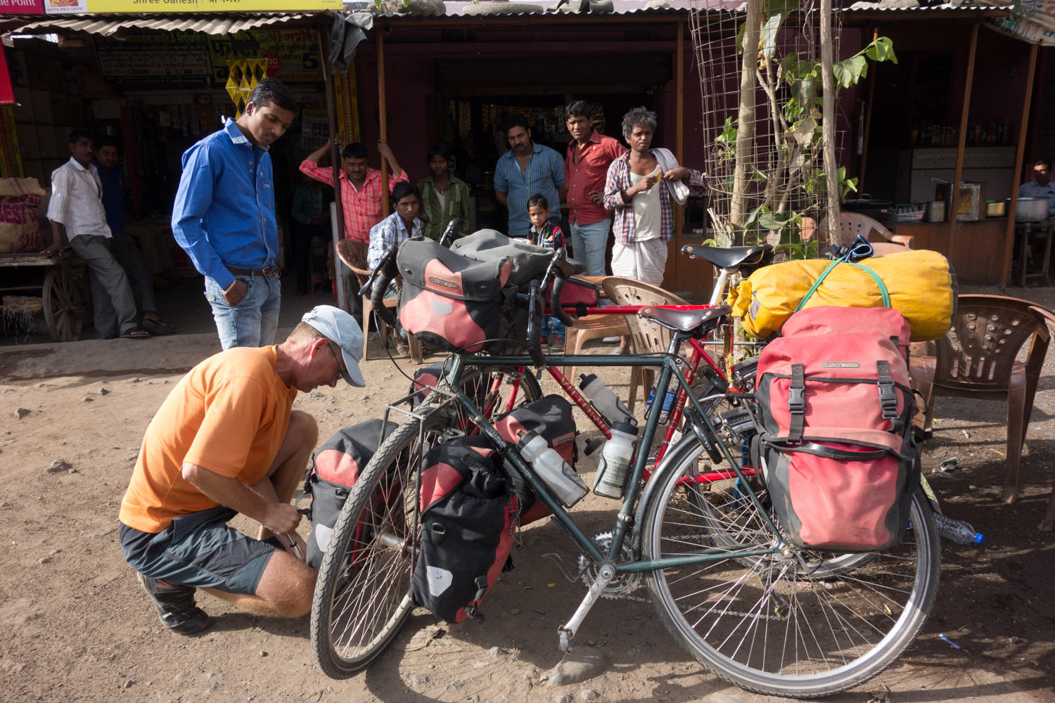 Our first break was a bit further distance than usual, we find a place for chai and have an apple tart that Patrick had found at a bakery yesterday. A bit later we stop for poha. We are now drawing a crowd with people watching and taking pictures of us eating.