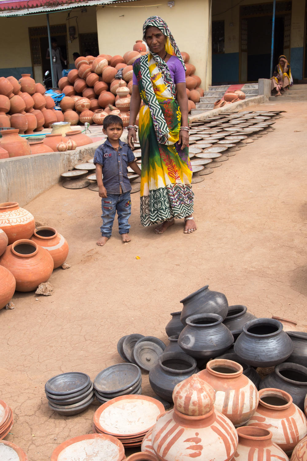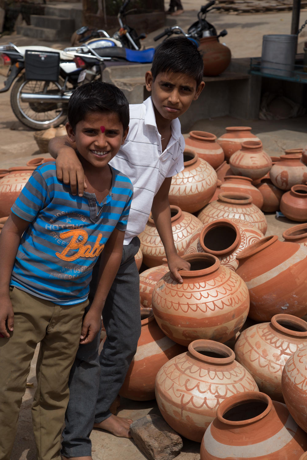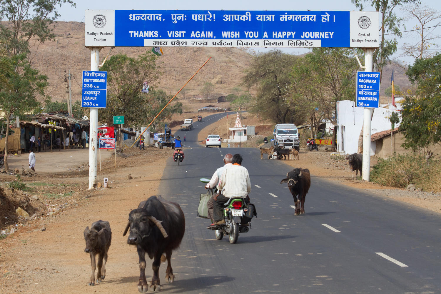 Leaving Ratlam this morning was a lot easier than yesterday's ride into the town. The hotel is next to the railroad underpass and the road lead to the main road bypassing a big chunk of the rest of the town. On this side of town and all the way to Banswara, the road construction is complete. Slowly, almost imperceptibly, we continue to gain elevation then cresting the top, we drop down into a valley. The houses are made of brick and covered by mud, and tile roofs. A stick brush fence to hold livestock (cattle and goats) are at the front of the houses. Women pour milk from stainless steel jugs into the big milk cans strapped to the back of motorcycles, the milk collection system.