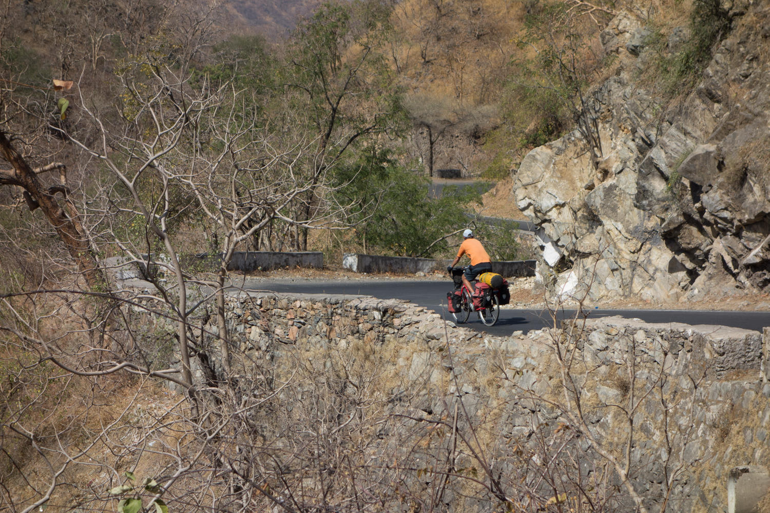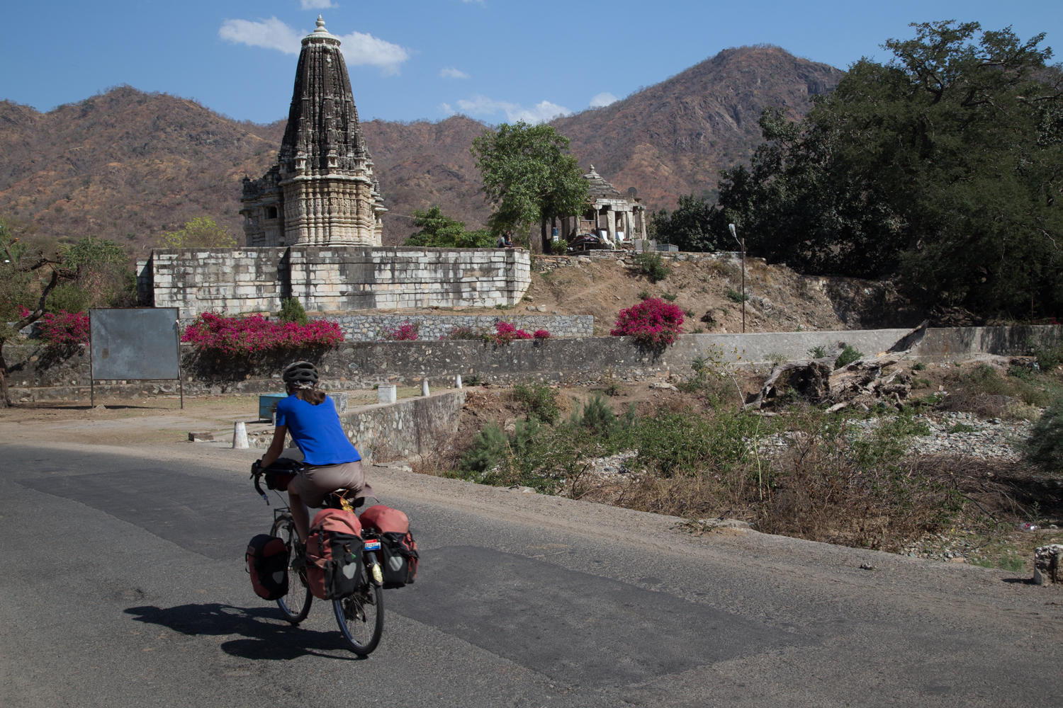 But wow! What a great downhill even with one section after an elephant bridge a small climb. We can see the Temple complex in the valley nestled amongst the brown rocky foothills of the Aravalli mountain range.