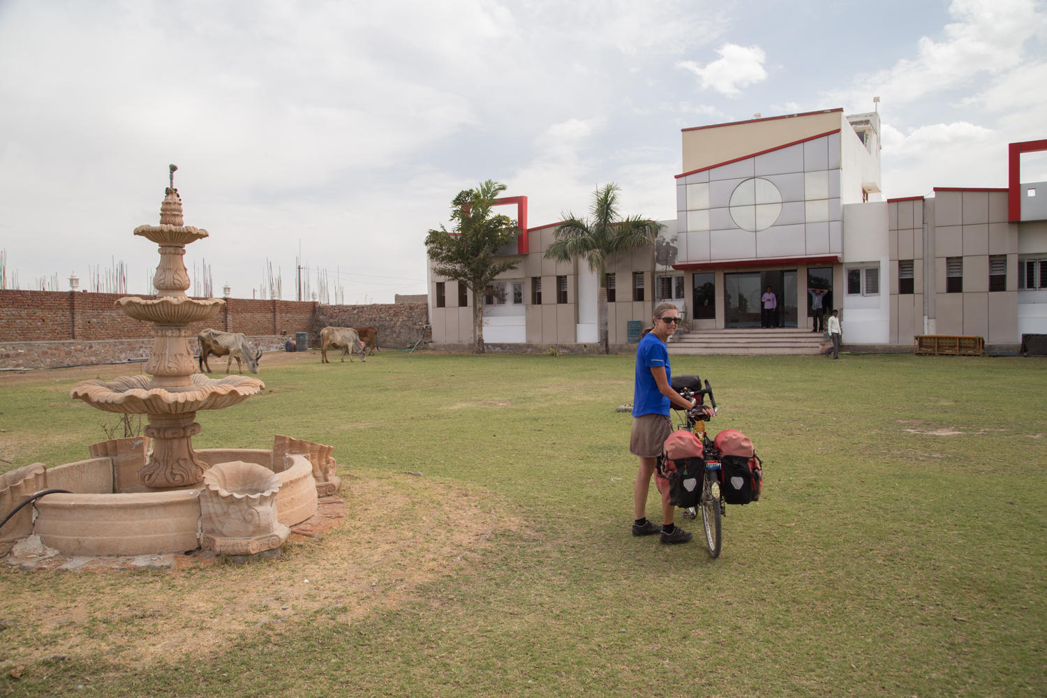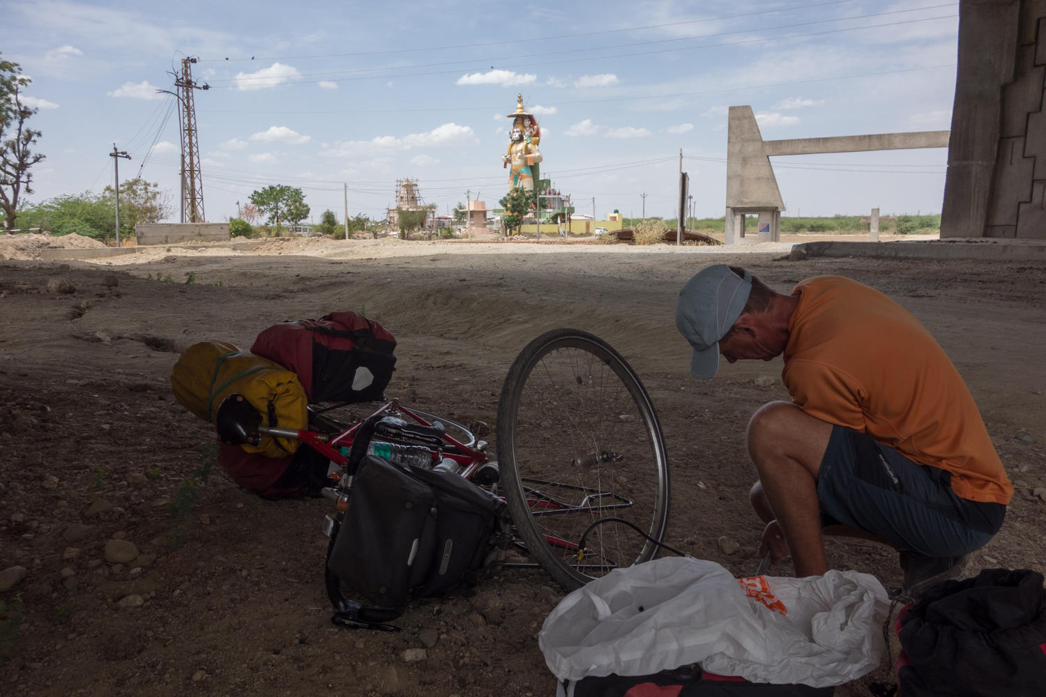 We decide to take the new bypass road around Pali and aim for a hotel on the other side of the town. There is an overpass for the railway that we don't take because the hotel is on the other side of the road. Only the road ends under the overpass at the railway tracks. We push and lift the bikes over the tracks, and Patrick's tire goes flat. We are almost to the hotel, Arawali Palace.