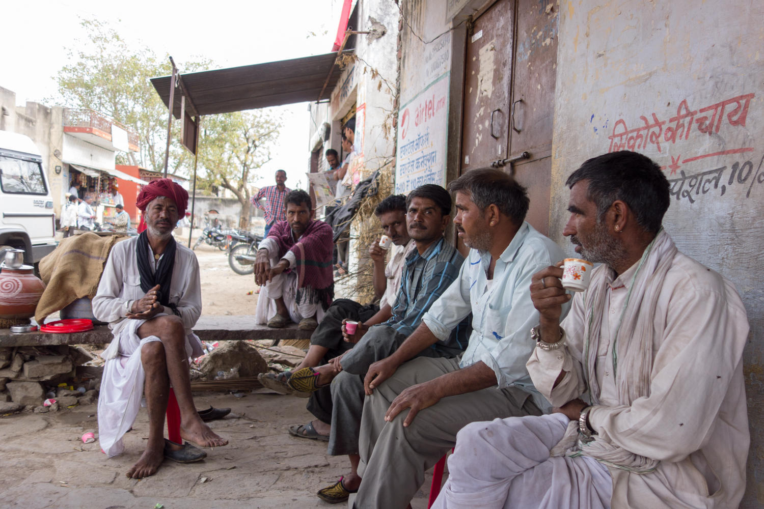 In Gola, we stop for chai and eat cheese crackers, there's no food at the stalls. Lots of photo opportunities though of men wearing turbans.