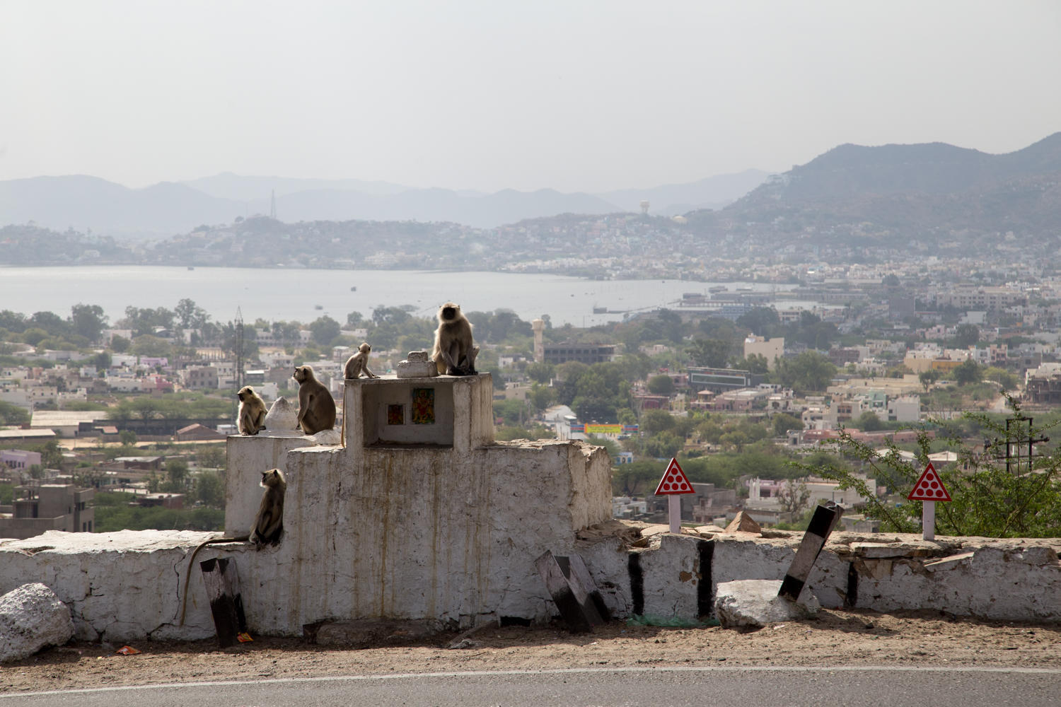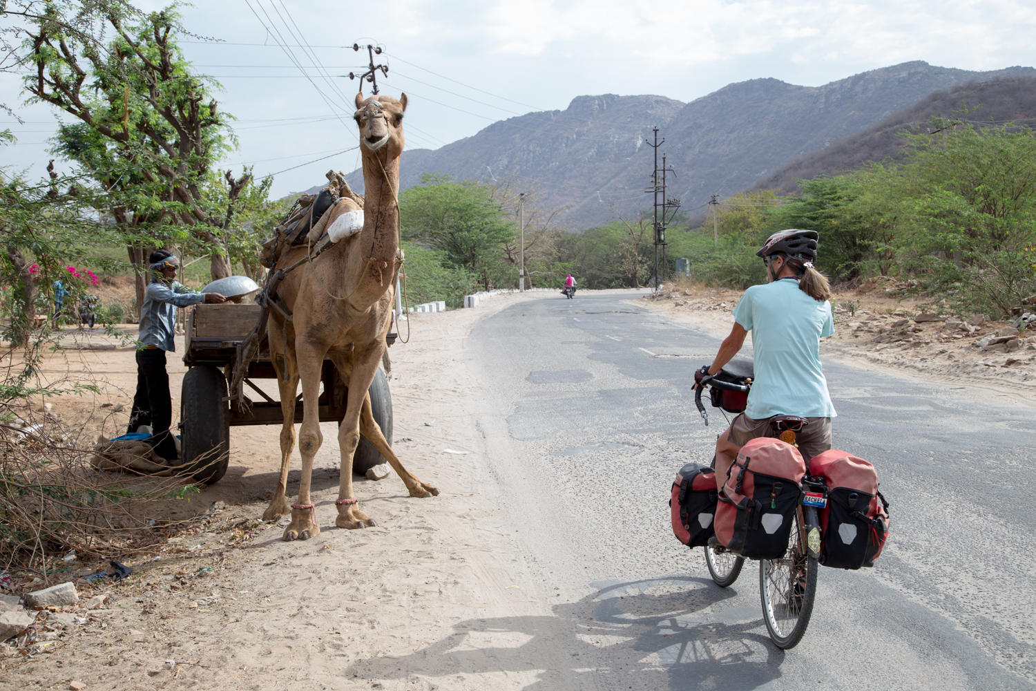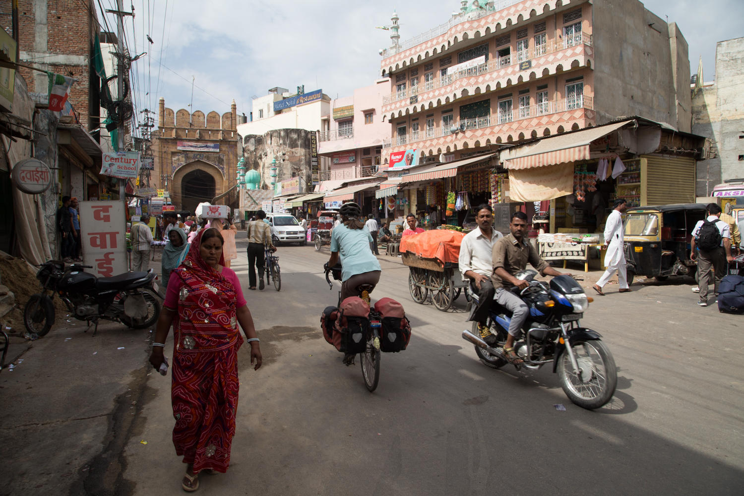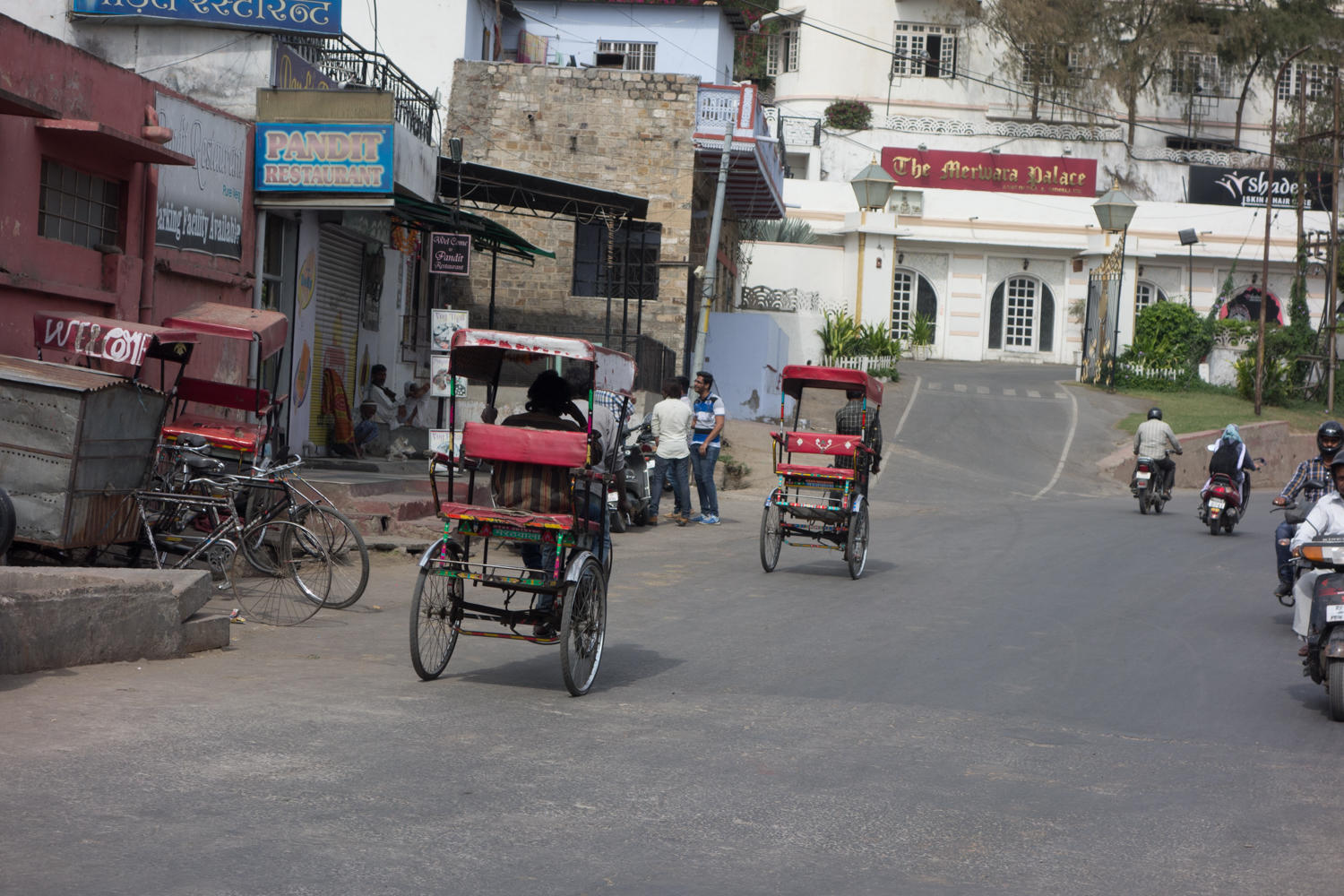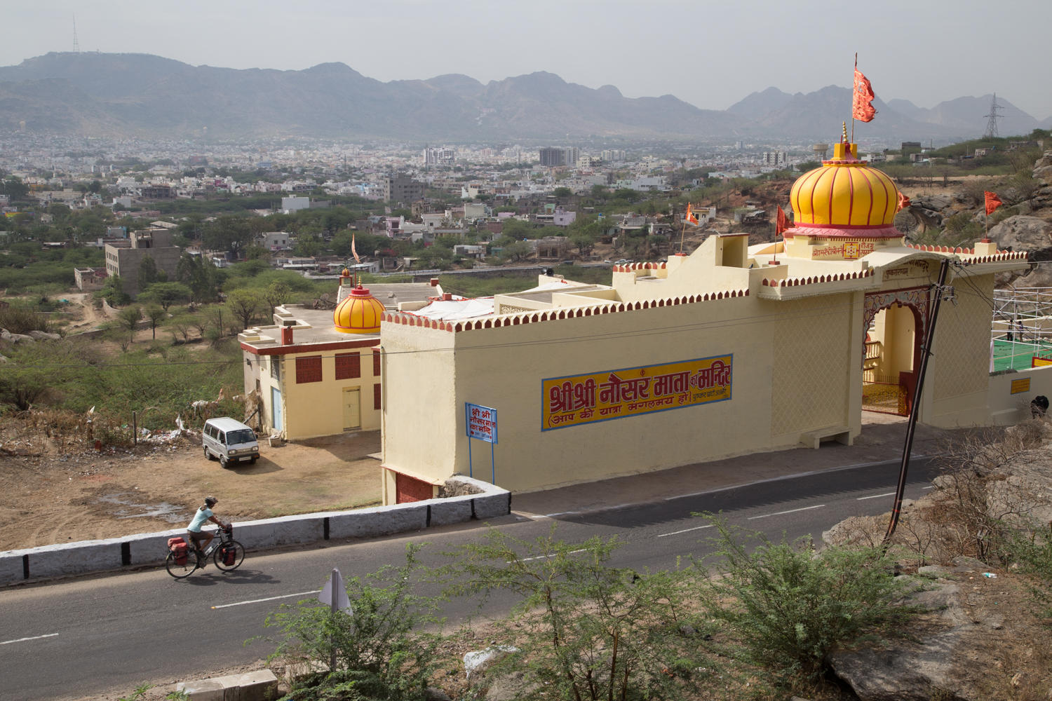 Fairly quickly, we get over the hill called Nag Pahar, the snake mountain and see Ajmer by Ana Sagar lake. The town is dusty, plenty of motorcycles with most of the drivers wearing helmets! And bike rickshaws and horsedrawn passenger carts. Weaving through all the traffic, we've been noticing since being in Rajasthan, the drivers are more aggressive. GPS leads us to Sagar Dargah Bazar street just fine, but we leads us astray in finding the side street where the Hotel Baba Palace is located. We wander through a twisting back alleys and finally reach the hotel. Easy check-in, Patrick had pre-booked the room, an elevator and staff take our bags up, bikes in secure garage. Add to the list a hot shower, all a cyclists wants or needs.
