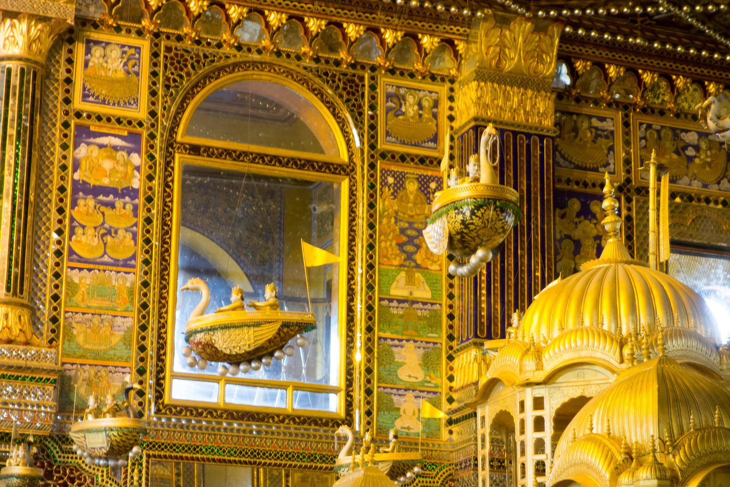 We walk to the Nasiayan Temple or Red Temple. The entrance fee to the main chamber with the display of Jain's mythology and perception of the universe is the same for everyone 10 rupees, not like other tourist attractions where foreigners pay more. Shoes are handed off to a man by the shoe rack and when leaving Patrick gives him 10 rupees.