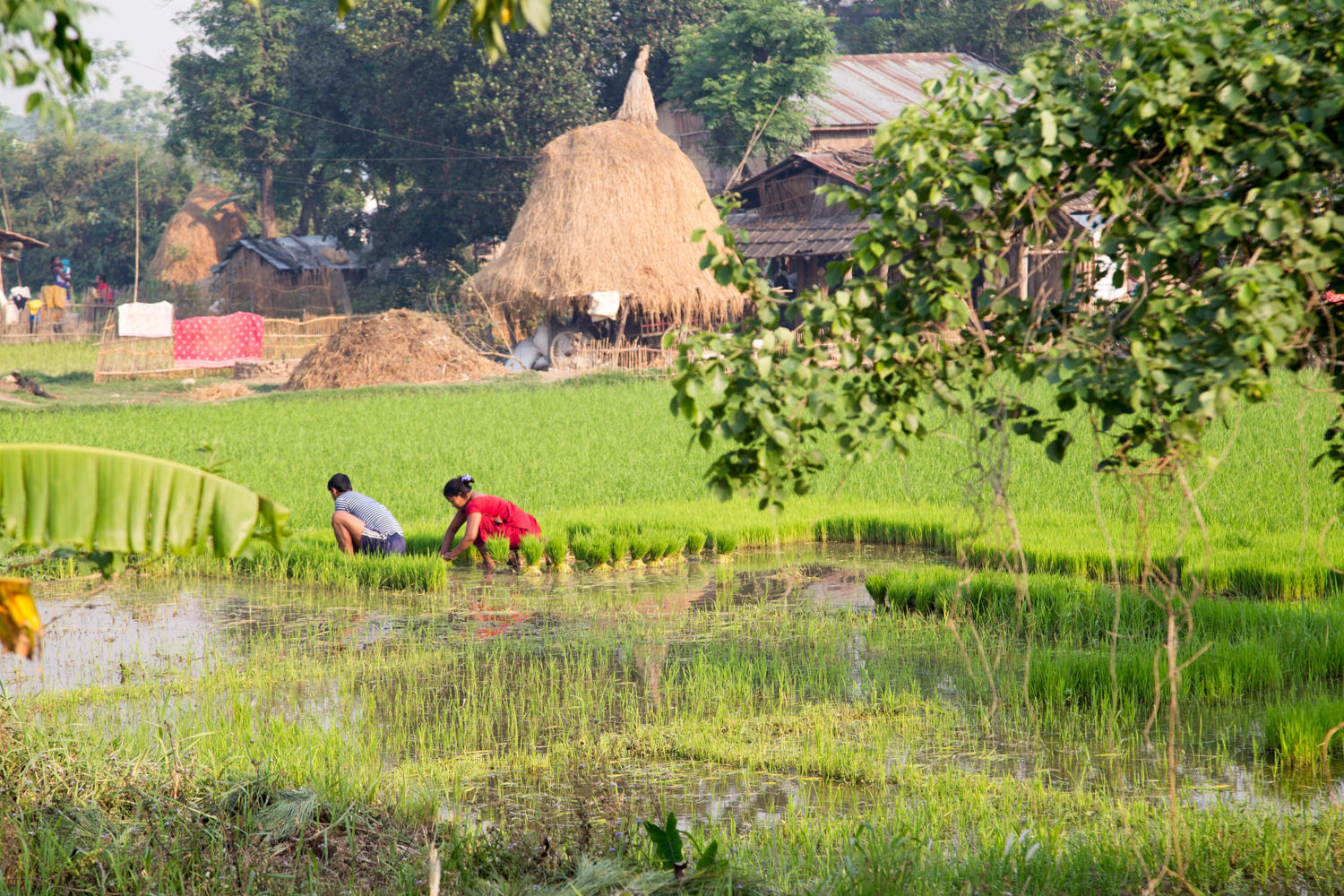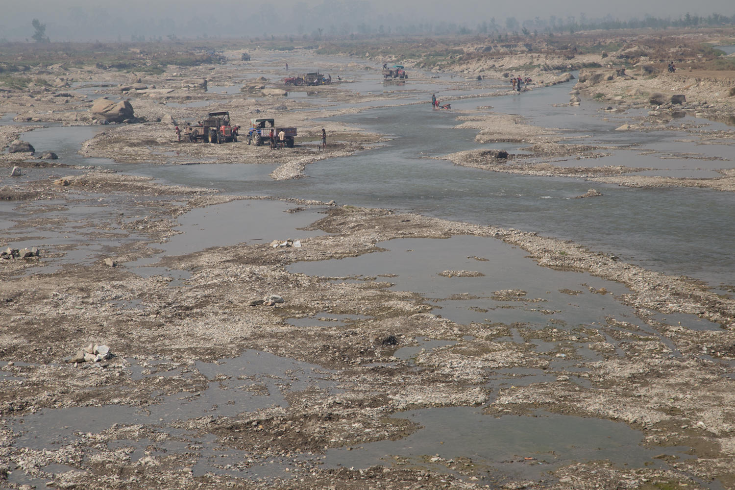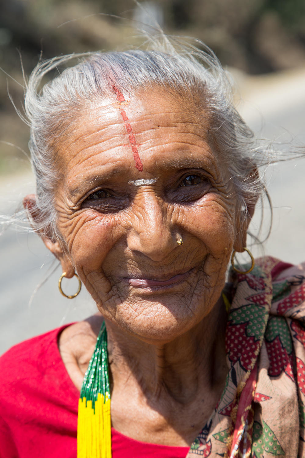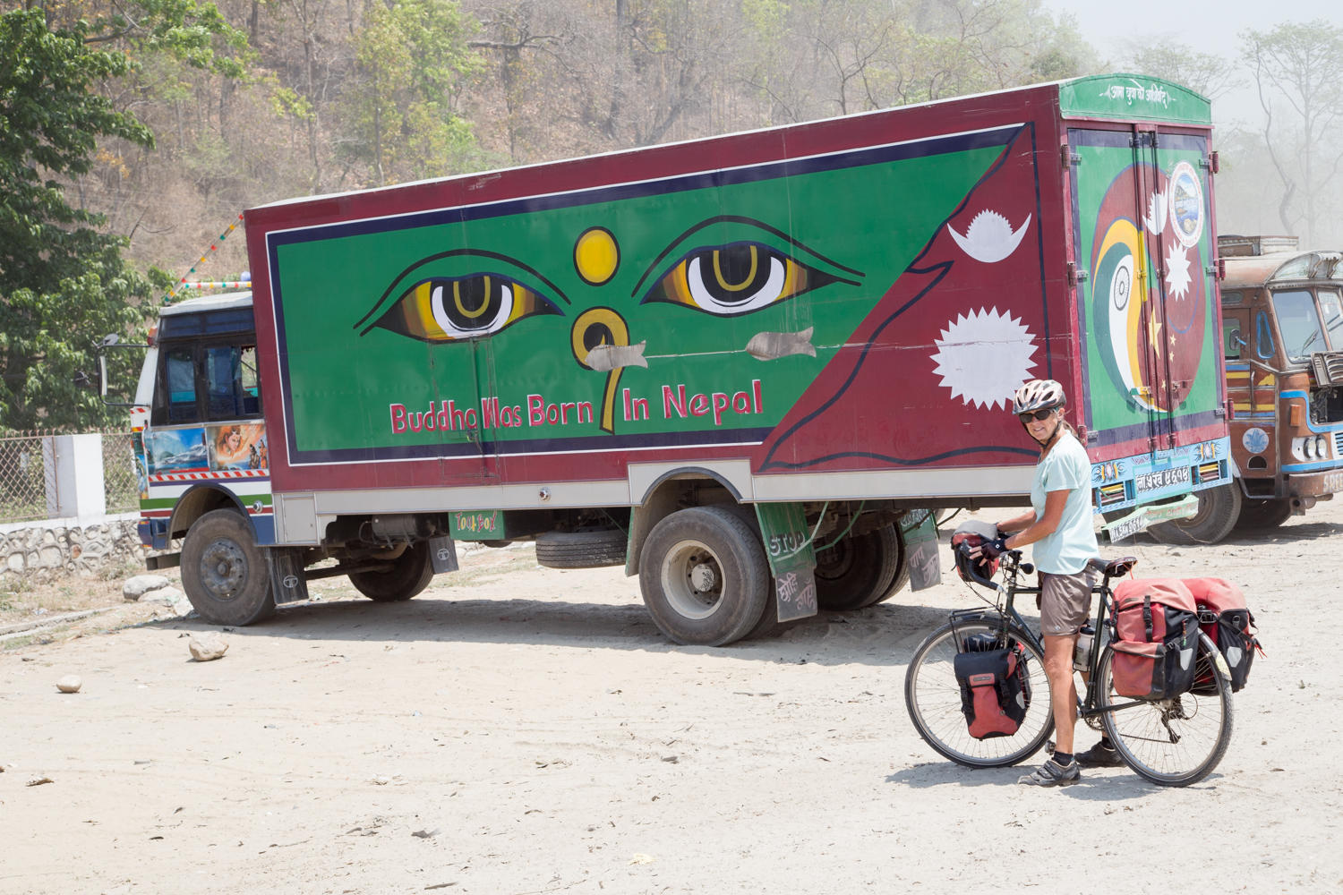 Gone are the wheat fields. Instead we see corn growing and flat rice paddies on both sides of the road. No longer are people carrying loads on their heads but using a forehead strap, and leaning forward with the load resting on their backs. Gradually we start seeing more and more prayer flags. The east west highway follows the East Rapti River, our direction is upstream so we are slowly gaining altitude. One section we go through into forested and terraced hills.