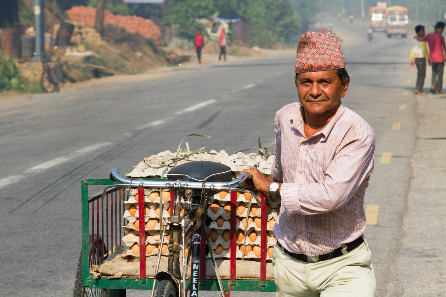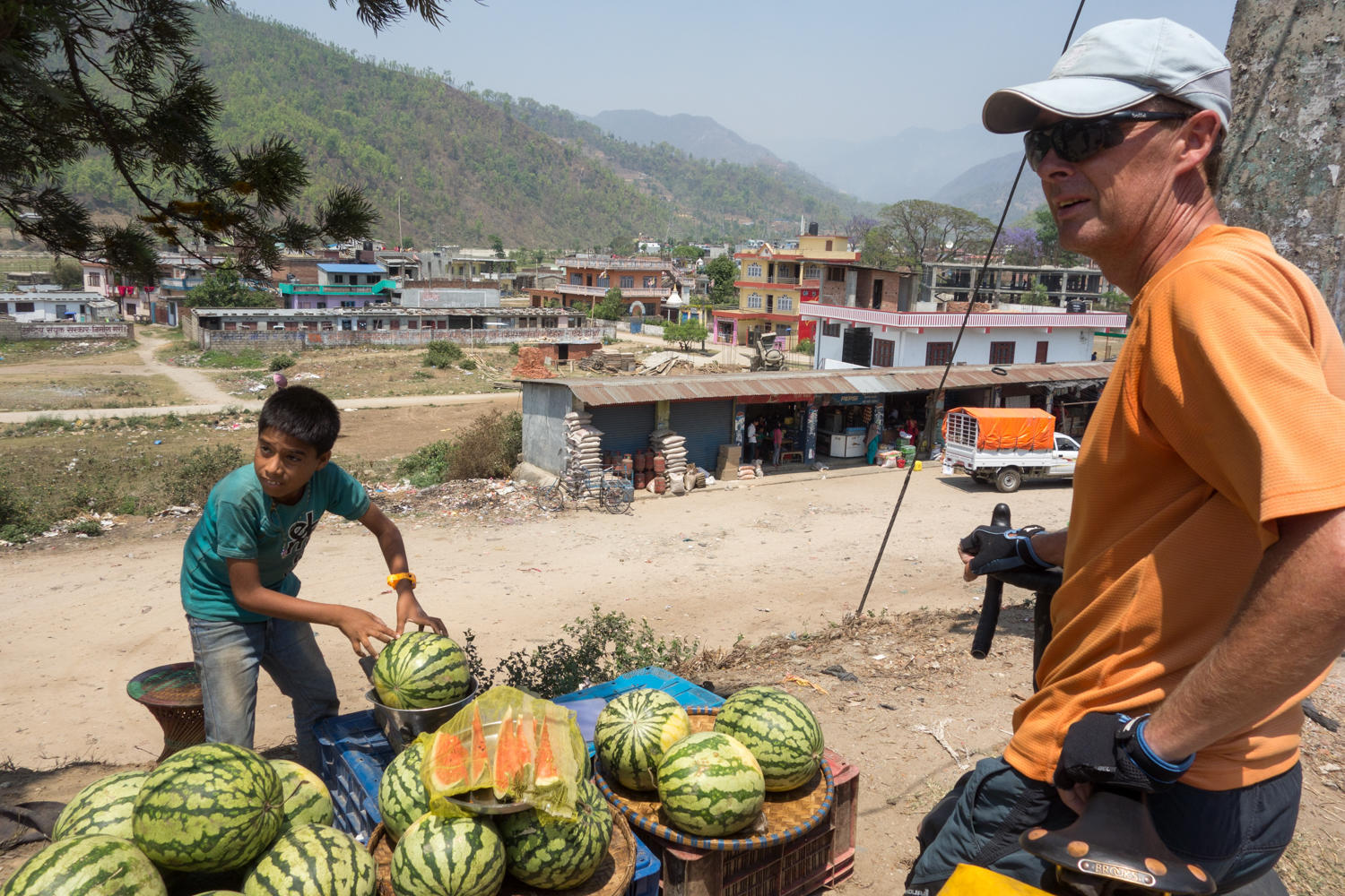 Still few food stalls, except in concentrated areas of bus and truck stops. We are having to adjust from India where there were plenty of roadside stalls. Finally there is a shop and next to it a table and people sitting outside a kitchen area. Patrick asks "chai?" There is a nod, "yes", and we park our bikes and take a seat on a bench. We are not absolutely sure if this is really a shop, looks more like family's outdoor kitchen. We enjoy chai eat cookies and pay then on our way again wondering what the family was saying in Nepalese when looking at us.