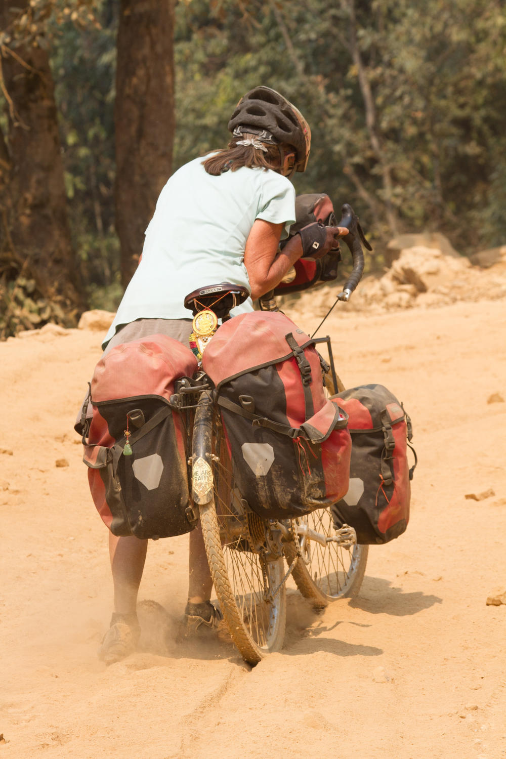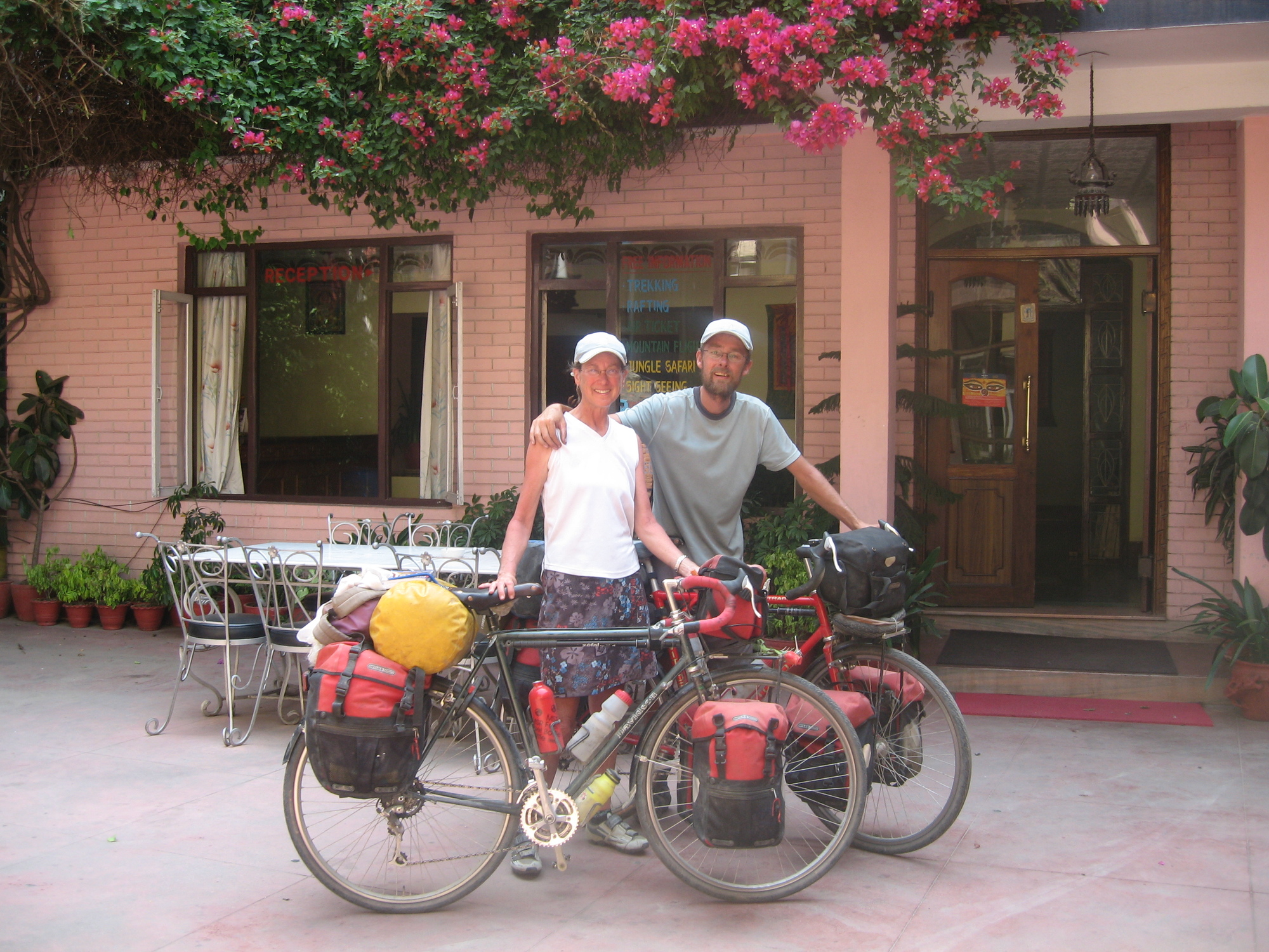 "Not sure what or why I was thinking the downhill would be different" Rachel says wanting to cry, as we look at the same road going down 12-15% and even worse surface. It's slow going, the steepness of the grade is difficult for Rachel to brake and while Patrick could ride his front wheel rim became very hot from braking. We both walk. Finally to the main road into Kathmandu, the traffic is heavy and we have 5-6kms still to the area Thamel.