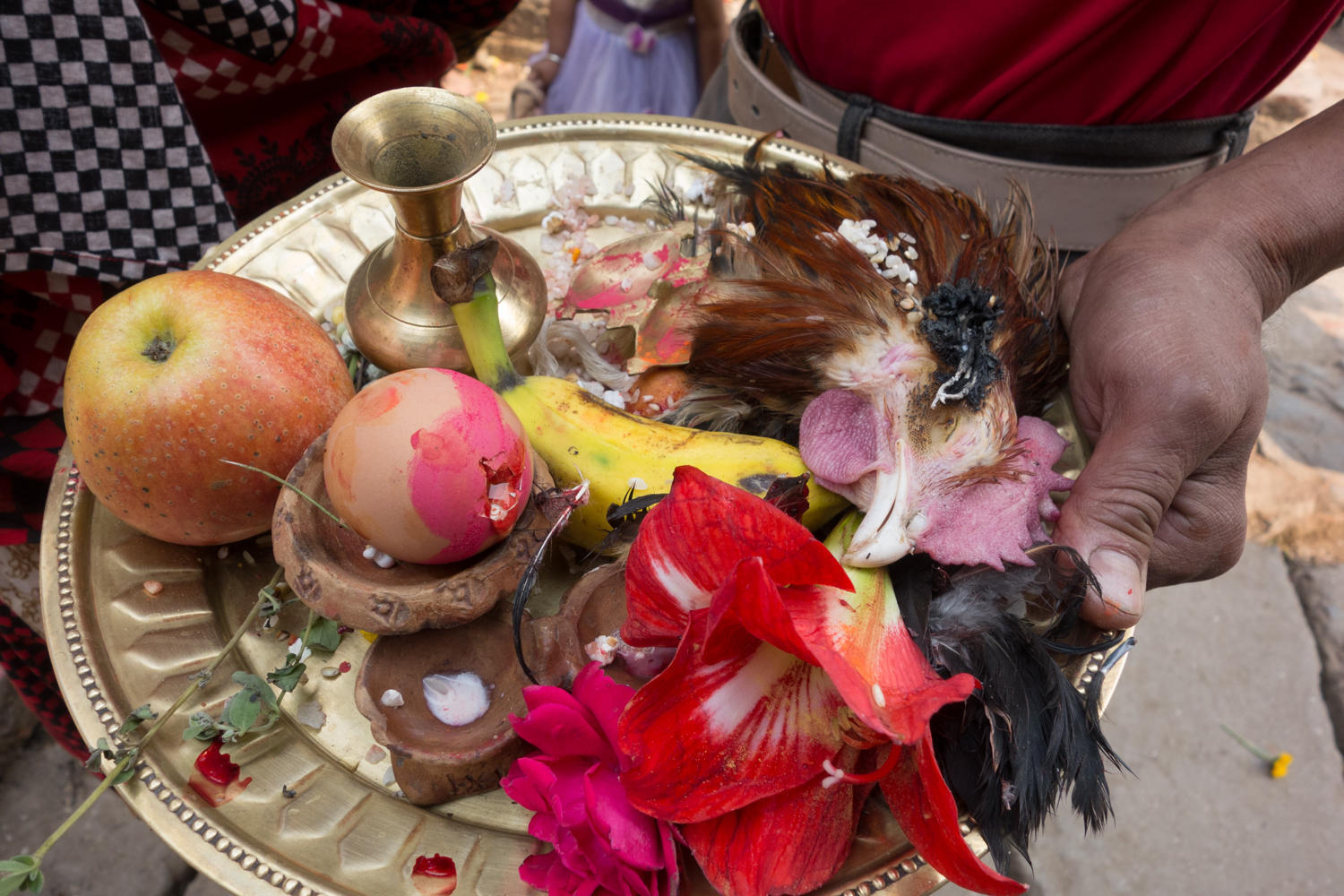 Mostly we just wandered around watching the local people make a pilgrimage around to all the temples. Women are dressed in red carrying platters with assorted offerings like rice, vegetables, flowers, eggs and chicken heads. All covered with a crocheted doilie until they reach the spot to make the offering. The crowd keeps growing, there are girl drummer groups and boy drummer groups walking the streets contributing to the festive atmoshere.