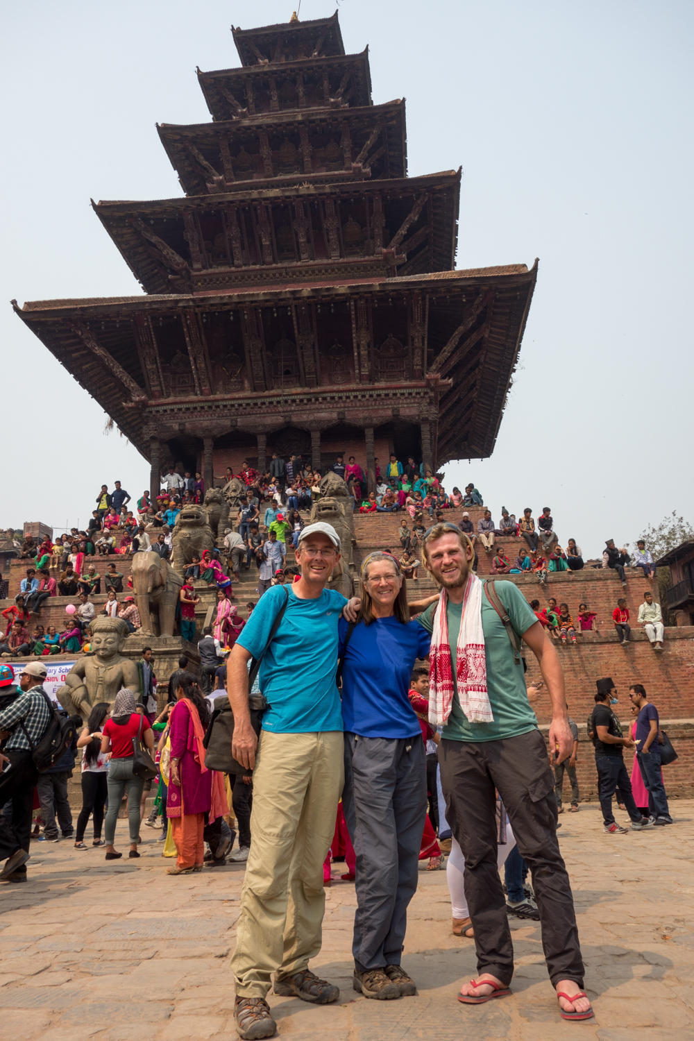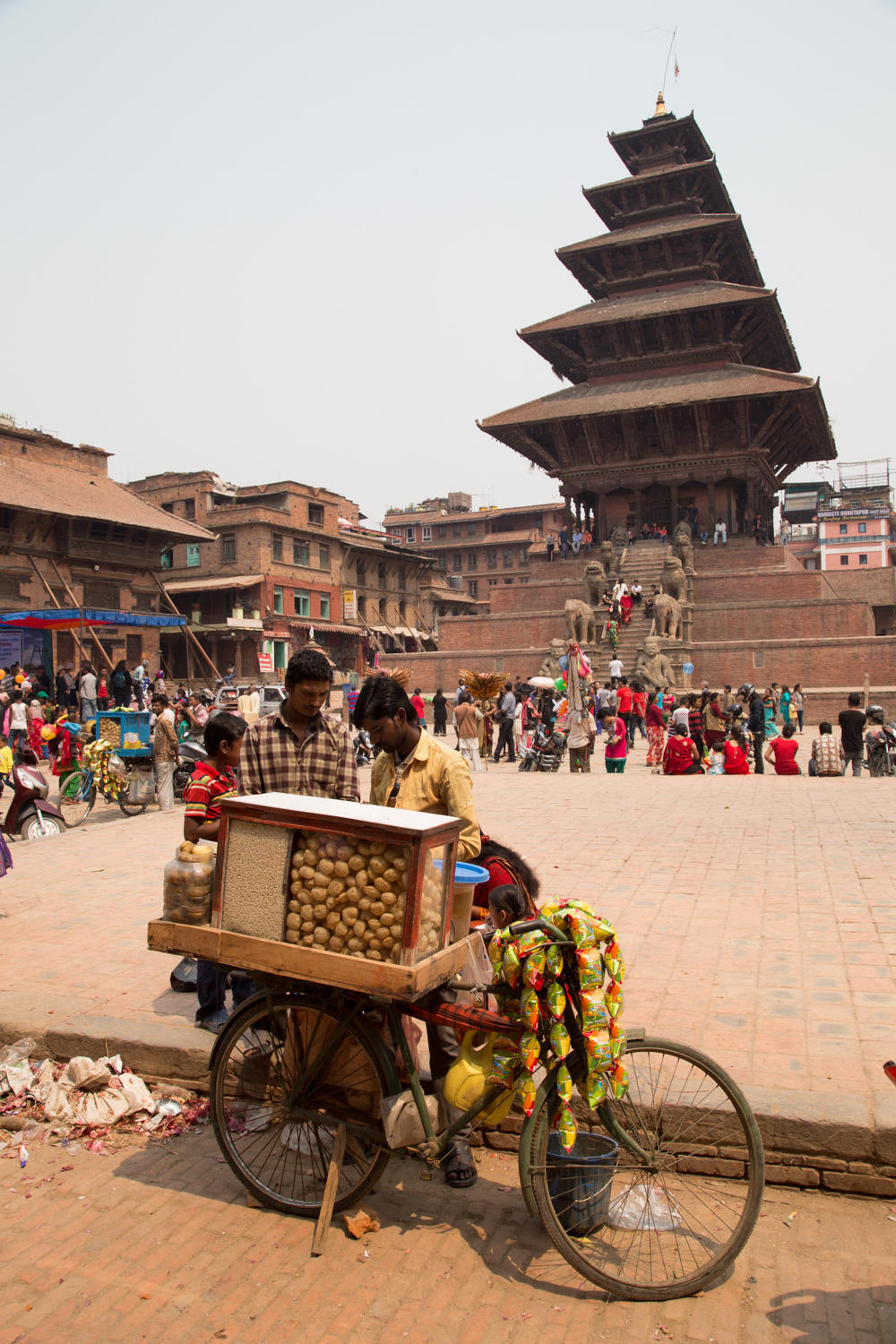 We take the local bus to Bhaktapur. A five day Nepali New Year Celebration is underway with main events happening in Bhaktapur. The 12km bus ride takes about an hour. The conductor hangs out the open side door hawking for additional passengers, collecting the fare and making sure the bus is fully loaded at all times. We get off the bus near one of the entrances and pay 1500 rupees each (15 USD) to walk up to Durbar Square, Taumadhi Square and Dattatray Square.