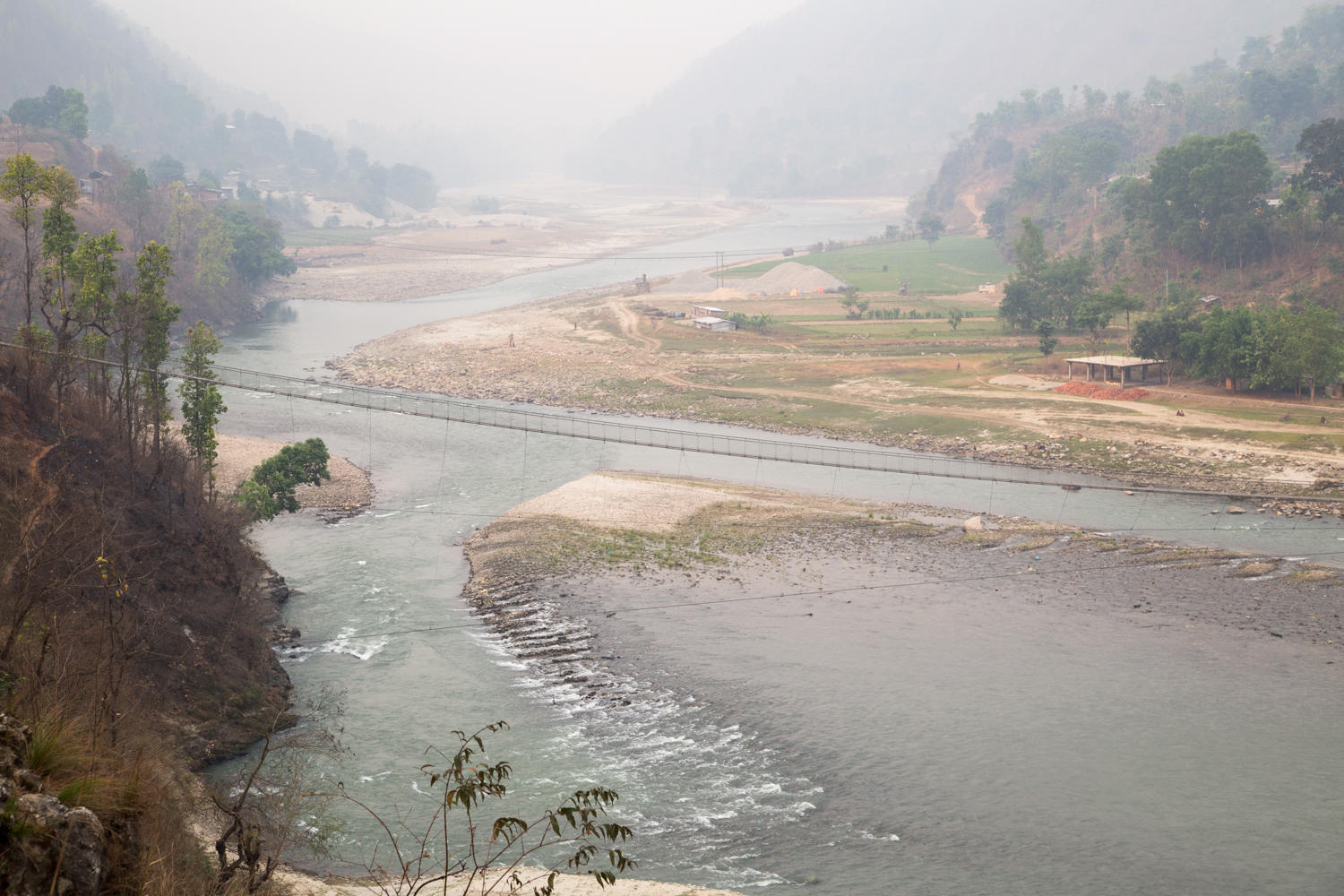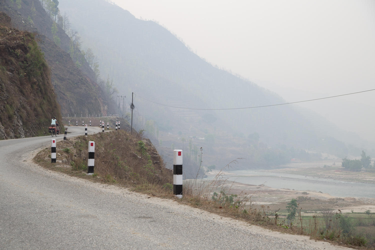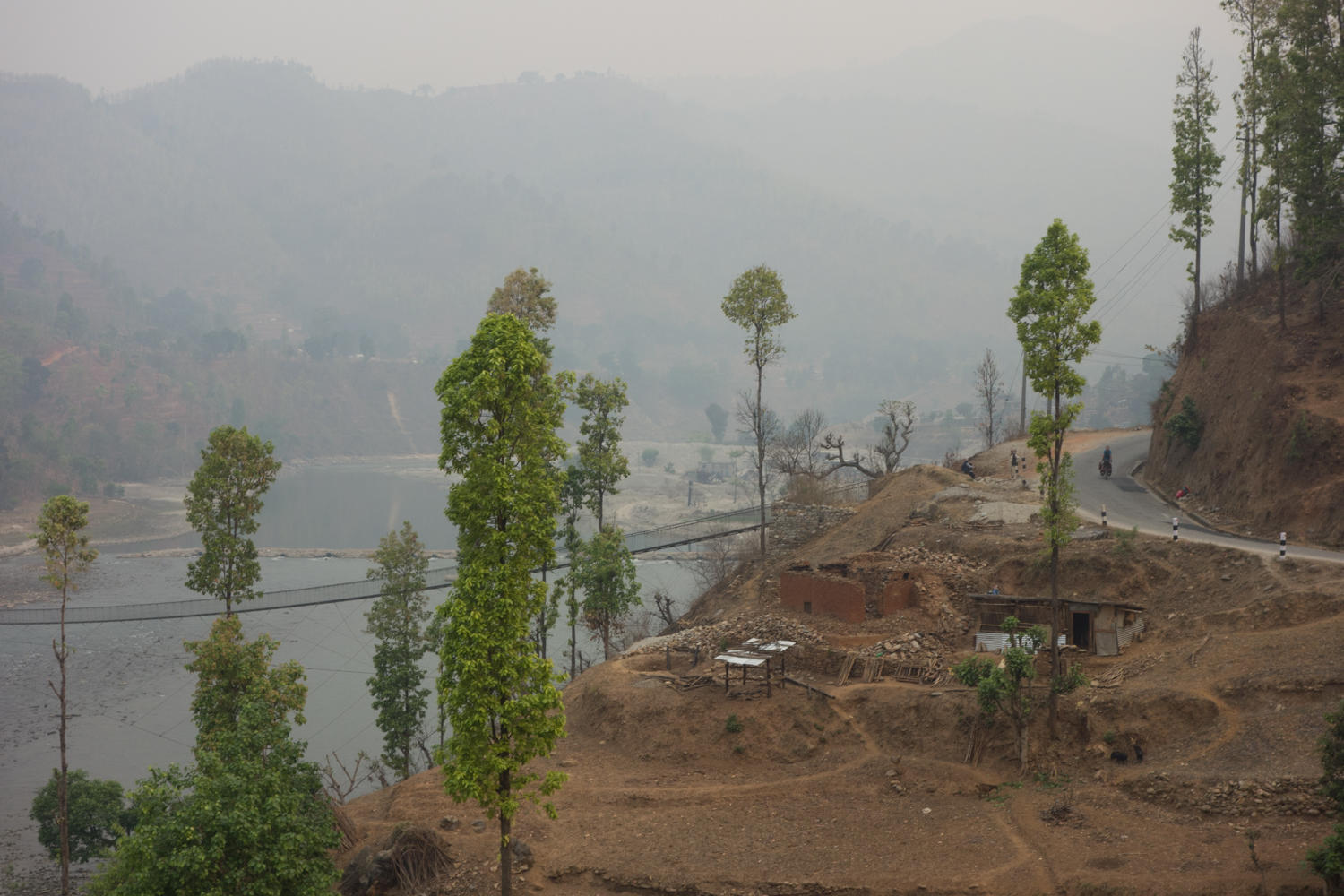 The air is still very hazy, the undulating road is relatively quiet for the first 20 km. As we cycle following the Trishuli River downstream, we see many suspension bridges across the river. When we stop for break we eat crackers and the last of the laughing cow cheese we bought in Kathmandu. A woman comes into the shop and buys cigarettes and a lighter. This has been a surprise seeing so many women smoking.
