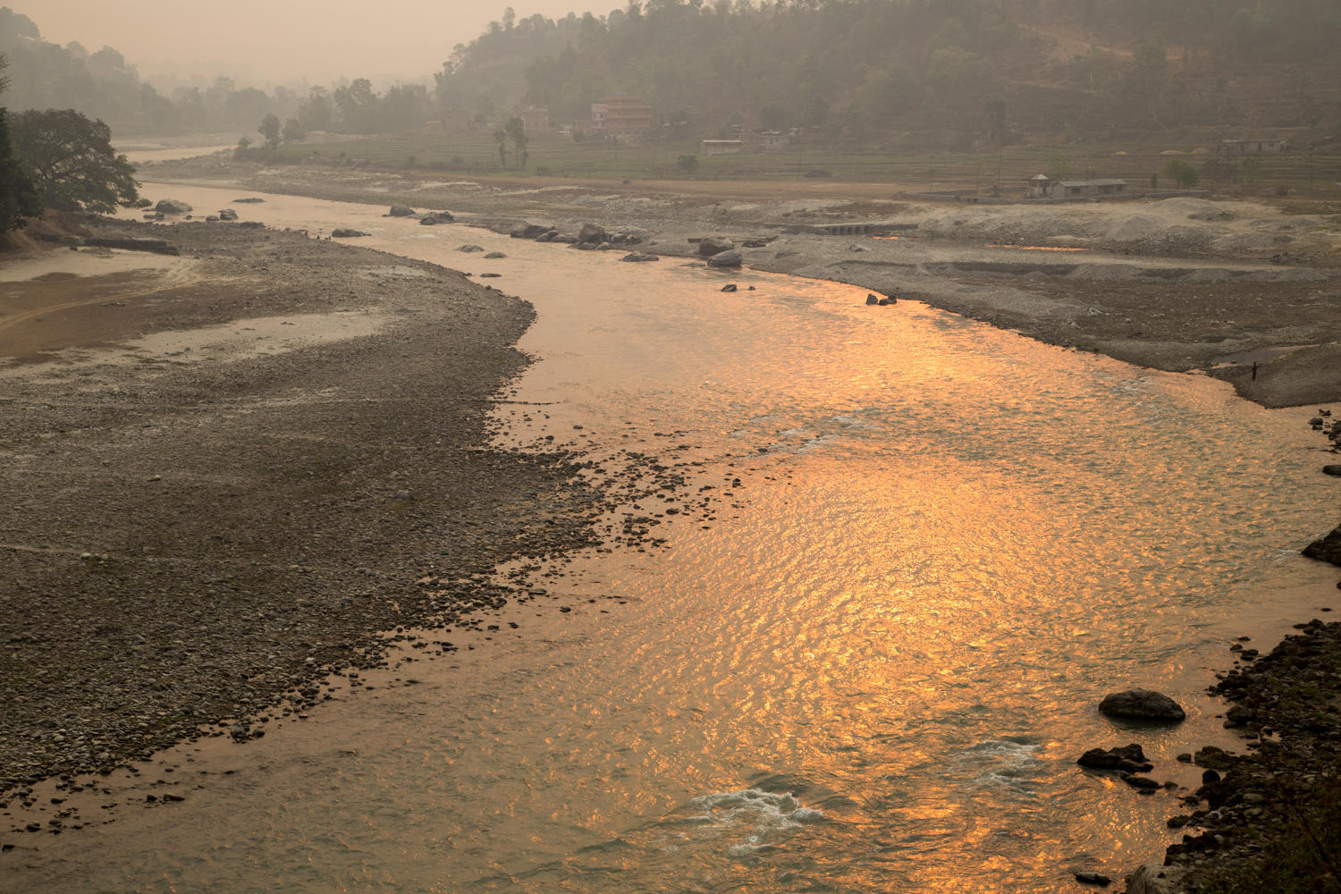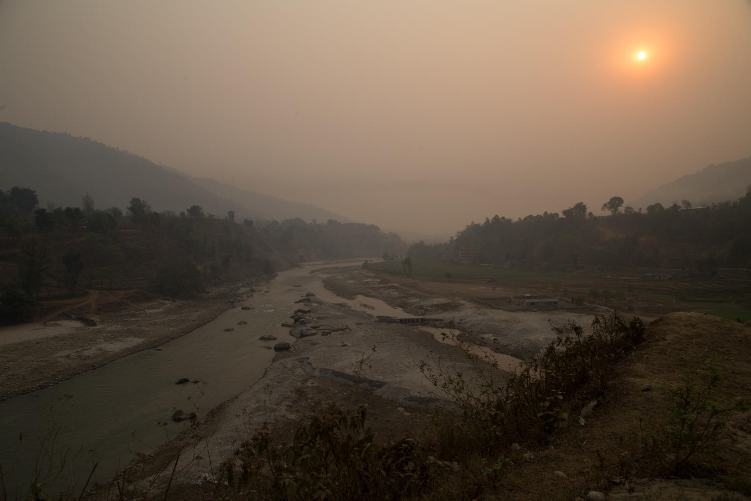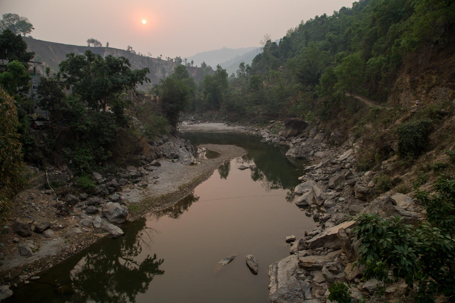 The air is still very hazy, the undulating road is relatively quiet for the first 20 km. As we cycle following the Trishuli River downstream, we see many suspension bridges across the river. When we stop for break we eat crackers and the last of the laughing cow cheese we bought in Kathmandu. A woman comes into the shop and buys cigarettes and a lighter. This has been a surprise seeing so many women smoking.