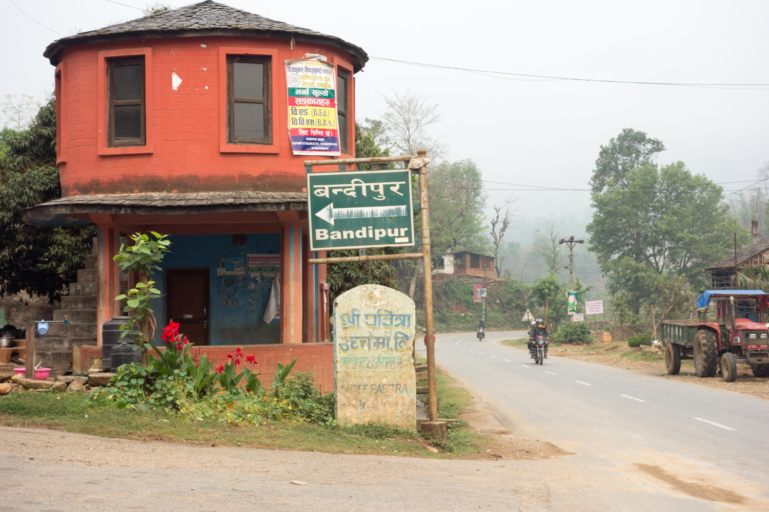 Turn-off to Bandipur. We were expecting a glut of vehicles at this junction all itching to take us up the hill. Instead we have to back-track about a kilometer to town and arrange a car.