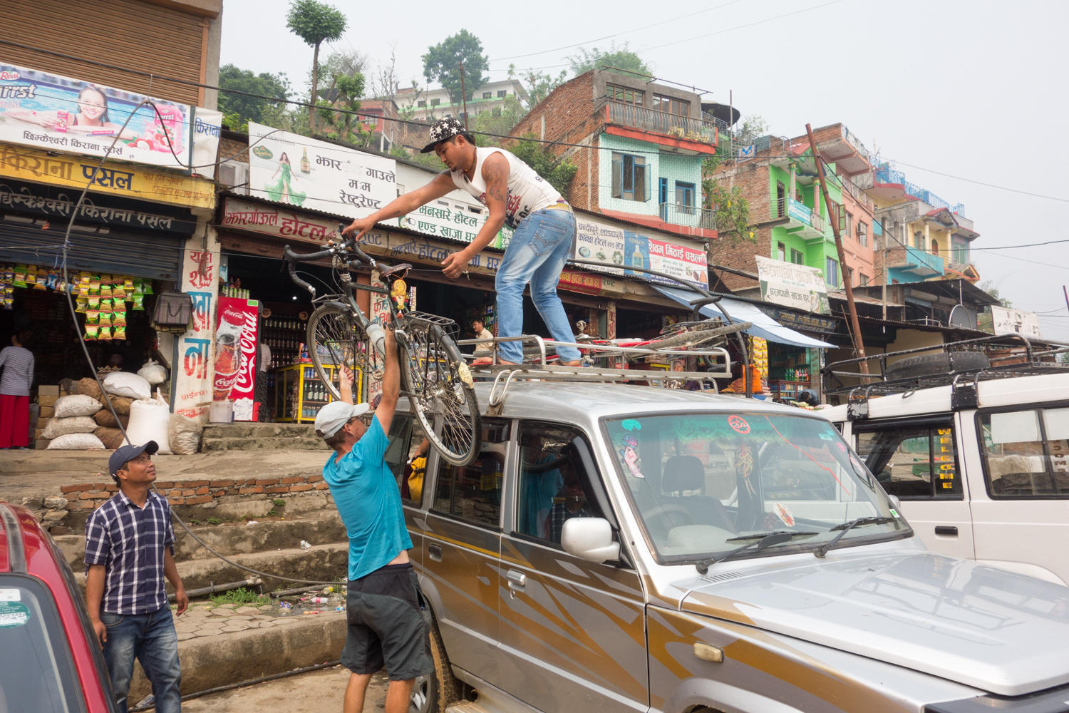 After some negotiations we agree on 800 rupees for the 8 km drive up the mountain. Bikes go on the roof, our panniers in the back. We could have saved some money and taken a public bus for about 50 rupees each, but we would probably owe some extra money for loading and unloading of the bikes, and it is always a hassle dealing with all our luggage pieces making sure nothing gets lost in the melee.