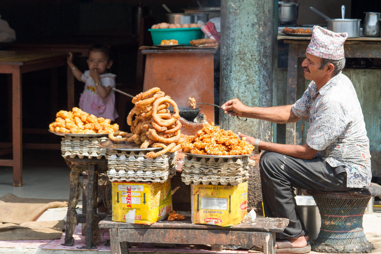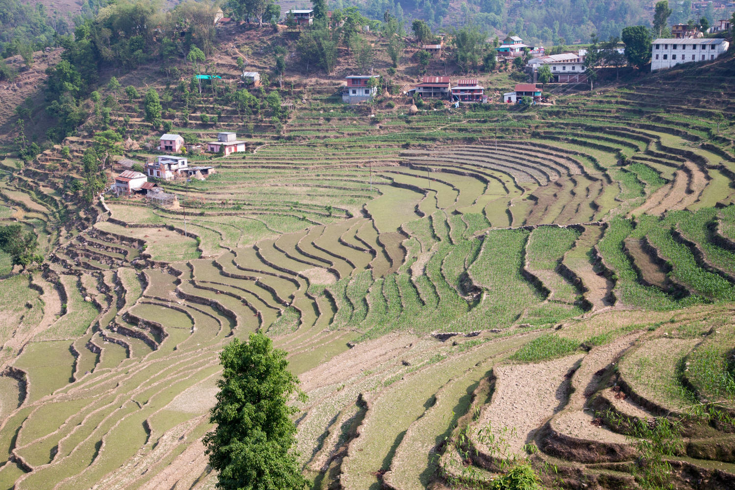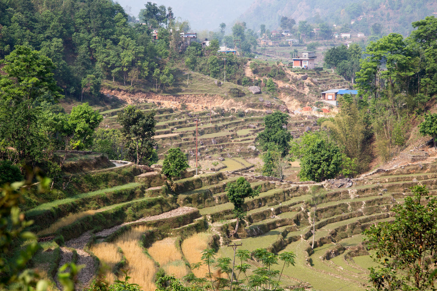 The day started early and we easily connect to Siddhartha Highway and begin our first climb of the day. Traffic is light, the air hazy so again no view of the mountains as we leave town still the scenery today is enjoyable. Forests, steep hillsides with terraces of corn, deep valleys, small settlements and villages, and friendly people. We stop for a break at a truck stop on a hairpin curve and eat laughing cow cheese on brown bread.