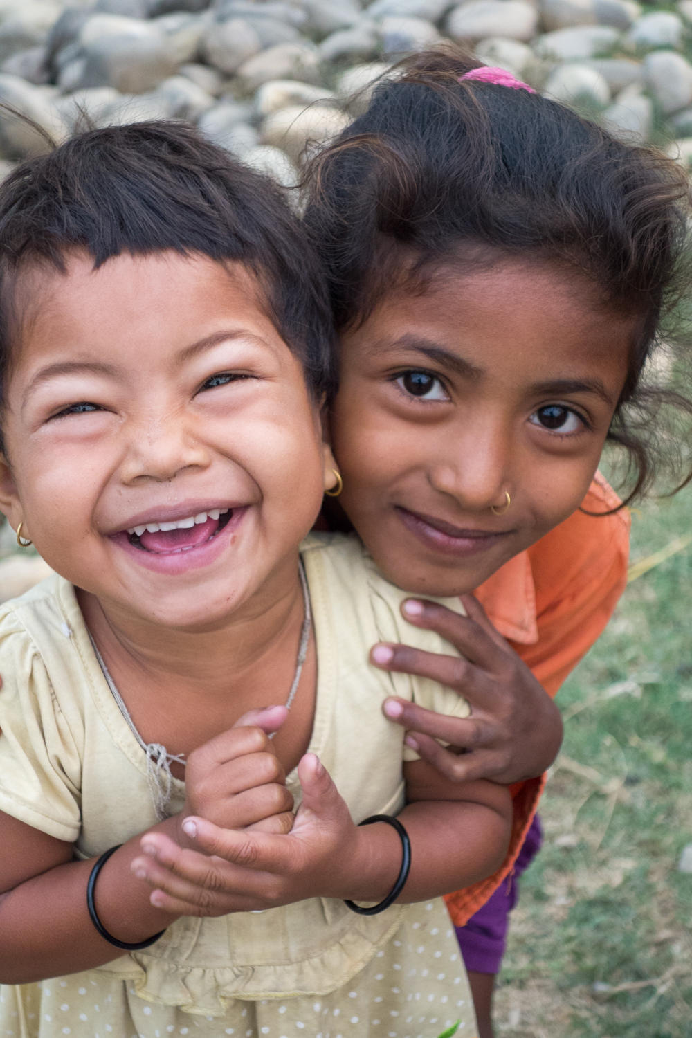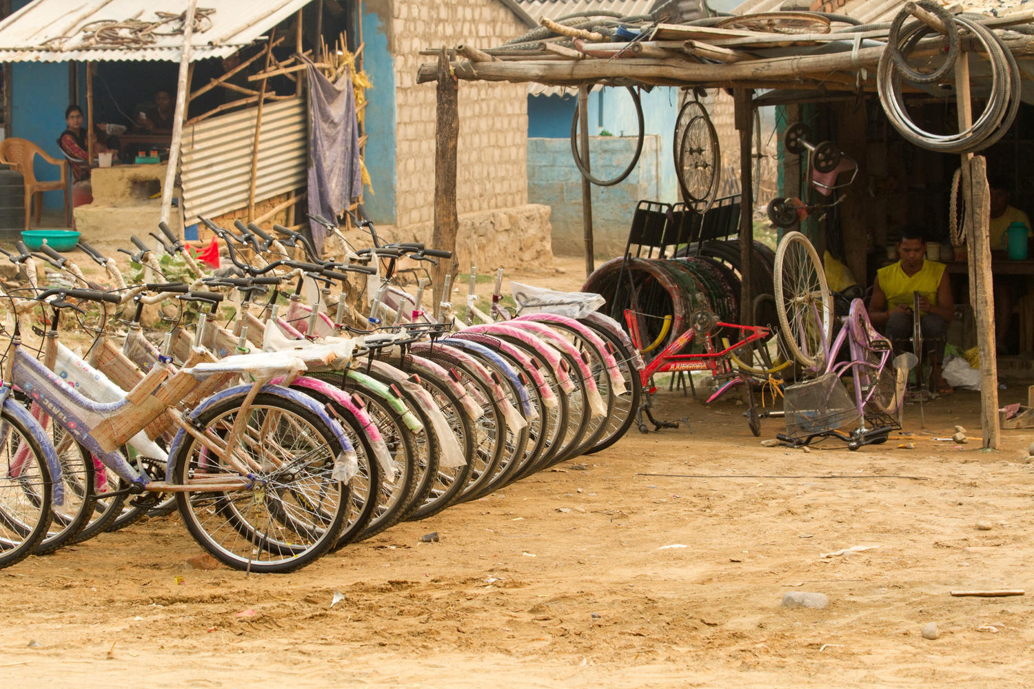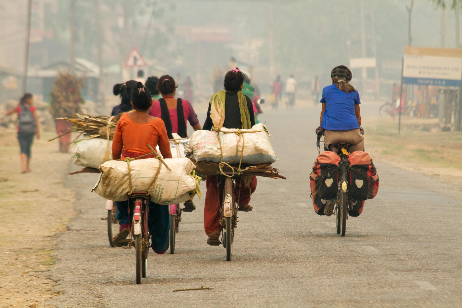 At Chisapani, we cross the suspension bridge and we take our first break. The samosas don't set well with Patrick, too greasy for so early in the morning. The road turns South and we almost have a tailwind for awhile. We follow what looks like a delta, the river with braided channels and much activity in the river bed of piling sand and harvesting river rocks. We are passed by tractors pulling wagons loaded with rocks and throughout the day see how the rocks have been piled up along the side of the road. Patrick thinks maybe either an irrigation canal, roadside ditch or widening the road is being built. This road as with many other Nepalese roads, are built high like a dike to prevent washouts and flooding.