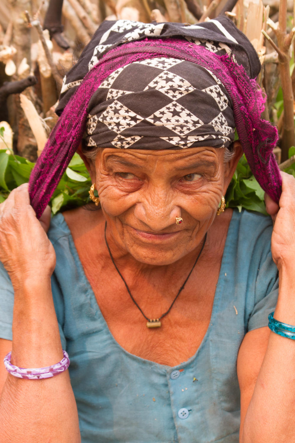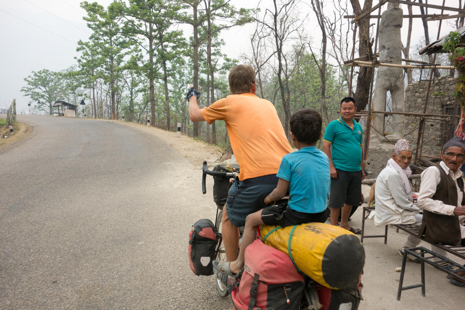 Back to the main road, the road profile continues much the same except with more flat hills over the course of the day. But first the road goes east-west, then north and there is a headwind. We are still in the National Park the road surface good yet with fresh chipseal taking revenge to bus windshields. Throughout Nepal we have seen many a bus with windshields taped over cracks or missing completely. Today we passed a bus where the windshield is broken and bus driver and conductor are barehanded pulling all the broken glass out on the ground. The next few kilometers we see three more glass piles, so we bet a few more buses are without windshields.