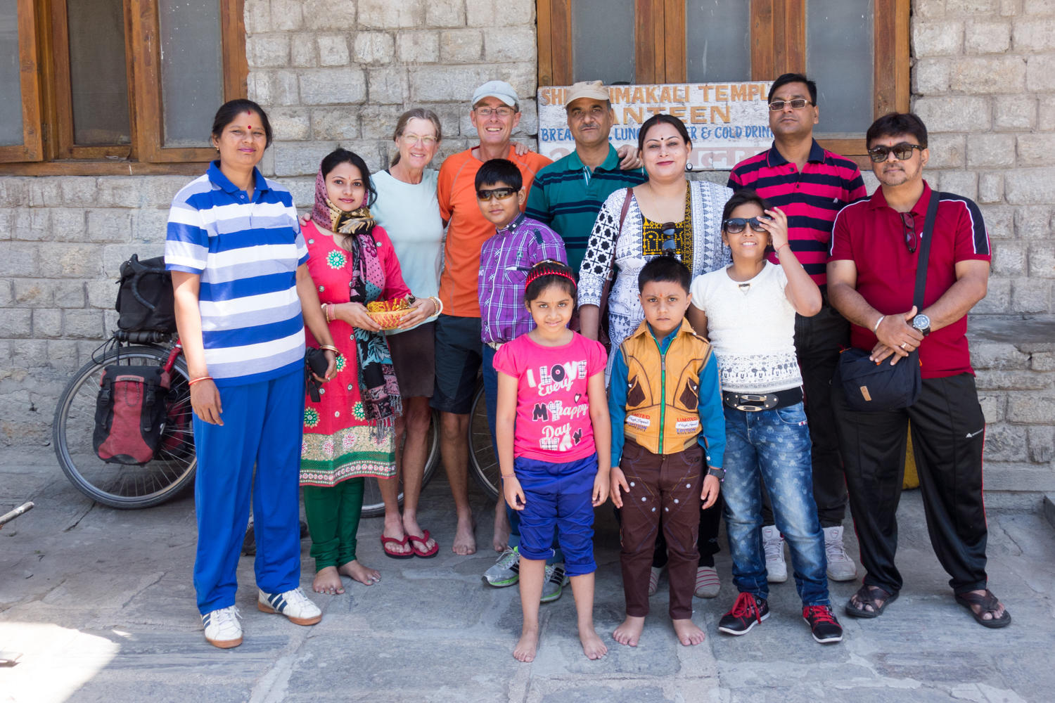 We survived the harrowing ride, as the driver took the twists and turns speeding up the mountain. We are dropped off at the temple guesthouse and are hoping there is a room. There is a room available but we have to wait for it to be cleaned. A family from Calcutta are interested in us and many group pictures are taken. This is what cycle touring is all about, meeting people.