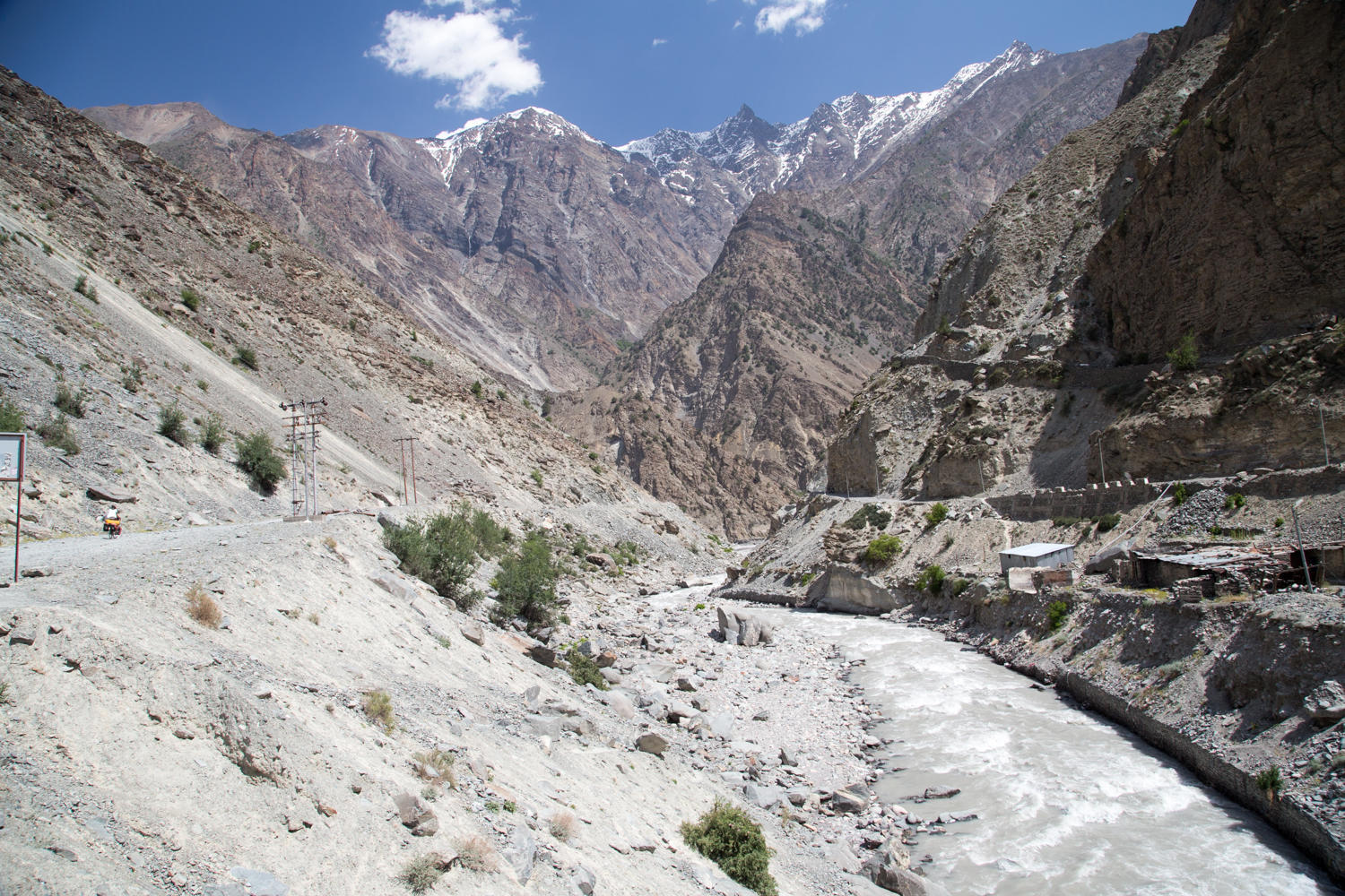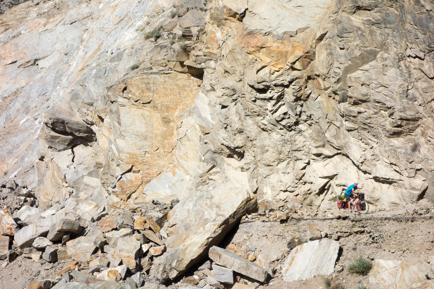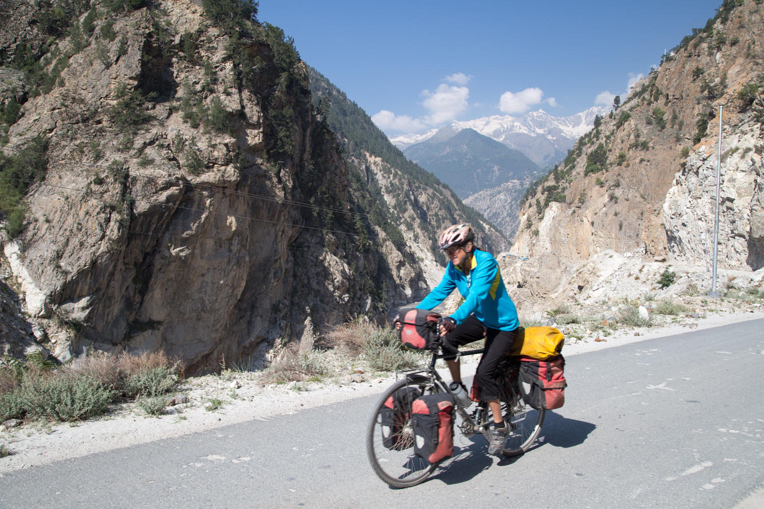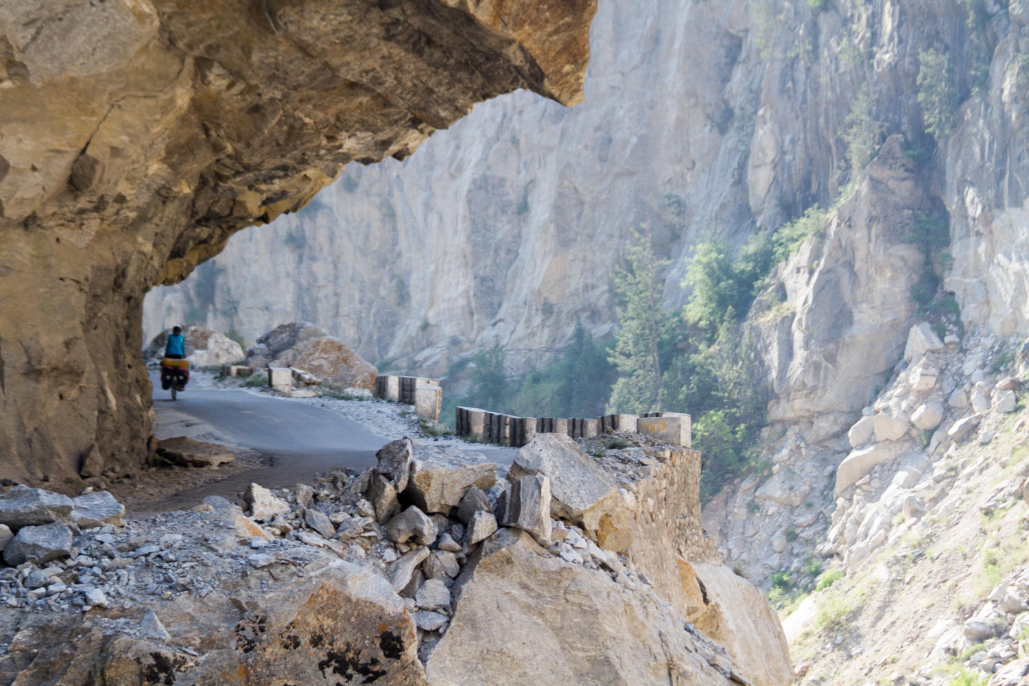There’s not much opportunity for food along this stretch. At Spillow, we stop for lunch of chow mien and have 24kms to go. We cycle along rocky canyon walls and have left behind the trees. The road varies, sometimes there are short sections of asphalt , then it is rocky, then broken asphalt. The last 7kms is more construction, one day this road will be much improved…at least until there is a landslide.