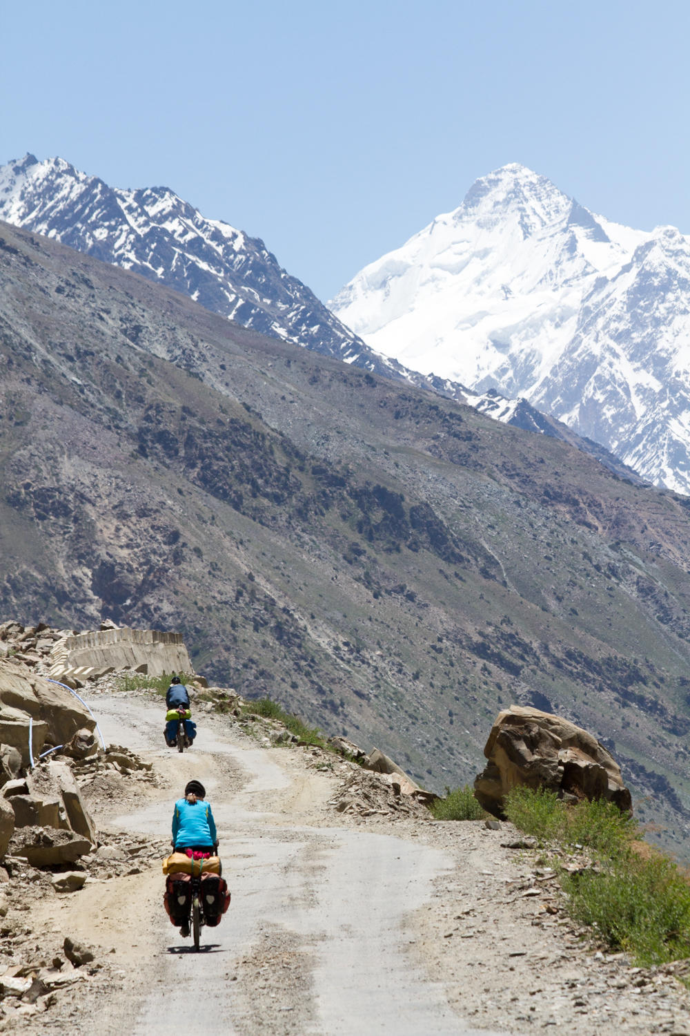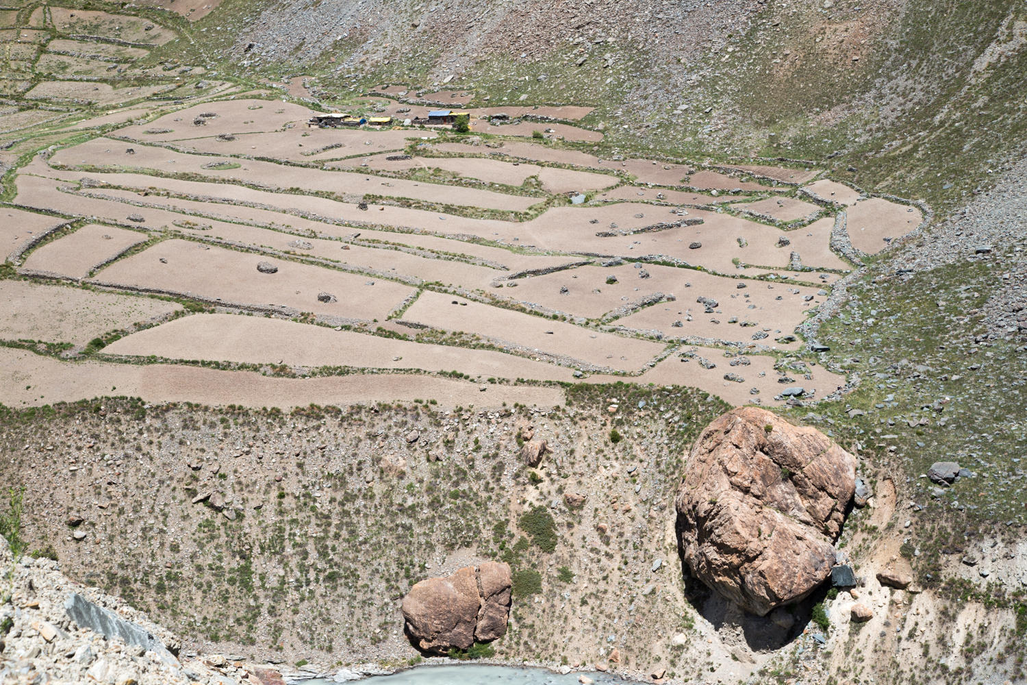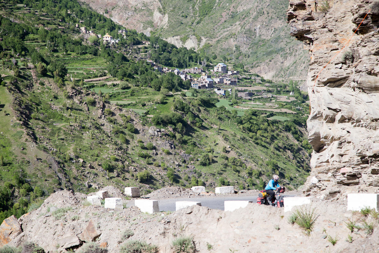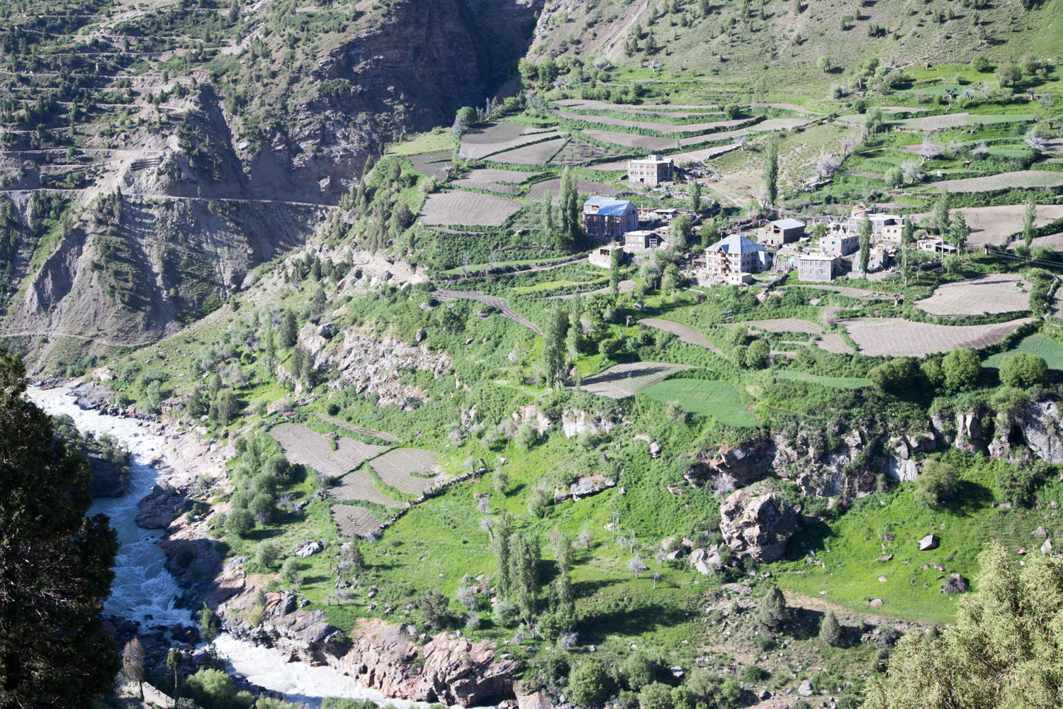 We are in no big hurry to leave the nice Tashi Deleg Hotel in Keylong. At least not until we have had one more large pot of coffee, some banana pancakes and eggs. At about 8:30 we make our way out of town. The lower road which passes through the town proper climbs up the valley to rejoin the main road. We are happy to find asphalt. The road slowly climbs for a while, past a few small villages with farmfields lining the river below.