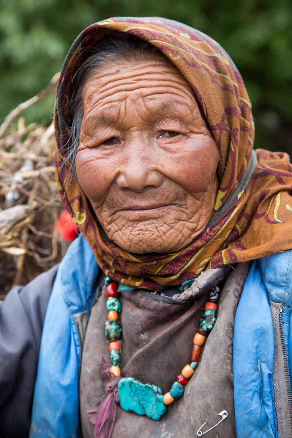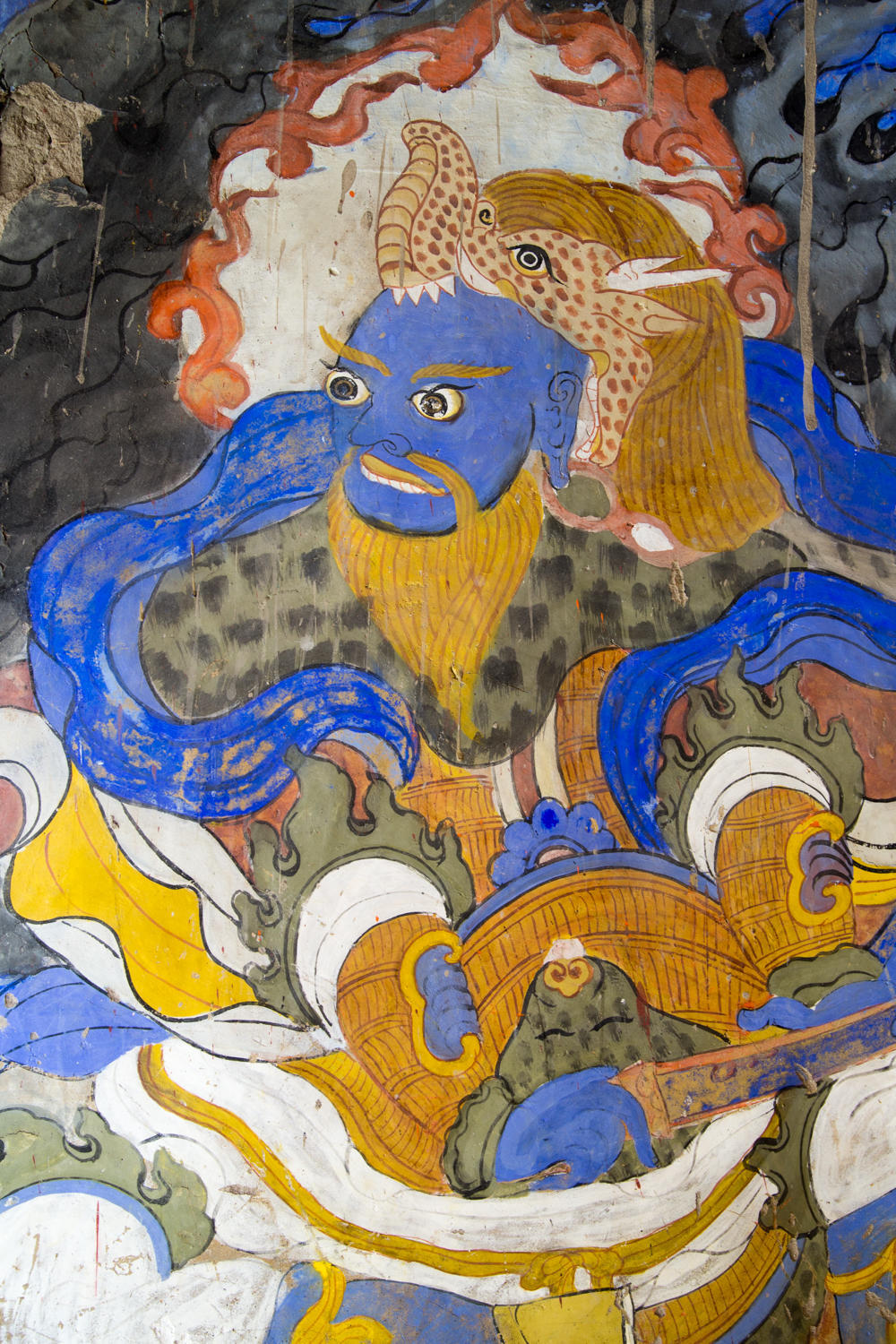 It rains most of the night again, in the morning the valley is filled with damp gray clouds and it rains. We’re lucky we got over the pass yesterday, because today there might be snow up there. We take it easy, no rush to get going in this weather. By about 8:00 it clears up a little and we hit the road. We’re mostly going downhill, the dampness and cold makes us put on just about all our clothes. The valley is beautiful with brightly colored rock faces, a raging chocolate milk river and small Tibetan villages. We see monasteries, lots of stupas and mani stone walls.