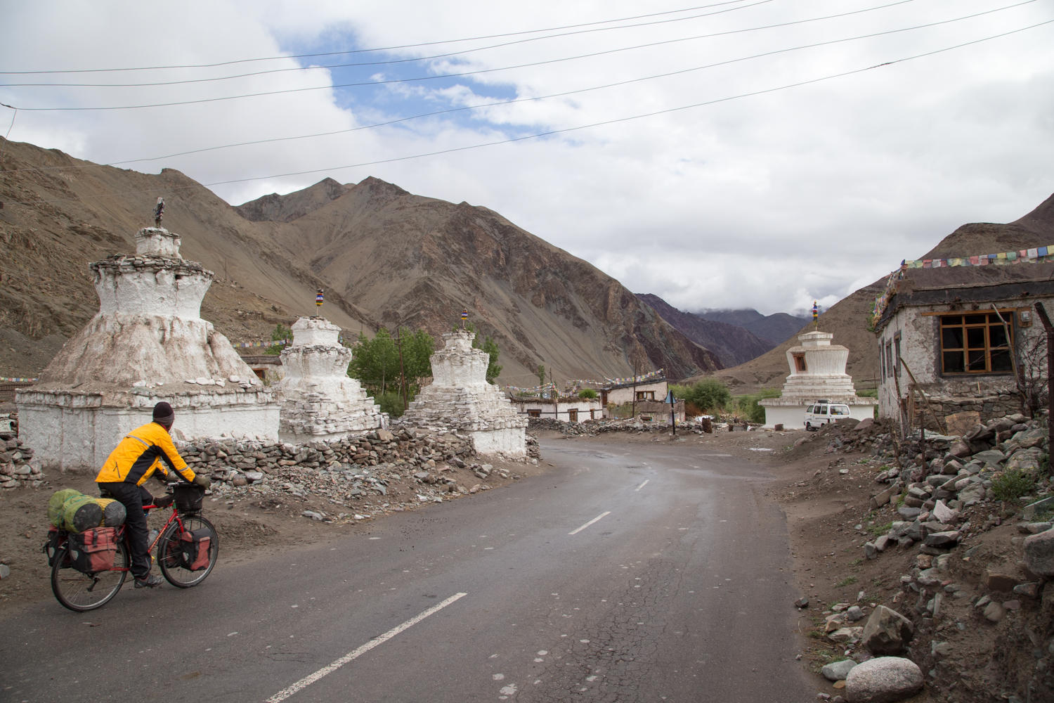 At Upshi we reach the Indus River which flows from its source near Mt. Kailash to the Arabian Sea in Pakistan. We meet up again with Dan who is much faster than us on the downhill, plus he doesn’t take photos. After a bread omelet we set off downriver. There are a few climbs and extensive military bases line the road. Traffic also picks up, we had almost forgotten about the crazy Indian drivers.